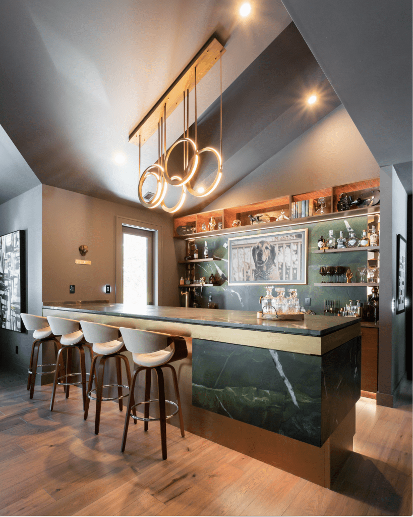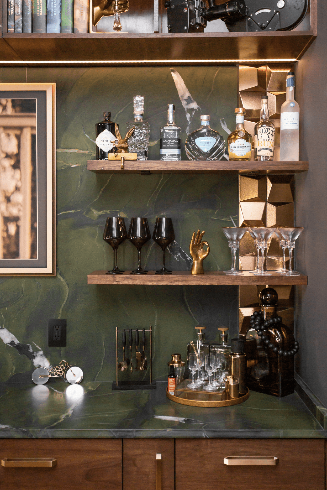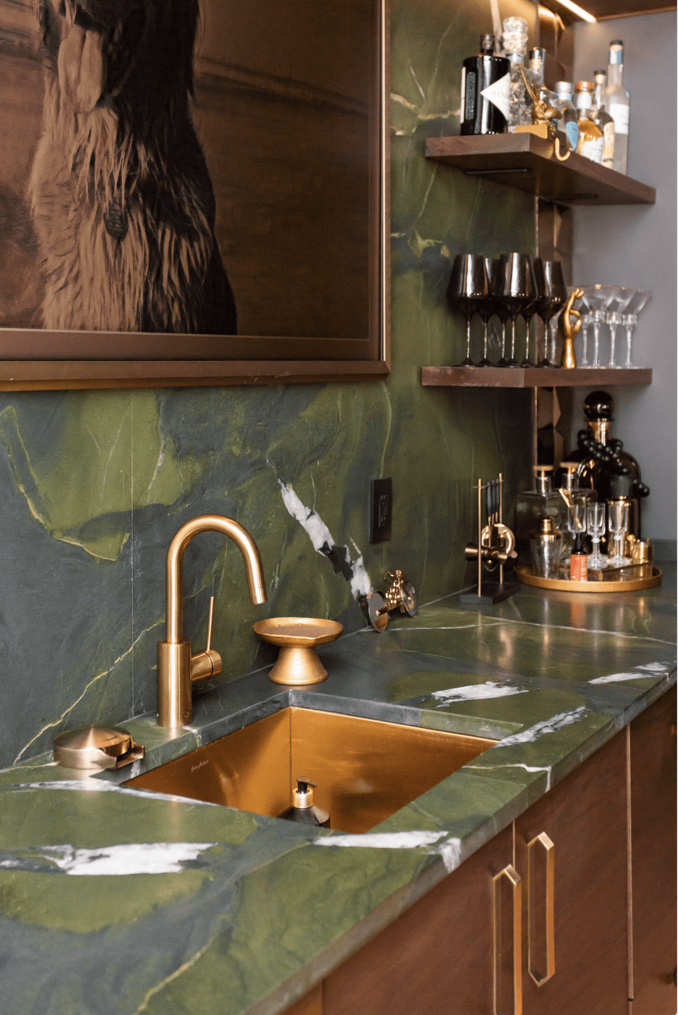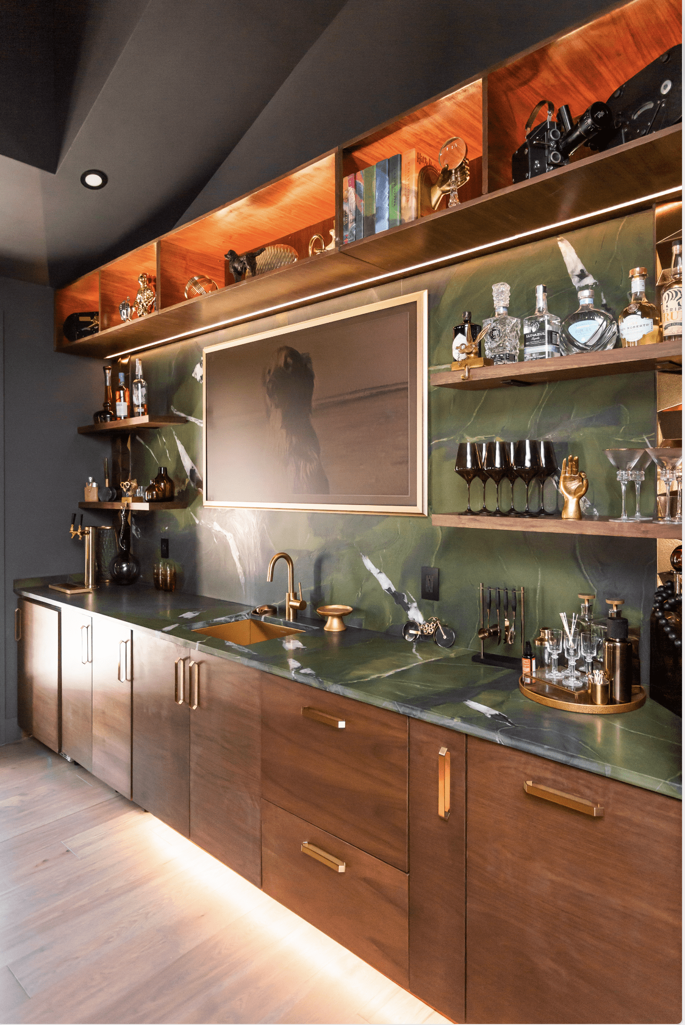 This project design doesn’t stop at stone. Framed by custom open shelving and warm metallic tones, the space also includes a striking personal detail: a portrait of the homeowners’ beloved dog, cleverly incorporated into the center of the bar’s back wall. It’s a stylish nod to the couple’s personality and a heartwarming conversation piece that perfectly complements the bold materials. “In-home bars have grown in popularity and are a serious conversation piece for homeowners who love to entertain,” says Melanie Richardson, Branch Manager at AGM Imports. “My favorite part of this project was seeing everything come together in the end and how happy the clients were with the finished project. I also love how they incorporated their sweet doggy into the project—the perfect final touch. They are enjoying their countertops as it has become quite the conversation piece,” she adds.