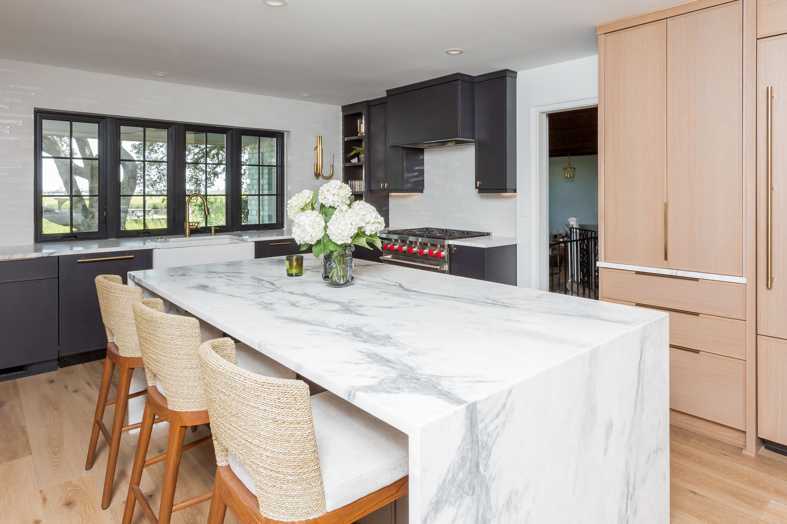 Waterfall-edge island fabricated by Palmetto Surfacing with Mont Blanc marble sourced from Charleston Cosmos Granite & Marble.
