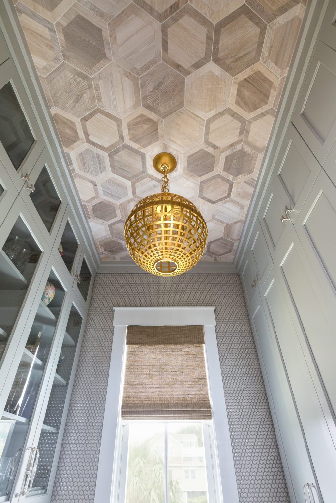 Ceiling tile is a great way to make your space stand out. These unique hexagonal tiles draw the eye upward and even make the ceiling look taller. The crisscrossing of the grain in the tile and the various hues make this ceiling hard to look away from. You might consider a tile like this in an entryway or mudroom.