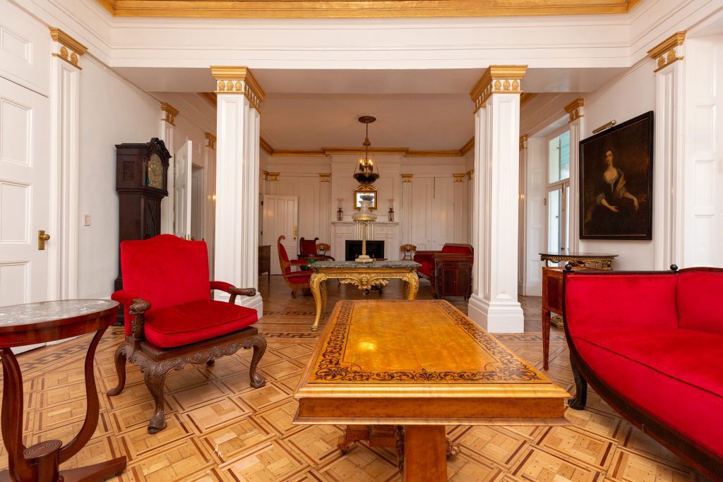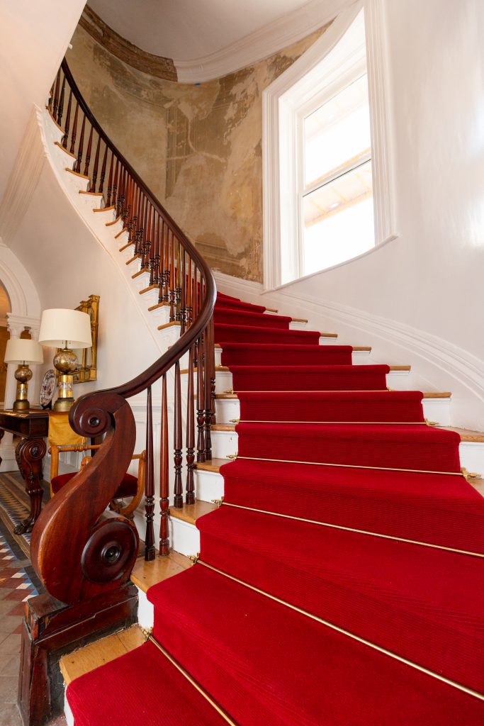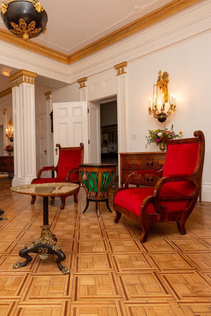 The Grand Parlor showcases bright red antique furniture to contrast the white walls. This furniture and many other antiques are from David Skinner Antiques. These pieces are unique to Charleston and other places around the world. A spiral staircase runs up all four stories of the home. One of the oldest pieces in the house is the decorative handrail.
