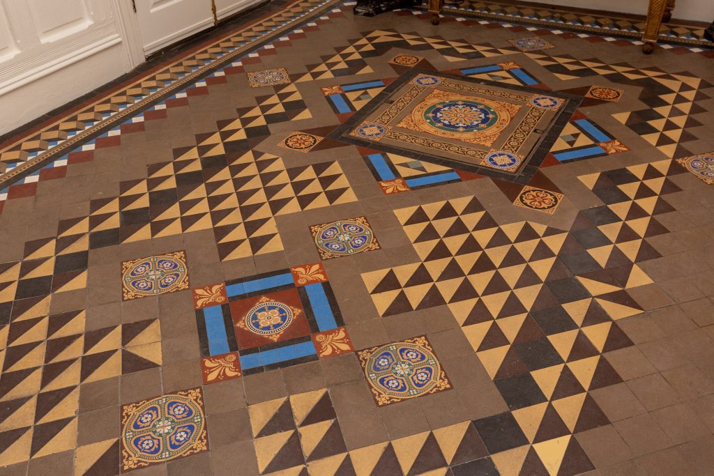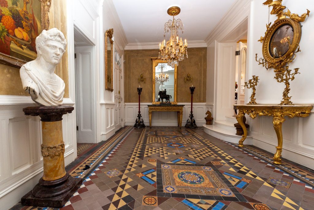 In order to properly restore the original Italian Mosaic tile flooring seen in the hall, the contractors removed the tile one by one so they could repair it piece by piece. Guests will also find crown molding and marble fireplaces that are unique to each space. Metal tile ceilings, ornate chandeliers, and antique sconces are also a common element throughout the home.
