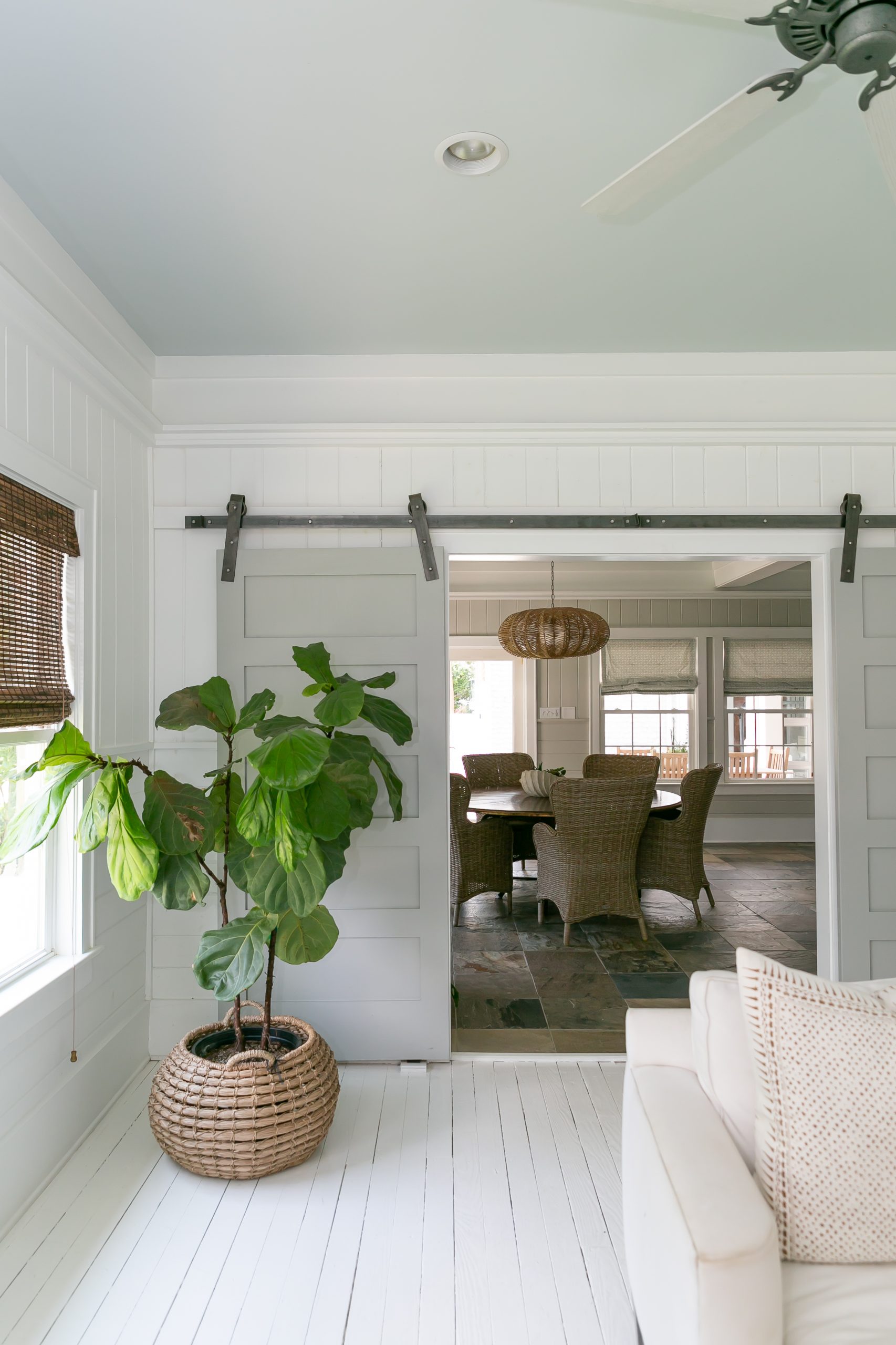 One of the most used spaces in the entire home is the outdoor area which serves as a gathering place for guests. There’s a space for lounging by the pool, eating a family meal outside, and curling up to watch a movie outside. The exterior of the home is finished with a shingle siding often seen in New England. A shiplap ceiling adds the coastal charm, perfectly marrying the two styles.