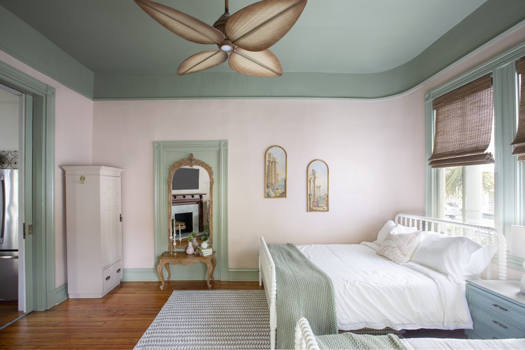 The whimsical touches mentioned above can be seen in this guest room with two full size beds. The ceiling fan, artwork, and vintage mirror add to that playful ambiance the team was going for. The space also showcases some of that original charm in the molding.