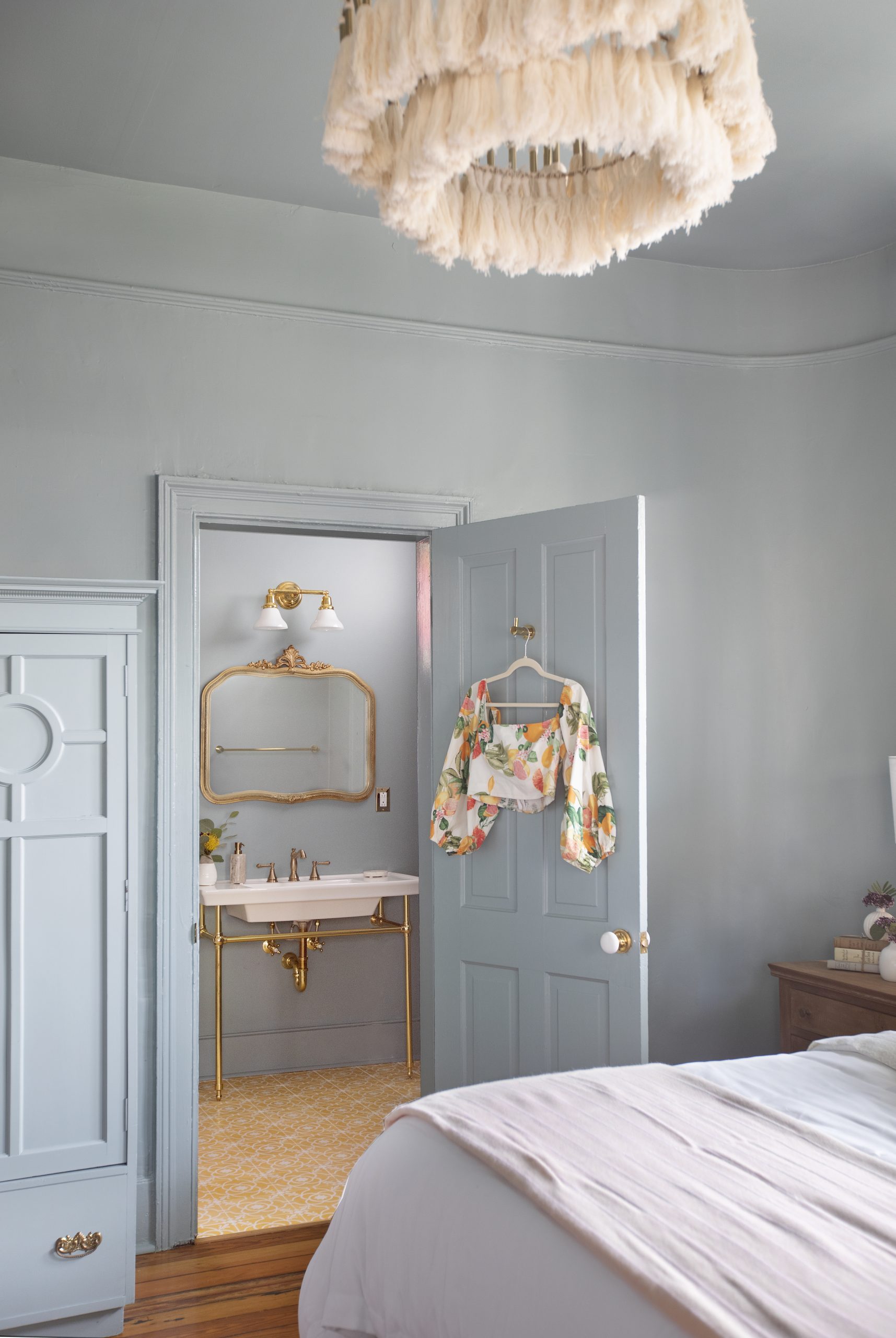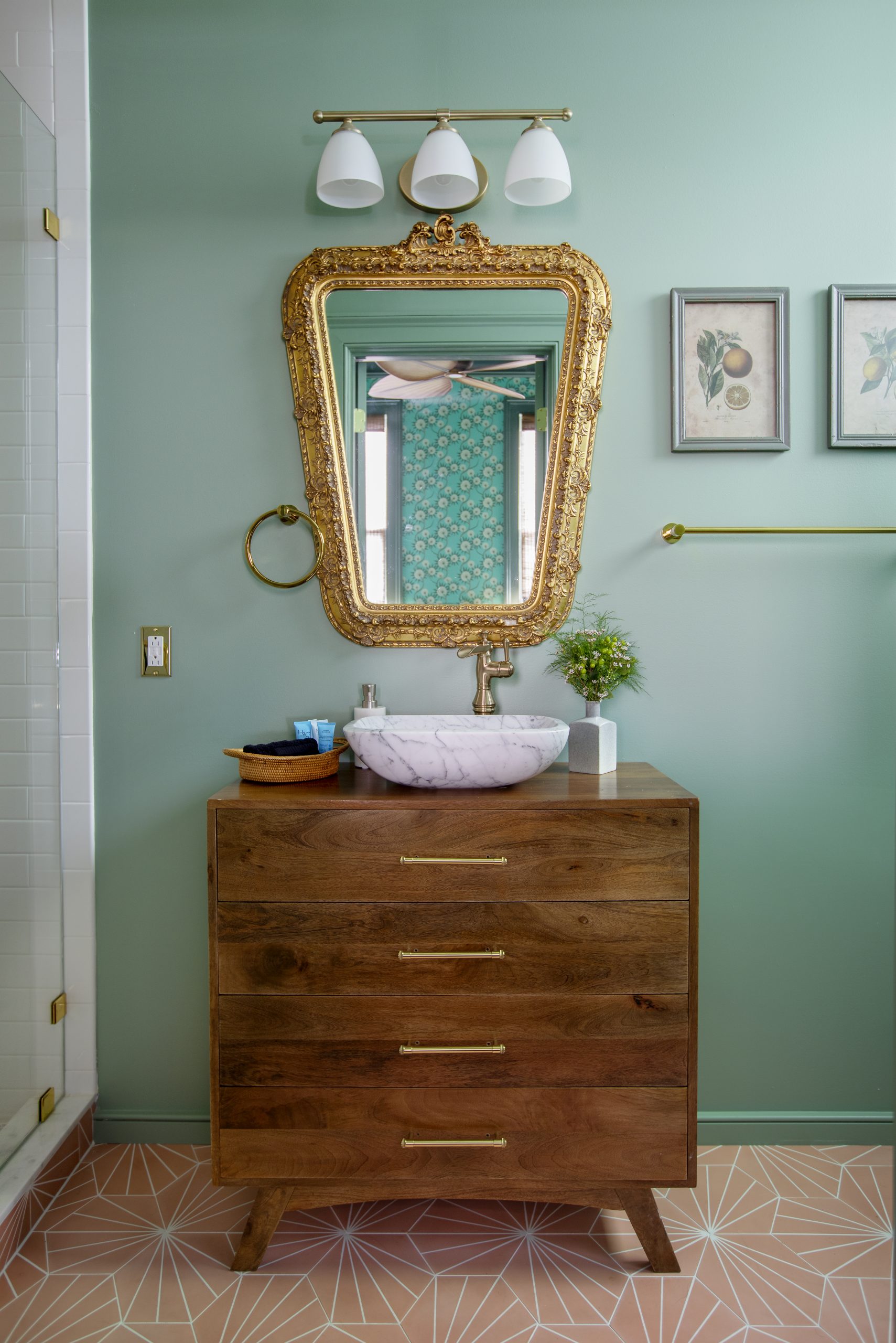 This bathroom is so stunning; it coordinates with the bedroom without being too matchy. A similar blue/green shade highlights the wall while a pop of pink tile brightens the floor and shower wall. A marble sink an antique gold mirror give the bathroom a more glamorous touch.