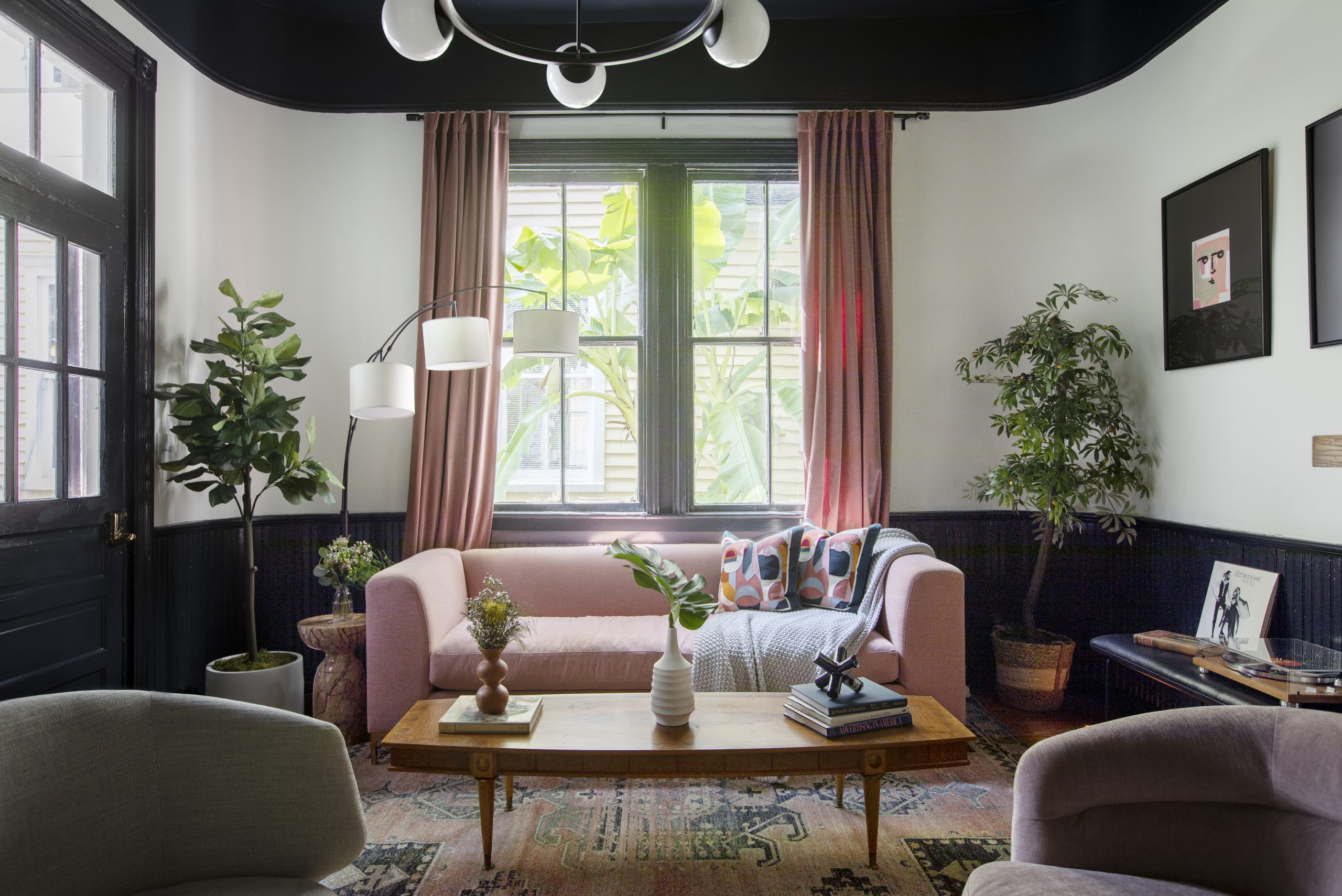 This living room is so dreamy. A cozy couch and swivel chairs beckon to be curled up in to listen to a record or watch a movie during a night in. Again, the goal was to highlight the original elements of the home so the wainscoting, doors, built-ins, and ceiling were painted a deep blue to add some drama and make those elements pop.