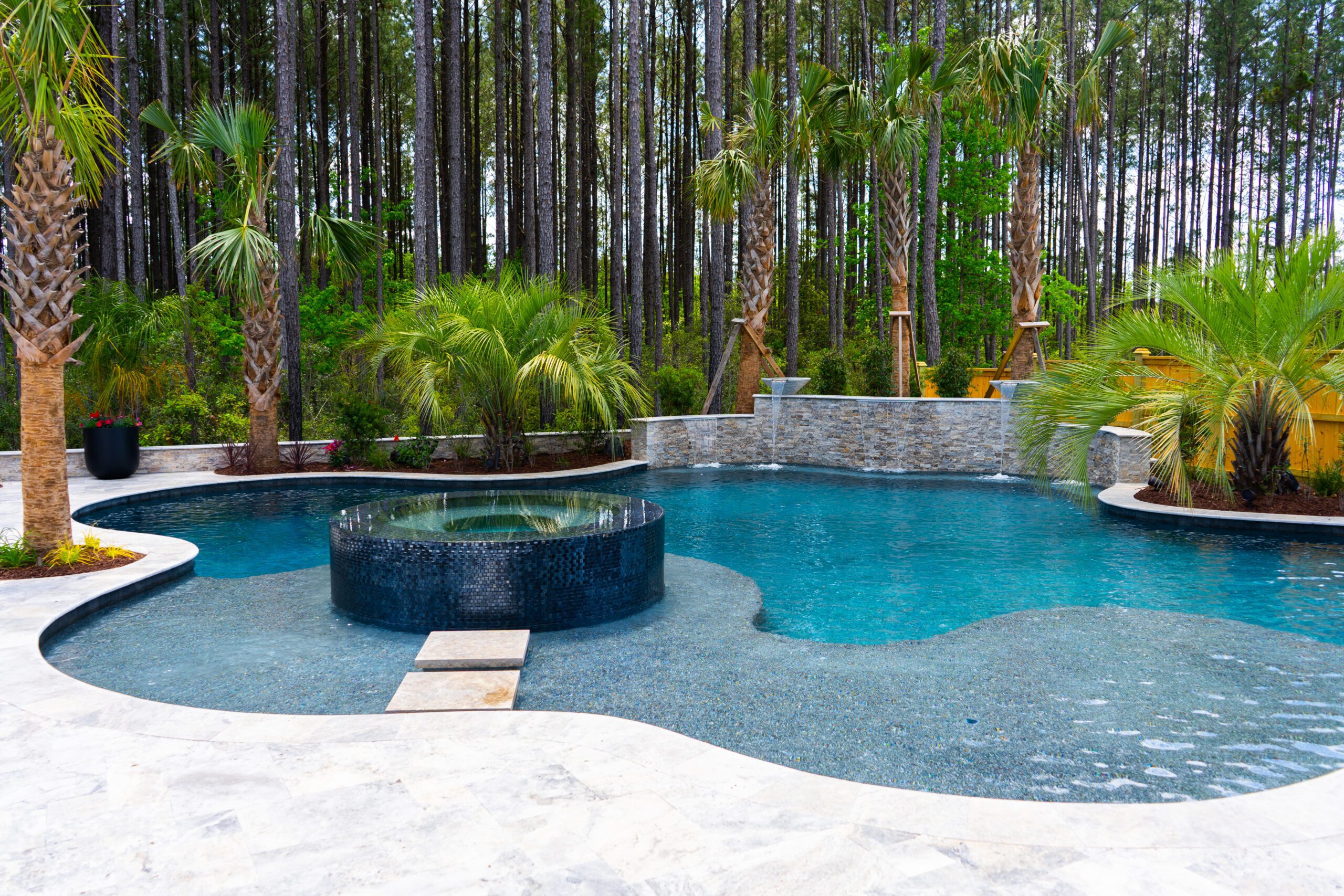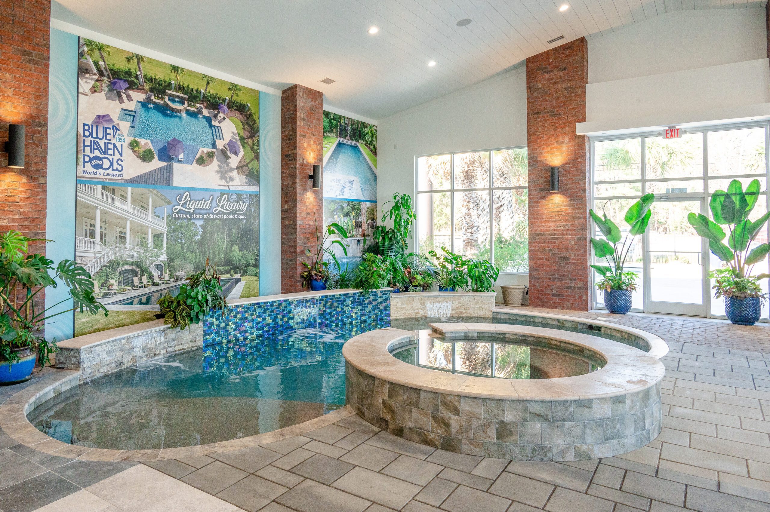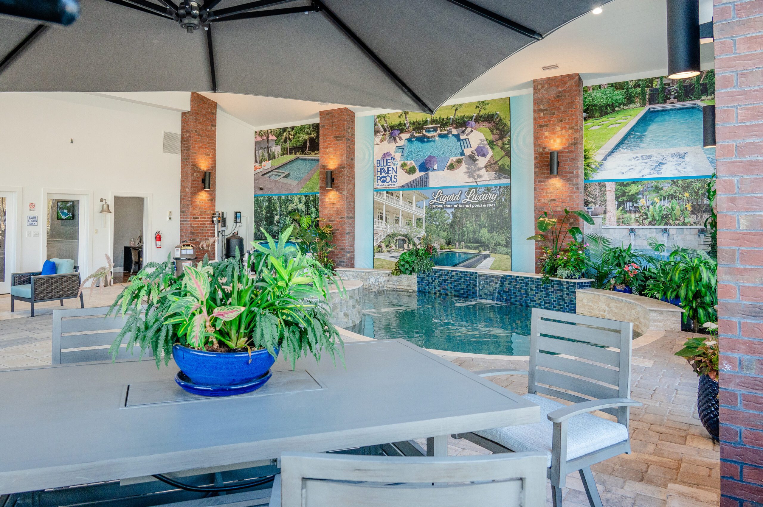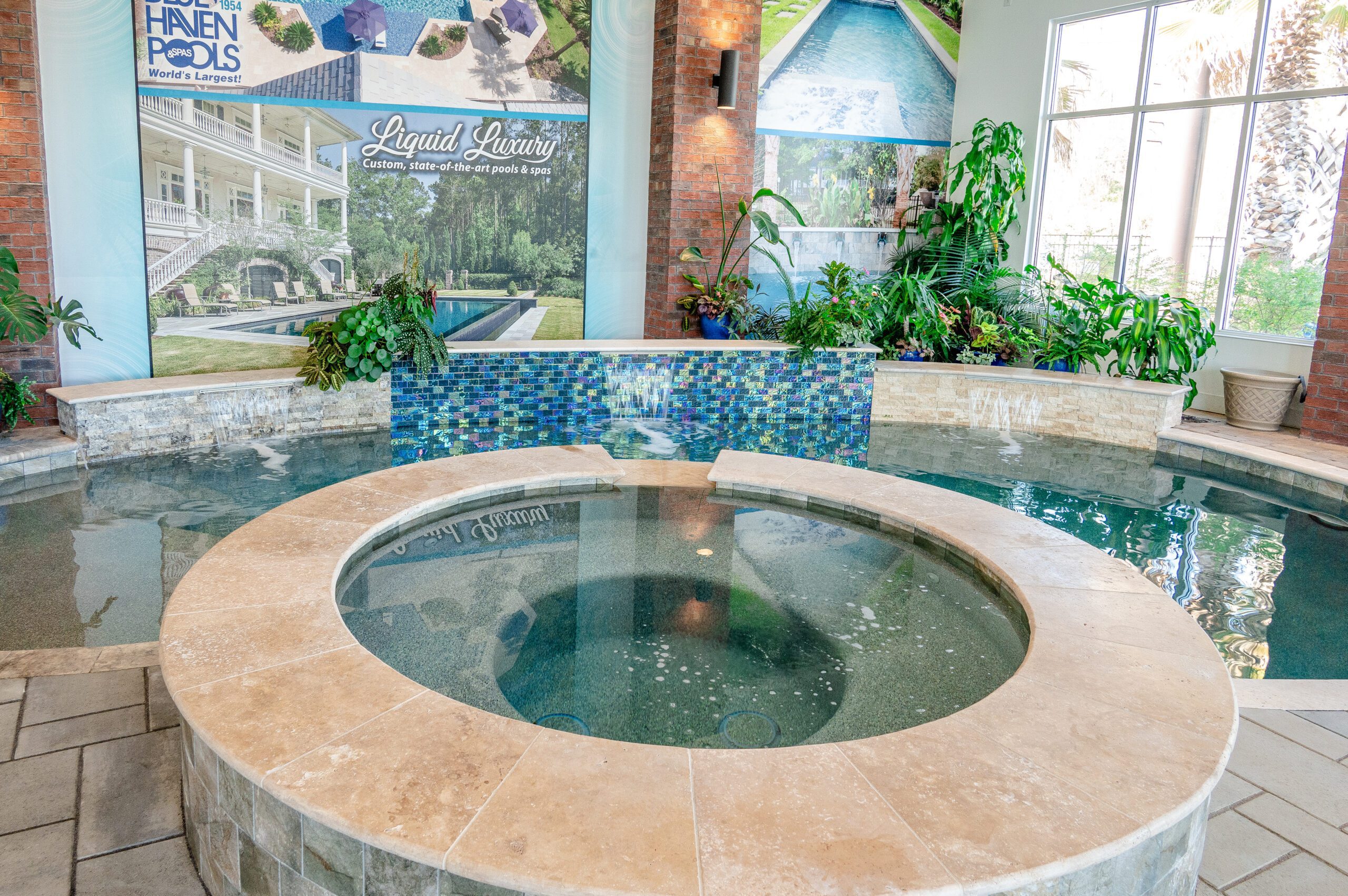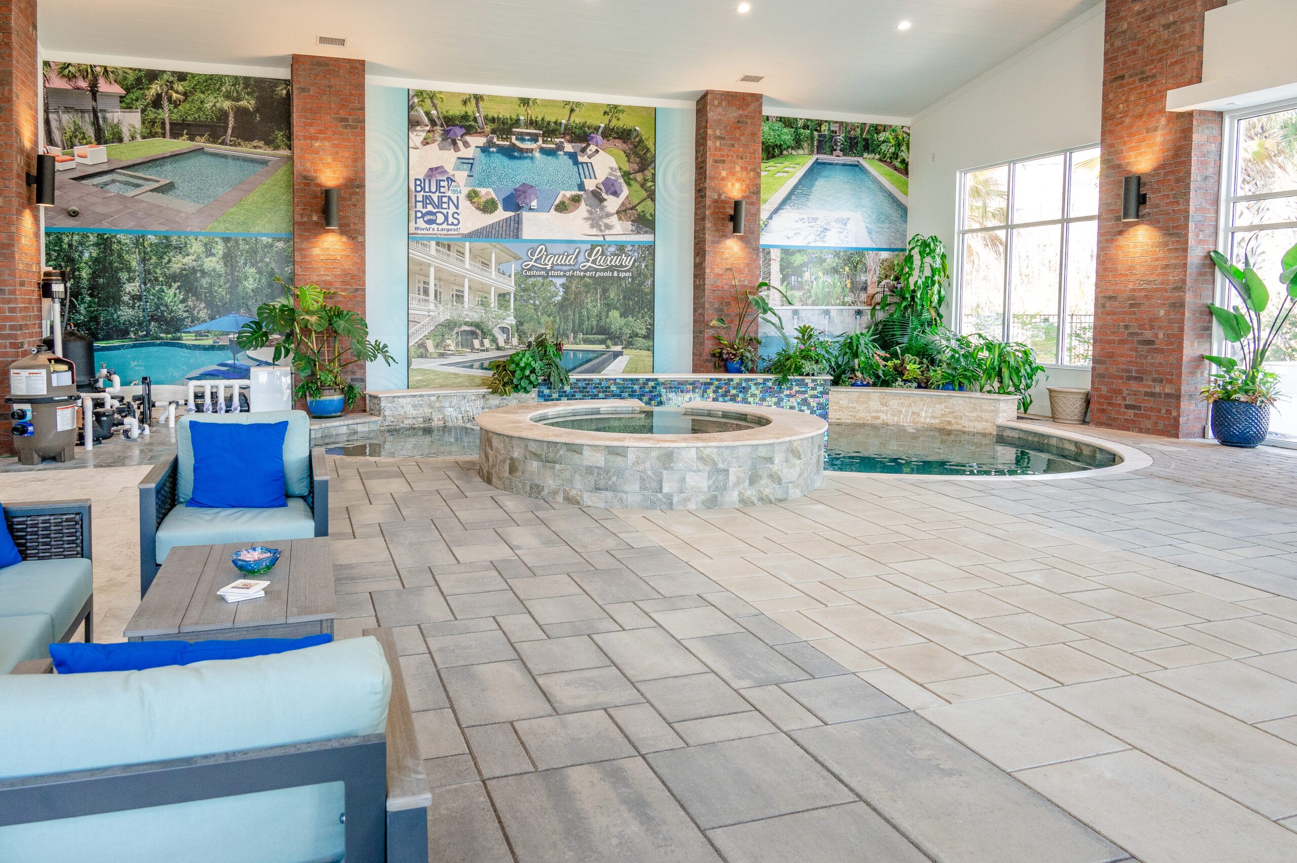 At the Blue Haven Pools & Spas showroom, there are three fully functional display pools on-site with one being inside the showroom showcasing a custom spillover spa. Homeowners will find other features on display like multiple colors of travertine, limestone, French limestone, and many marble decking options. To make it easier for their customer’s to visualize how a finished product will look like, each on-site pool has glass tile and veneer stone already installed. Blue Haven also highlights their fire pit seating walls selection along with a custom fireplace built on-site.
