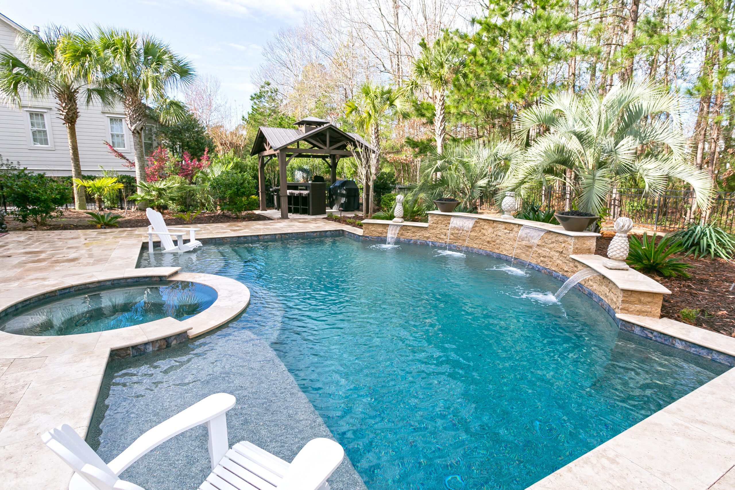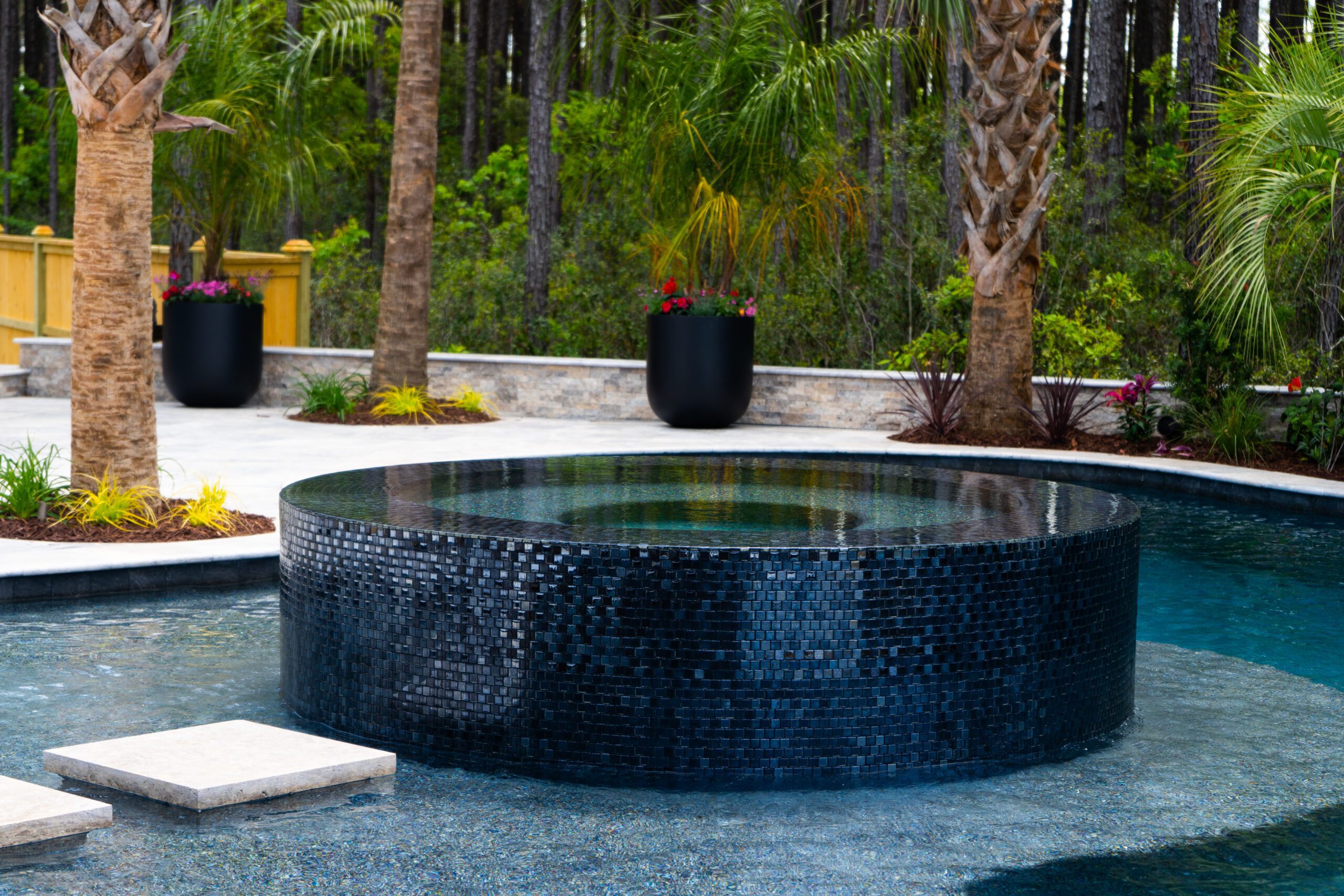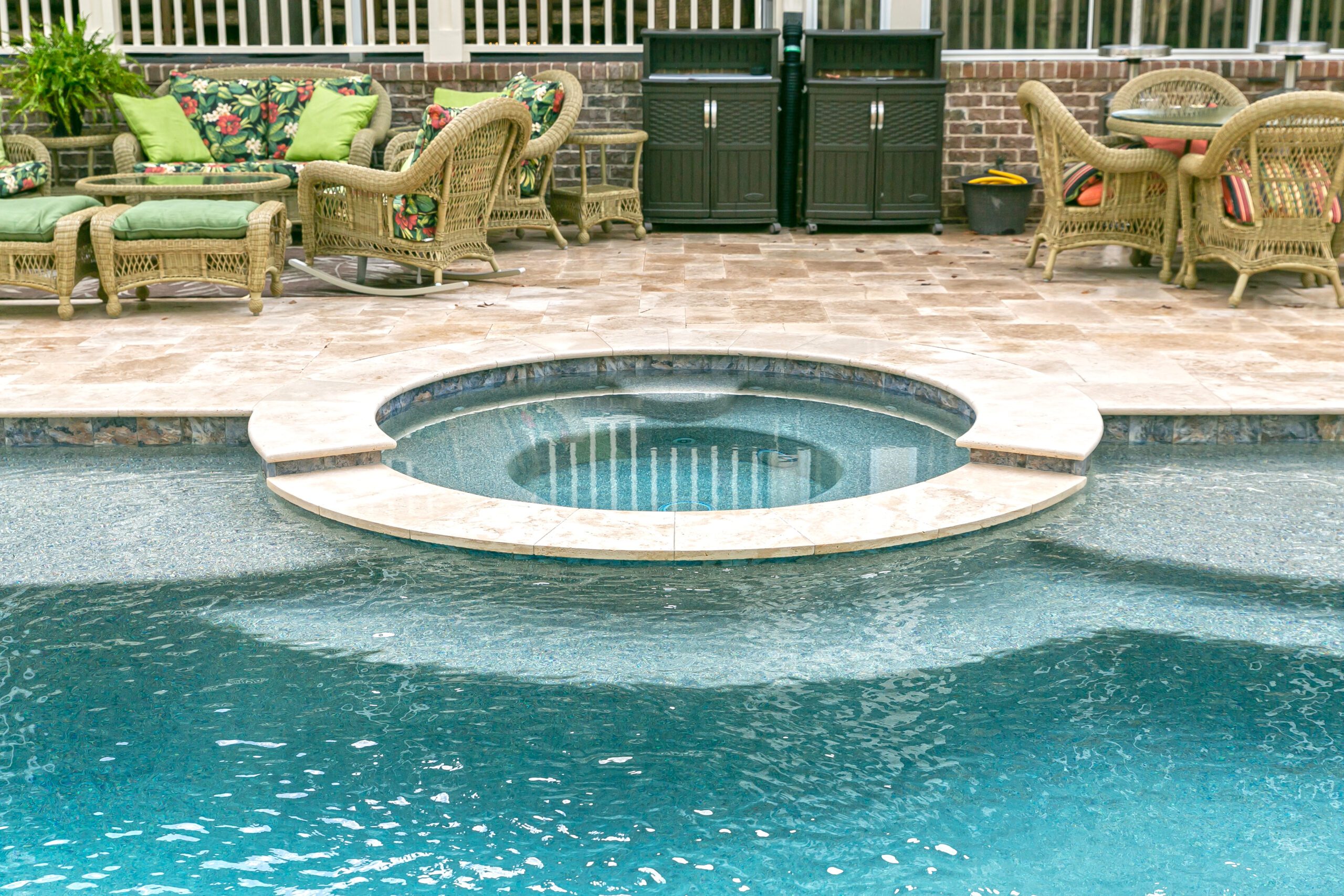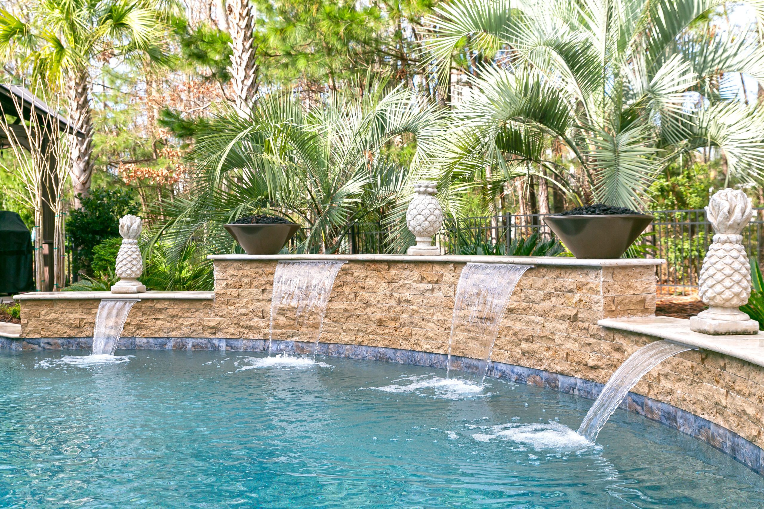 At the Blue Haven Pools & Spas showroom, there are three fully functional display pools on-site with one being inside the showroom showcasing a custom spillover spa. Homeowners will find other features on display like multiple colors of travertine, limestone, French limestone, and many marble decking options. To make it easier for their customer’s to visualize how a finished product will look like, each on-site pool has glass tile and veneer stone already installed. Blue Haven also highlights their fire pit seating walls selection along with a custom fireplace built on-site.