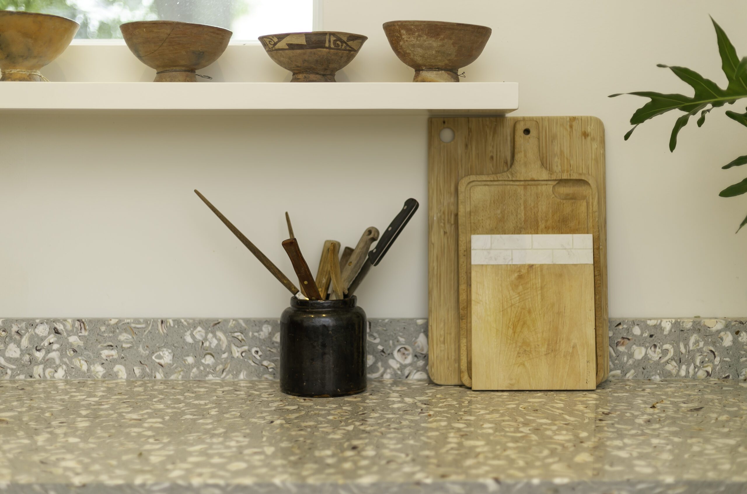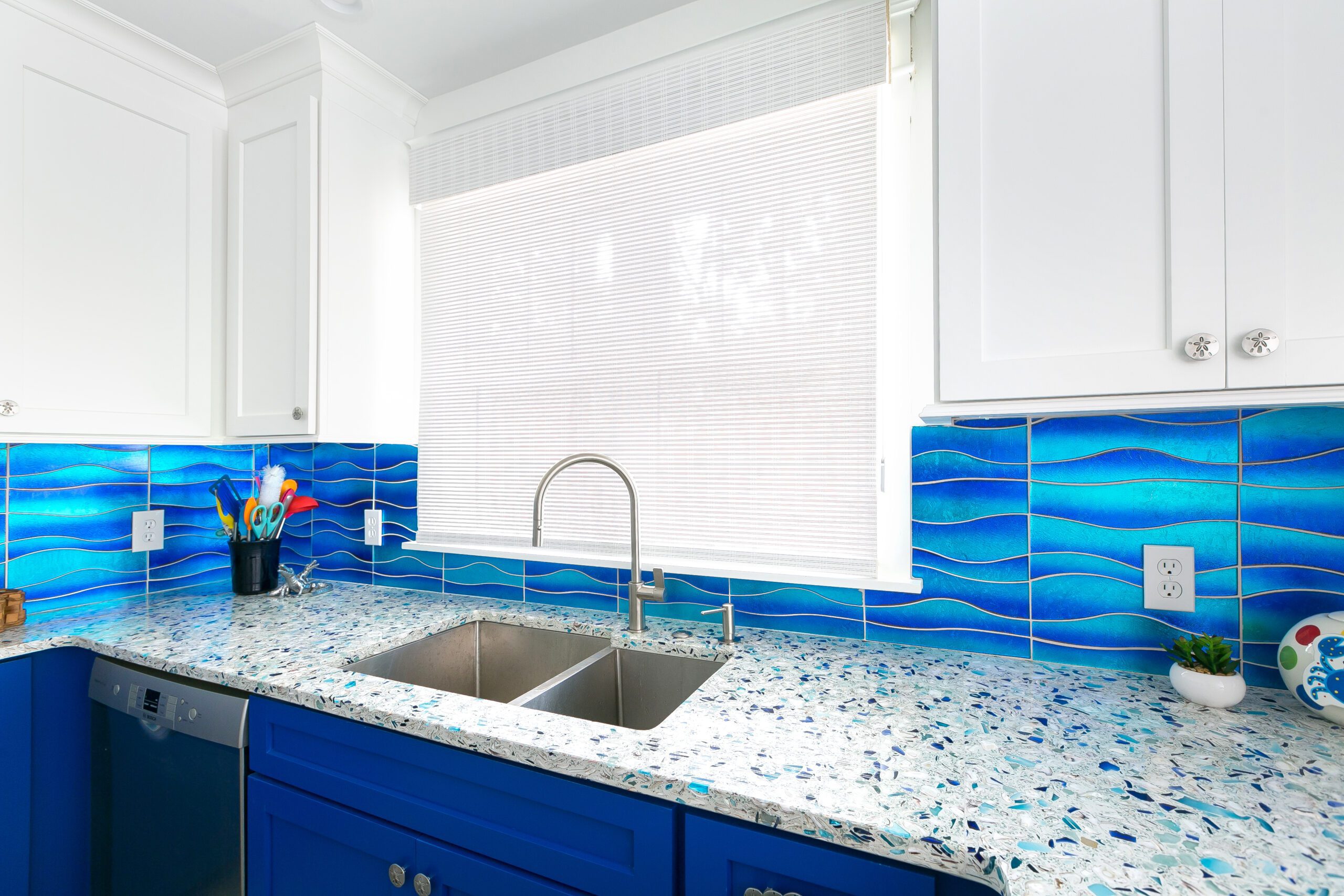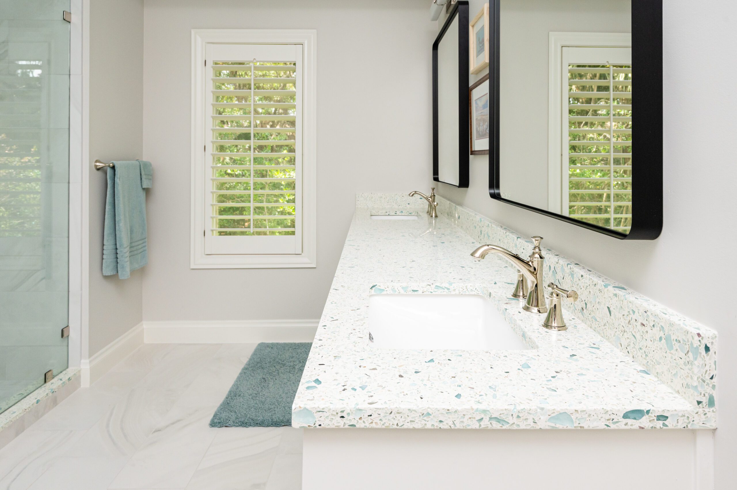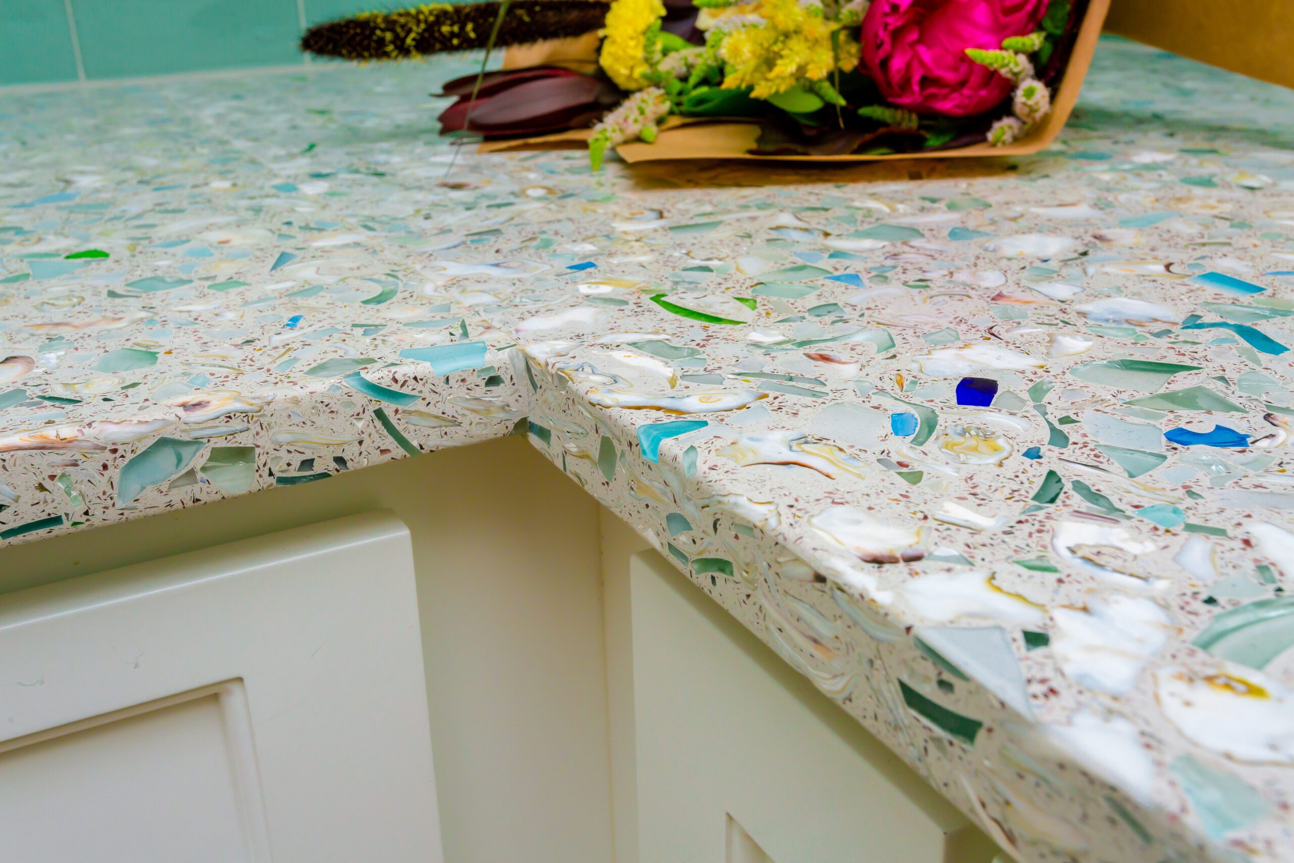 GlassEco Surfaces explores the beauty of reusing timeless material and their fabricators implement a sustainable narrative for surfaces designed to last. Choose your own design from existing combinations or bring your own treasures like shells and sharkâs teeth to mix into your own personalized countertop surface blends of sea glass, recycled liquor bottles, and even oyster shells. Pairing things together in interesting ways, casual easy living and sustainable designs inspire these eco-friendly blended surfaces.