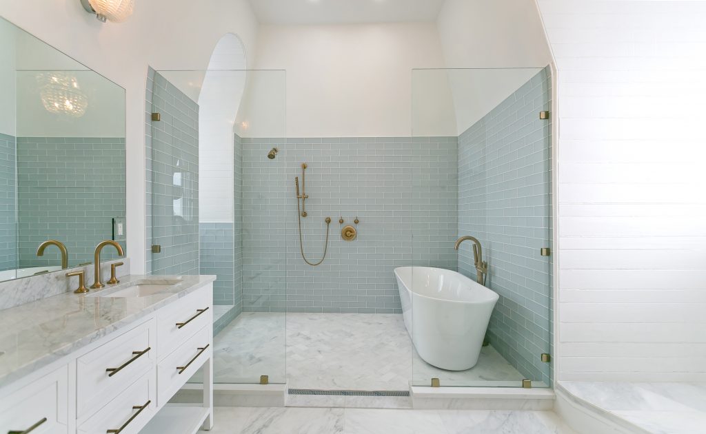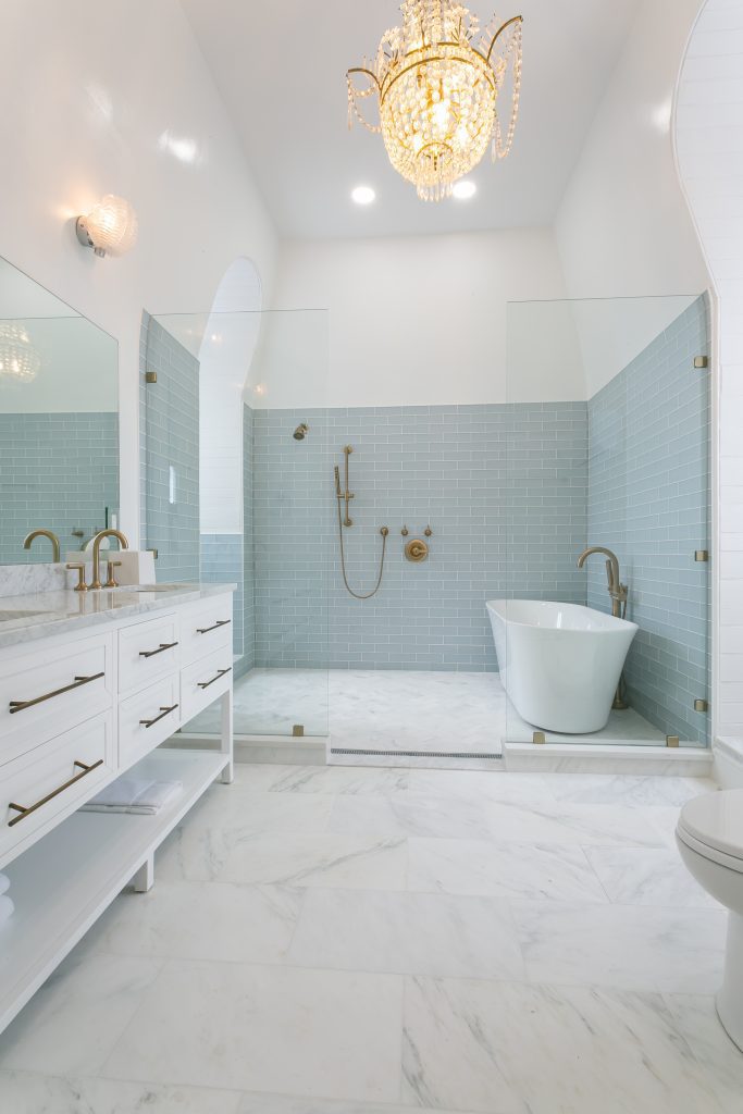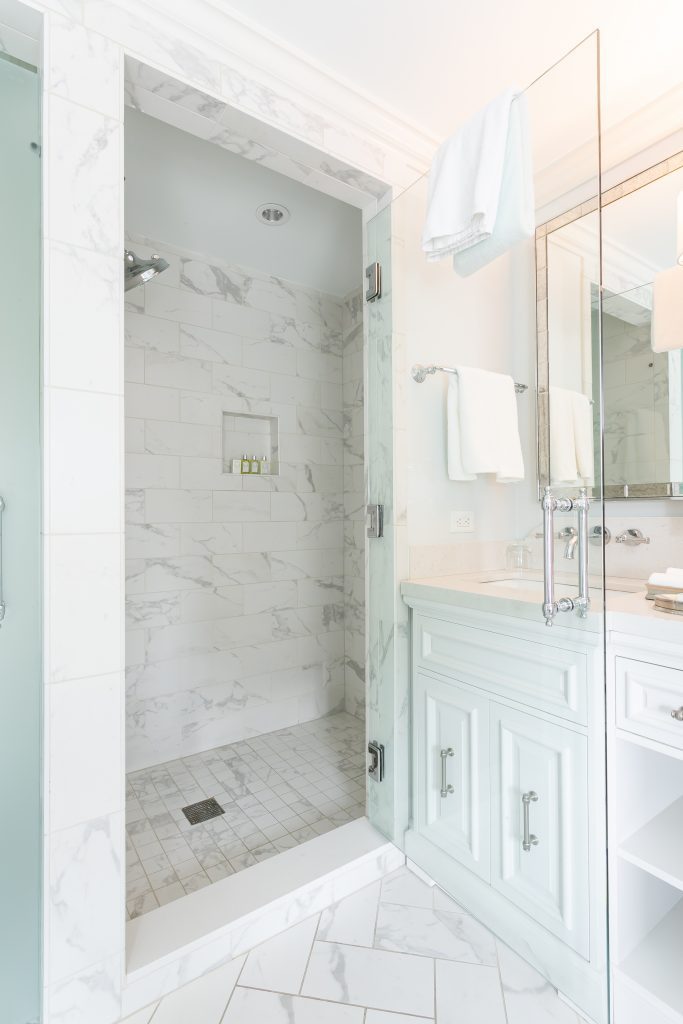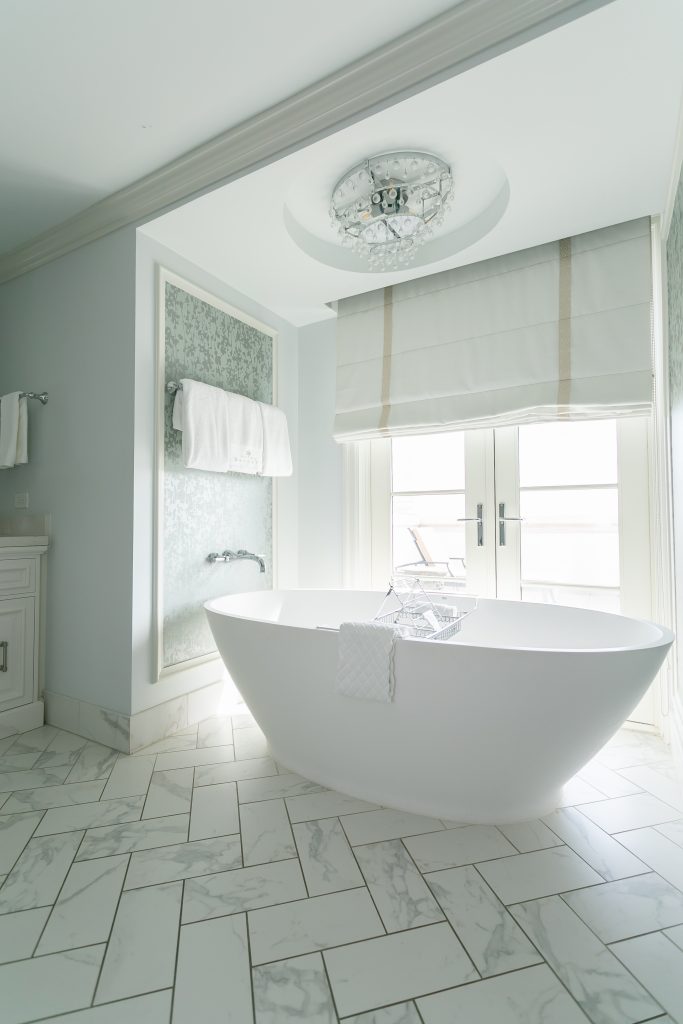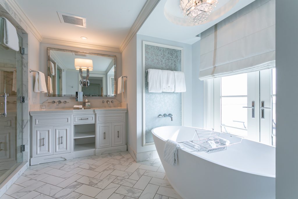 It happens frequently; you stay at a beautiful hotel and dream of having that same relaxing, luxurious ambiance in your own home. In the spring issue of Charleston Home + Design magazine we highlighted seven local hotels with stunning bathrooms. We worked with advertisers you’ll see in the magazine to find products to help you recreate these bathrooms at home. You can see those products in the print version. We’ll give you a bit more insight into the design of these beautiful bathrooms. We encourage you to support our local hotels and book a fun staycation. Some have locals only deals so be sure to ask!