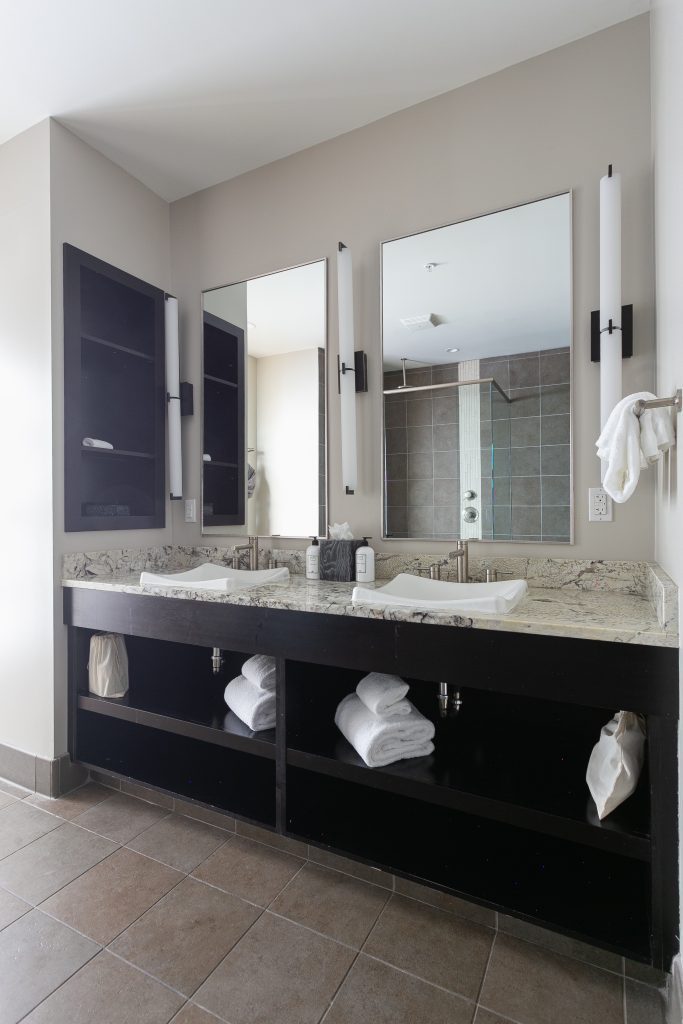 The art-deco Spectator Hotel spares no cost in making guests feel at home. Bathrooms complete with oversized double vanities, heated towel racks, soaking tubs, and more give guests plenty of opportunities to stay in and take a moment for themselves to reset and feel rejuvenated.