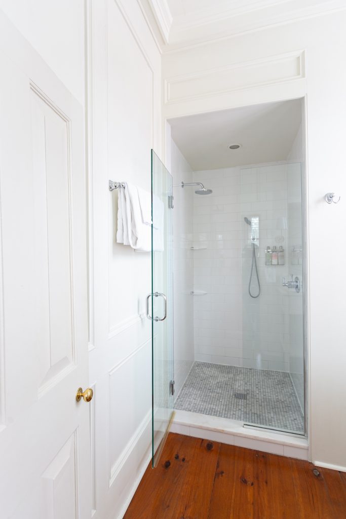 20 South Battery features a combination of historic features with modern updates. The 11 suites honor the history of the 1843 private mansion turned luxury boutique hotel, while each of the bathrooms offer a more modern ambiance. The Penthouse Mansion Suite on the top floor of the hotel features this stunning bathroom with a wet room and views of the Holy City. Natural light pours in from the original windows adding to the luxurious feel of the space.