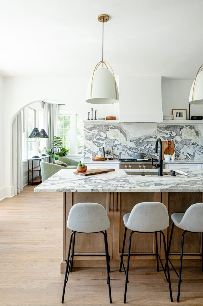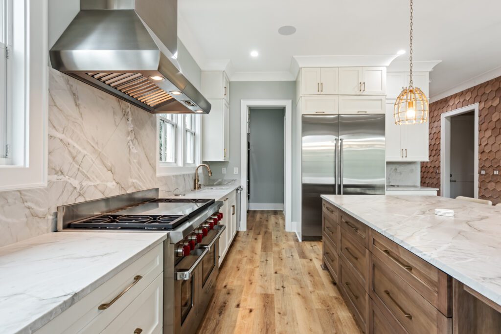 Counter-splashes are the latest trend in kitchen design and we are not mad about it! This design involves the installation of a striking stone pattern that carries along the range wall and onto the countertops. Popular counter-splash materials include marble, quartz, and porcelain depending on your desired look and budget.