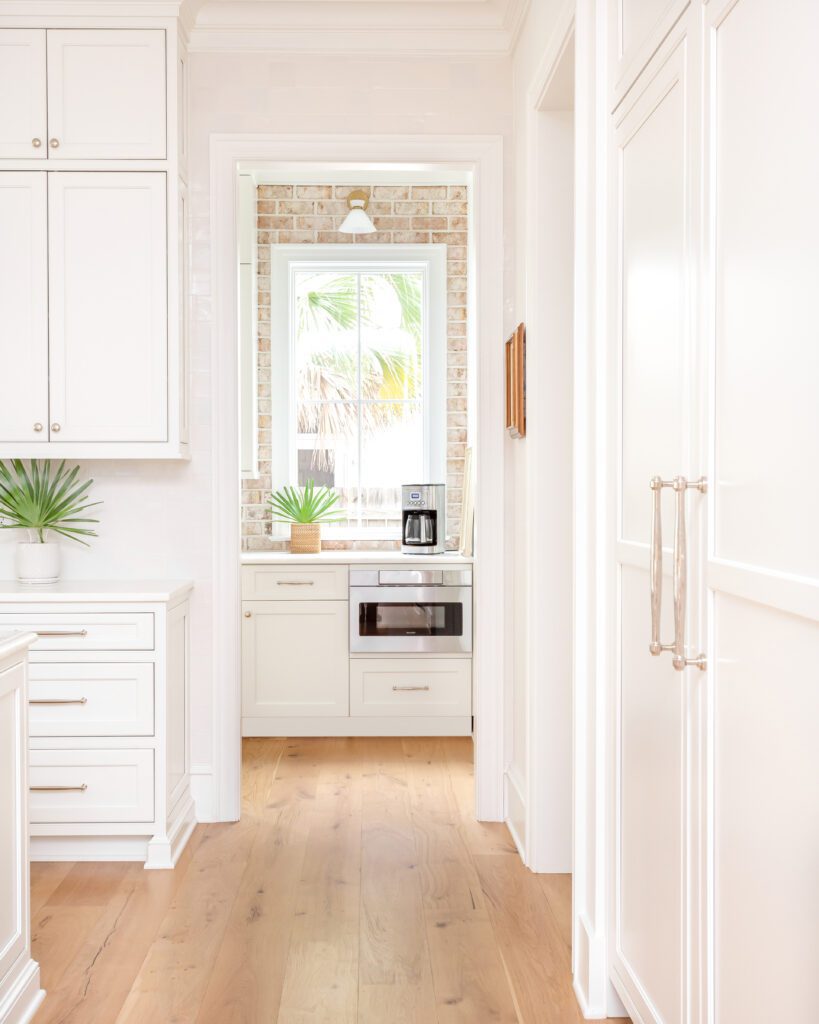 Custom shaker-style appliance panels conceal the home’s refrigerator in the main room and lead to an even more functional prep space behind the range wall.