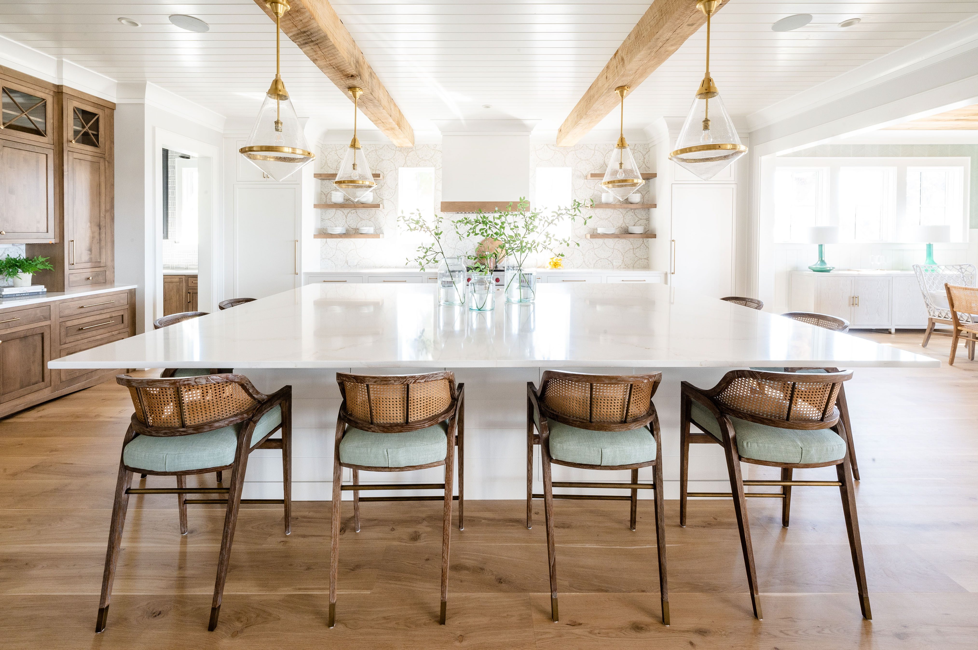 A large island instantly invites people to gather. In entertaining-focused kitchens, designers extend island depth and length to support comfortable seating rather than quick perches.