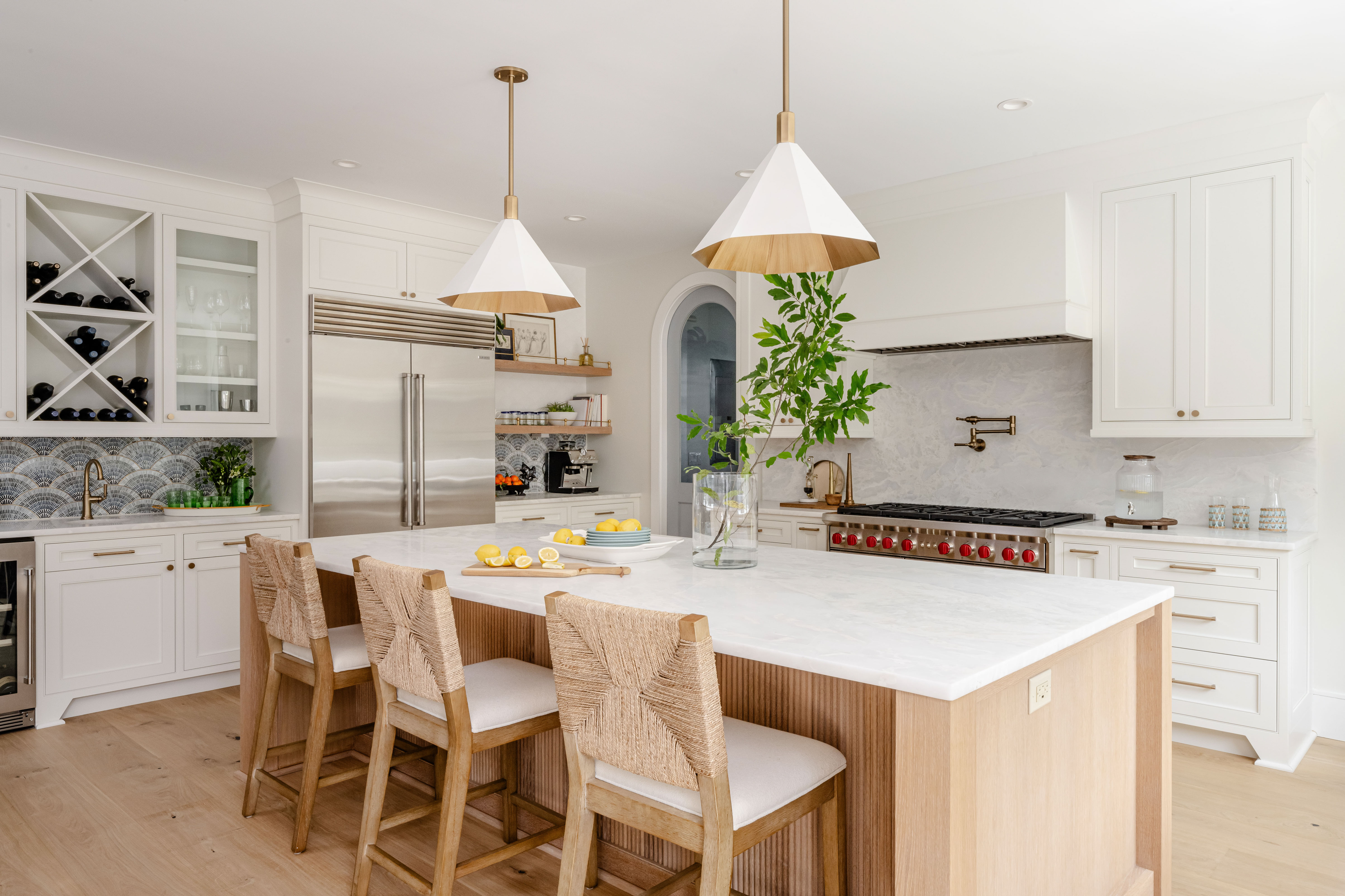 Bar-forward kitchens prioritize entertaining over meal prep. These layouts incorporate wine storage, beverage refrigerators, ice makers, and wet bars directly into the kitchen design. Seating encourages guests to linger, while layered lighting allows the space to transition easily from daytime use to evening hosting. This layout suits cocktail parties and casual gatherings where conversation takes center stage.