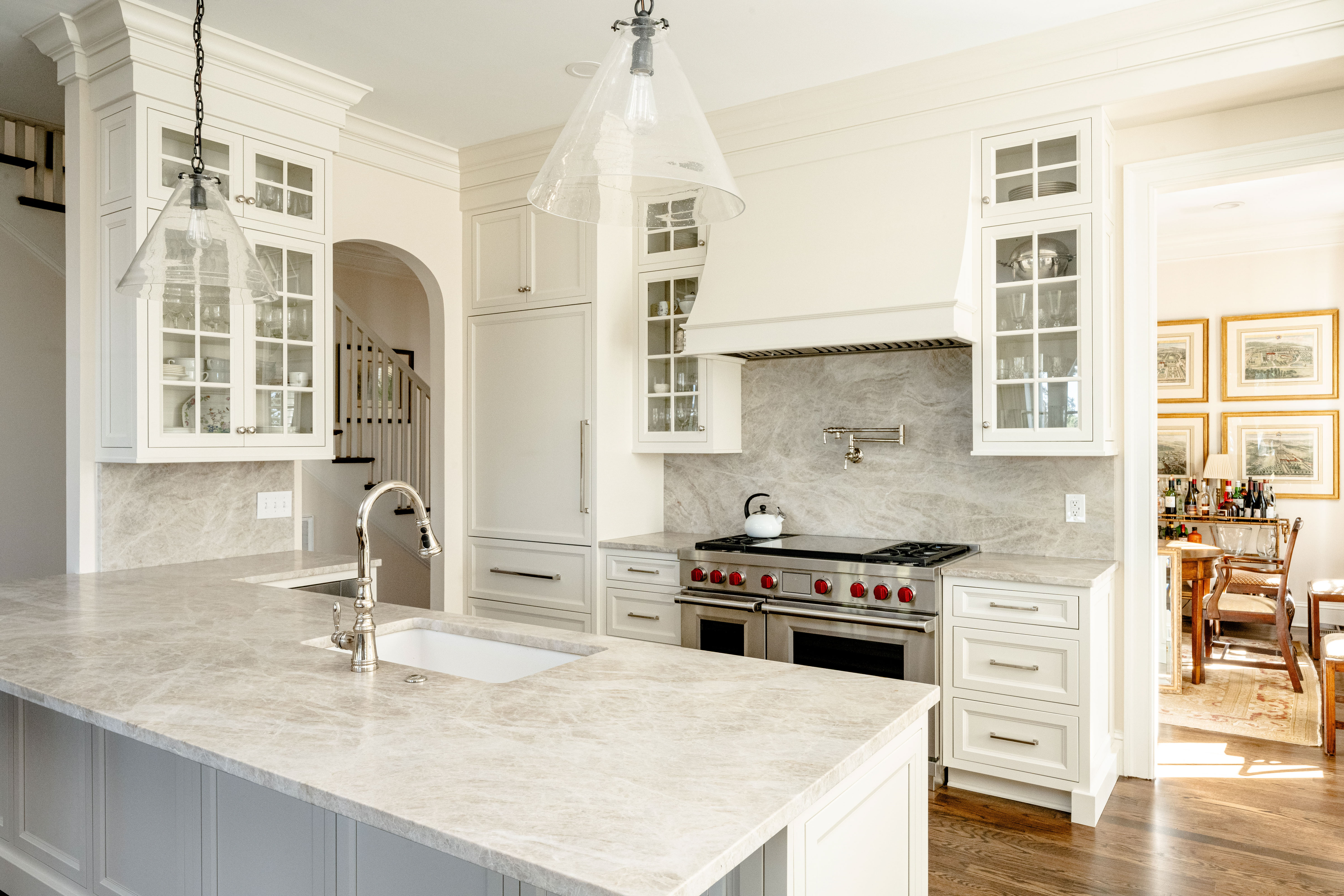 In homes with multiple gathering spaces, designers often place the kitchen at the center. These layouts connect directly to dining rooms, living areas, and outdoor spaces, keeping guests circulating throughout the home. Because the kitchen remains visible from multiple vantage points, designers focus on cohesive cabinetry, balanced proportions, and architectural lighting. The result feels intentional and welcoming from every angle.