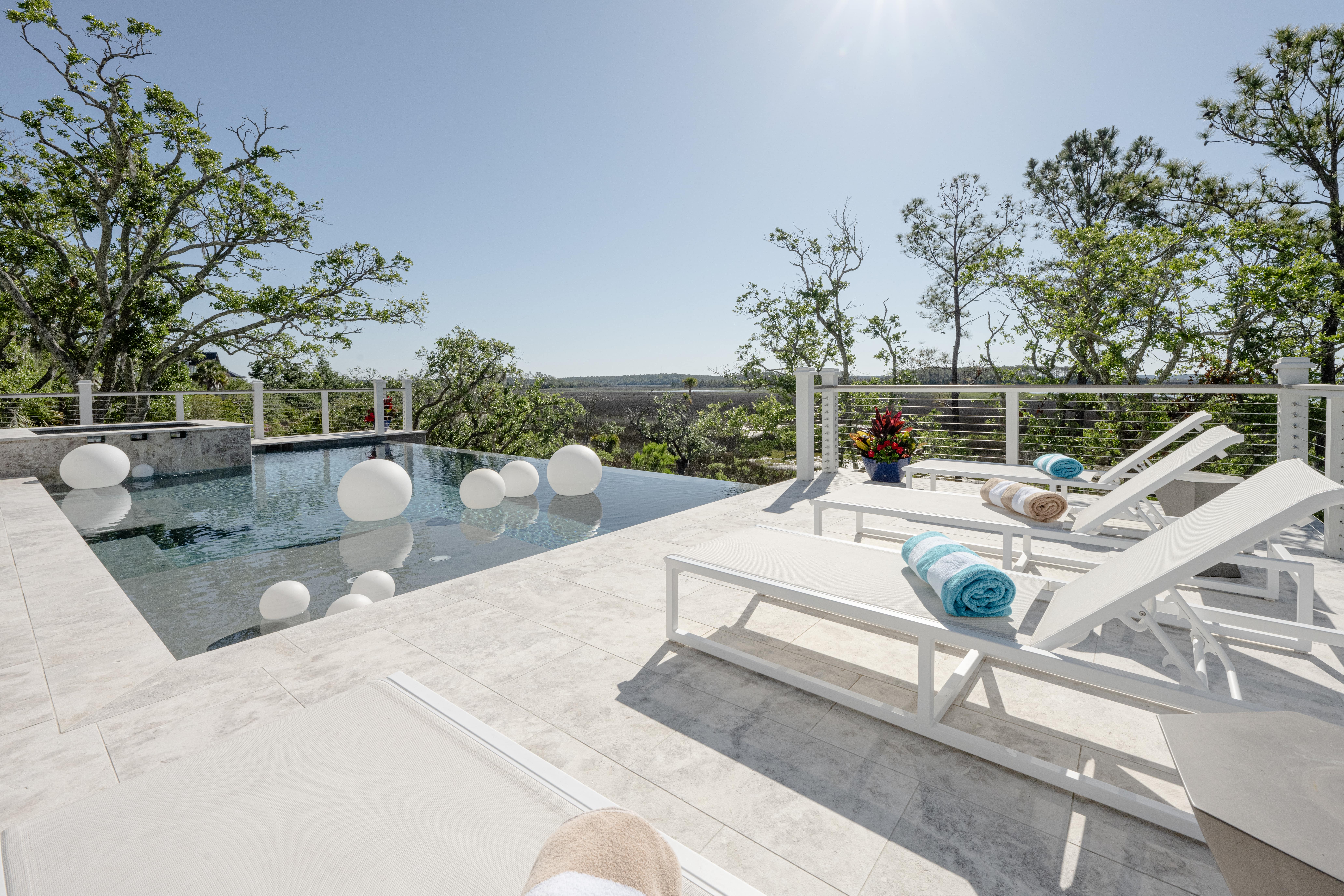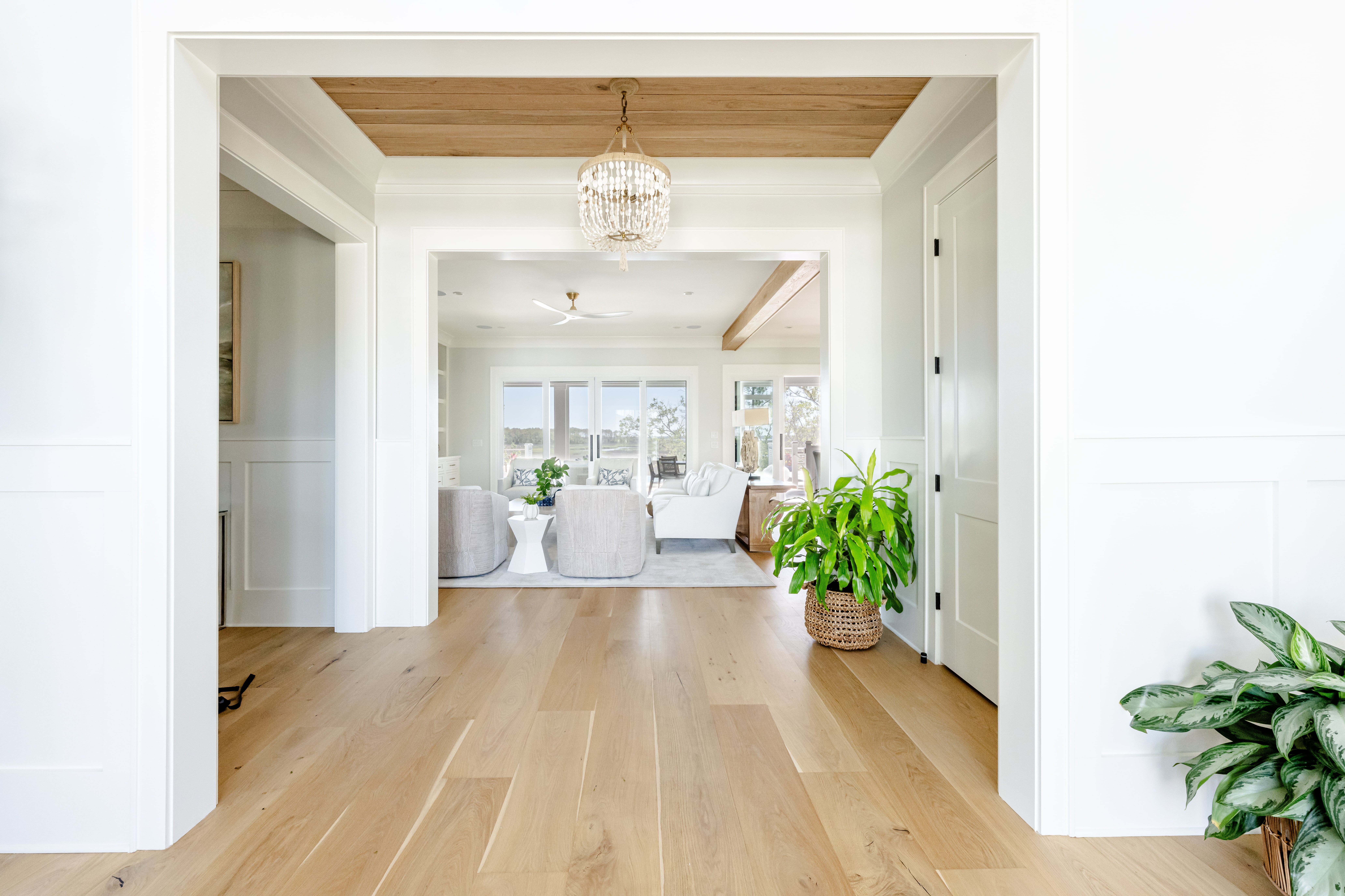 Wide-plank white oak floors and crisp architectural millwork set an elegant tone from the moment you step inside. The open foyer flows into a sunlit great room, where expansive windows frame sweeping marsh views. Built-in cabinetry flanks a custom fireplace, blending beauty and functionality.
