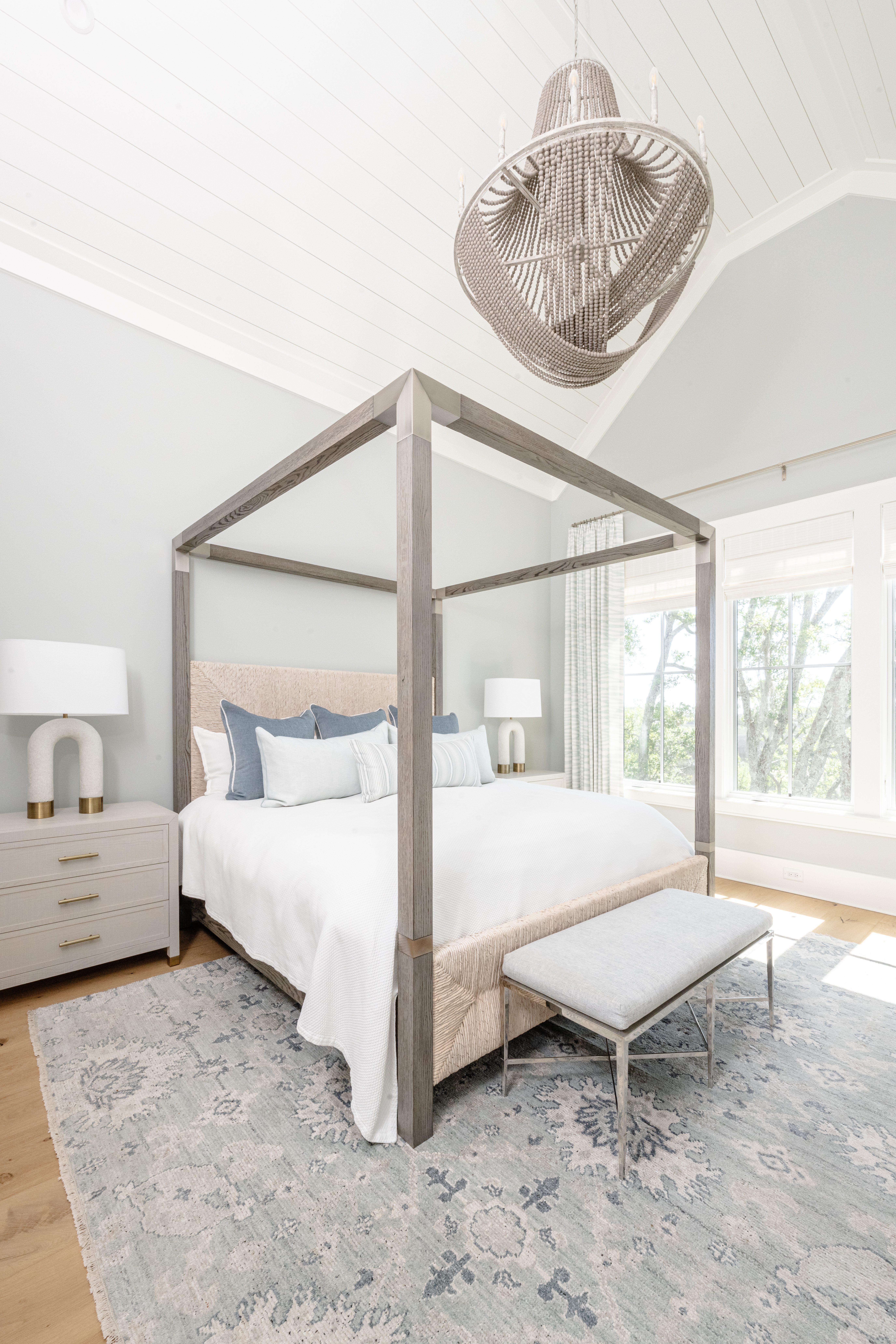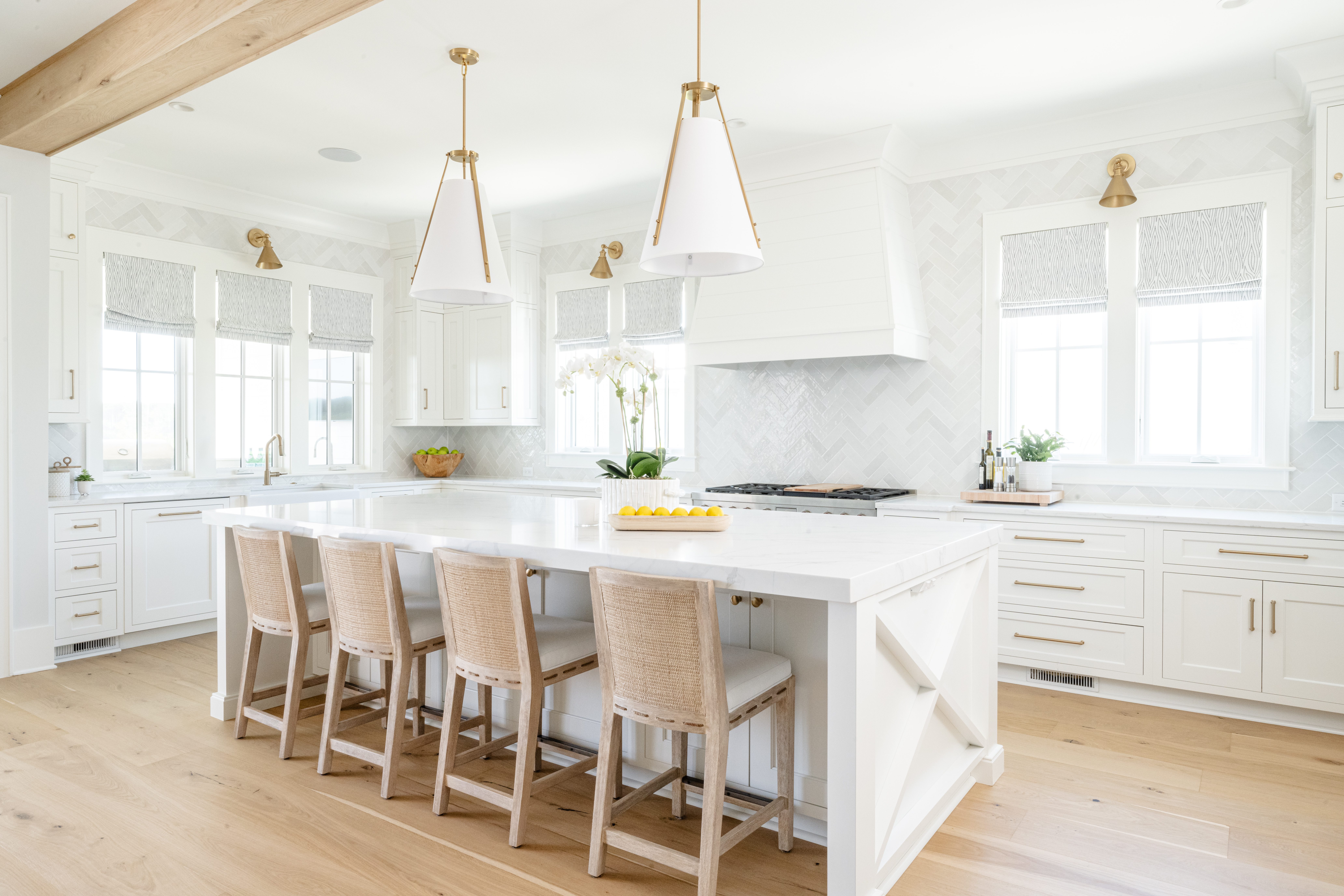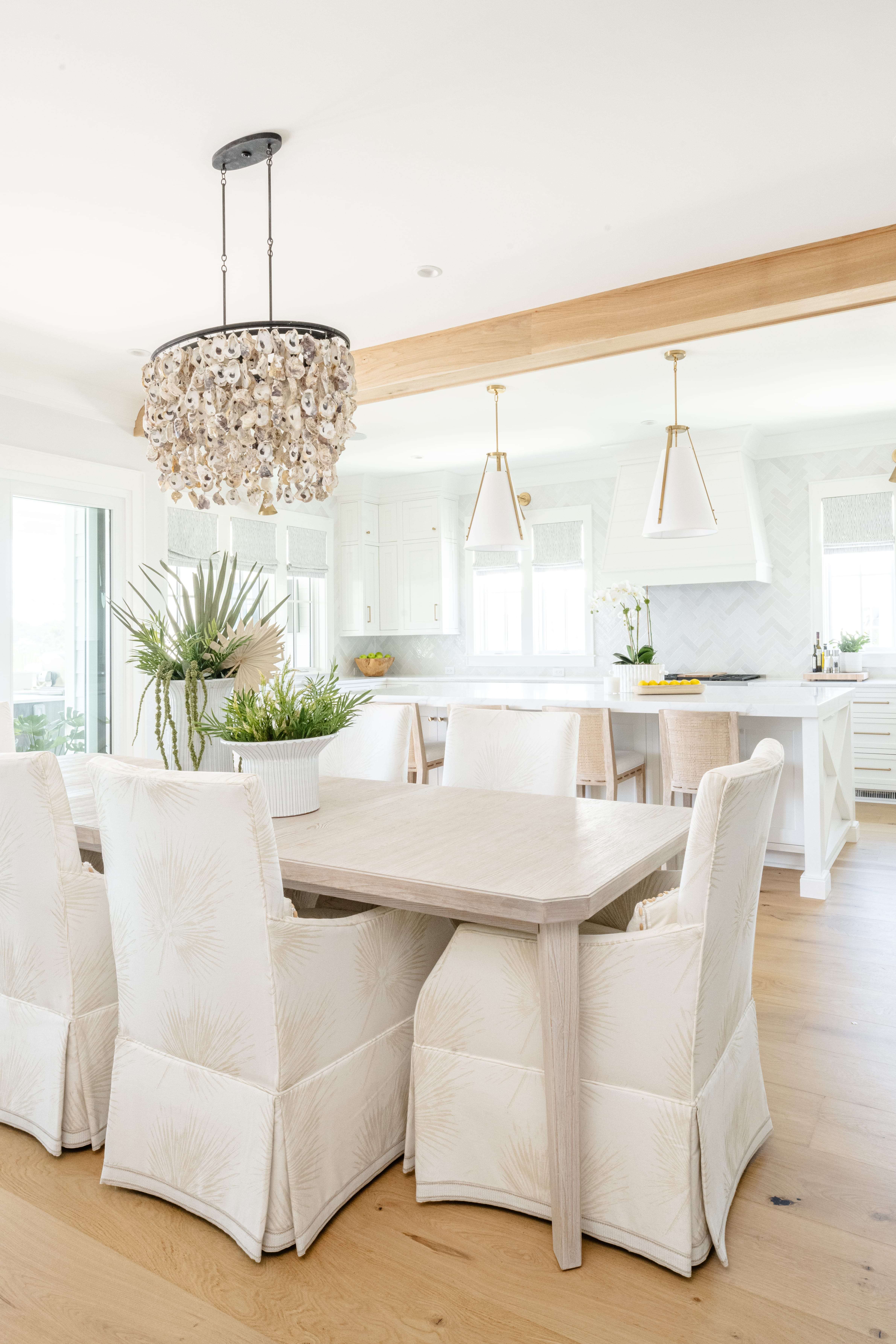 In the kitchen, white cabinetry, brushed gold hardware, and a herringbone tile backsplash create a timeless, elevated look. An oversized island encourages casual gatherings, while the adjacent dining area—anchored by an oyster shell chandelier—pays homage to the home’s coastal setting.