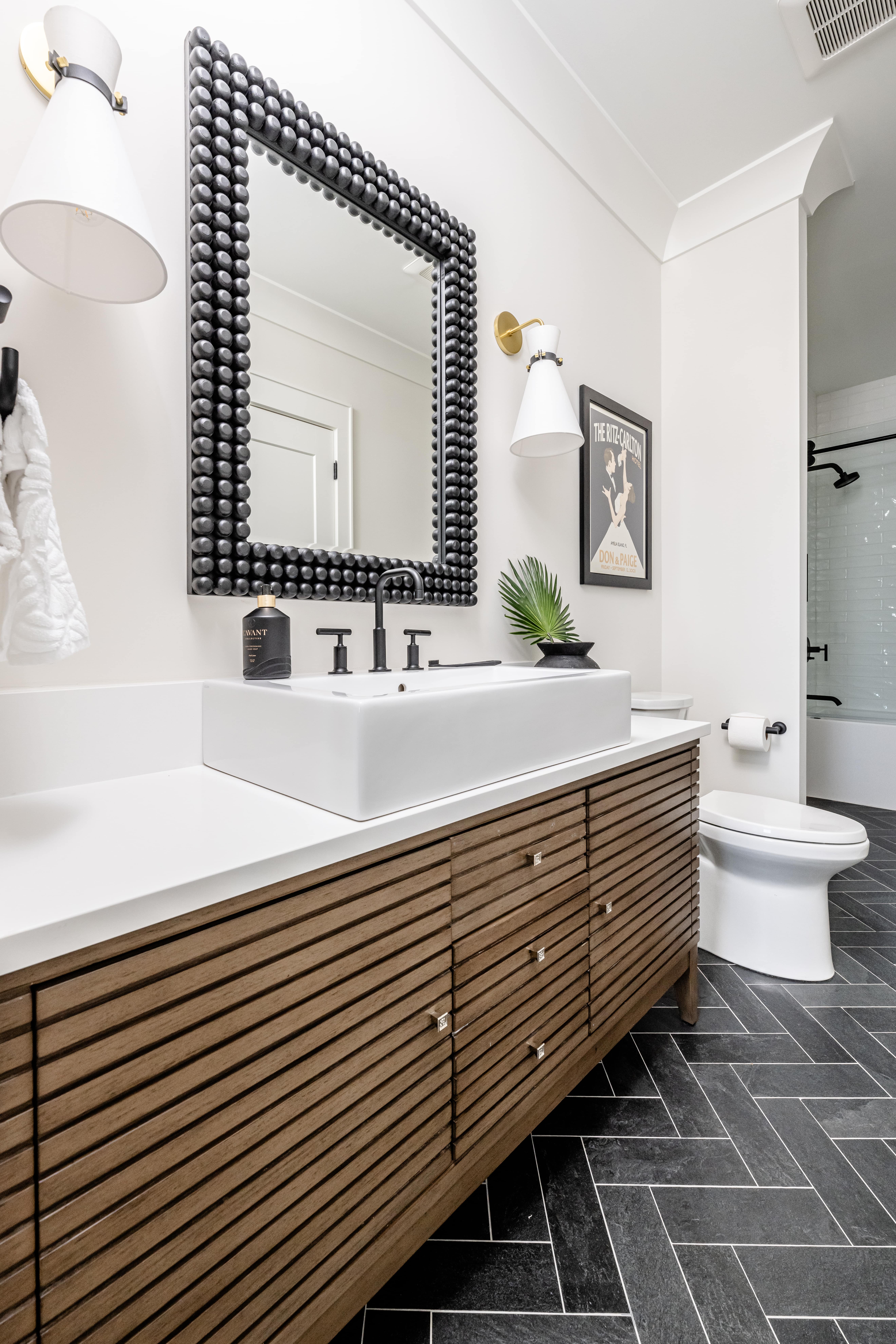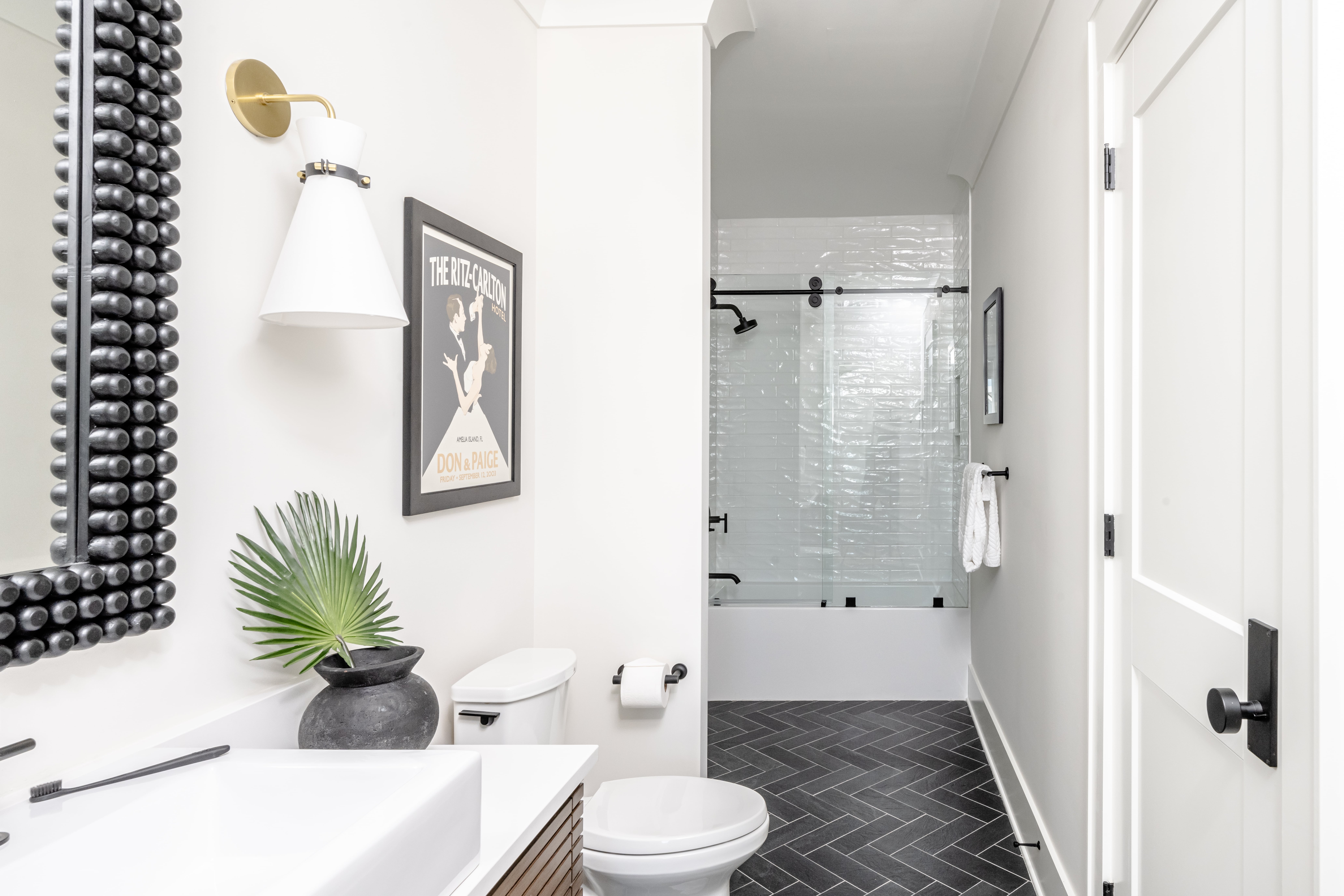 The primary suite invites relaxation with its vaulted ceiling, statement chandelier, and soft blue-gray palette. A home office with statement wallpaper and an abundance of natural light offers an inspiring place to work. Even the powder room makes an impression with starburst-patterned wallpaper and sculptural lighting.