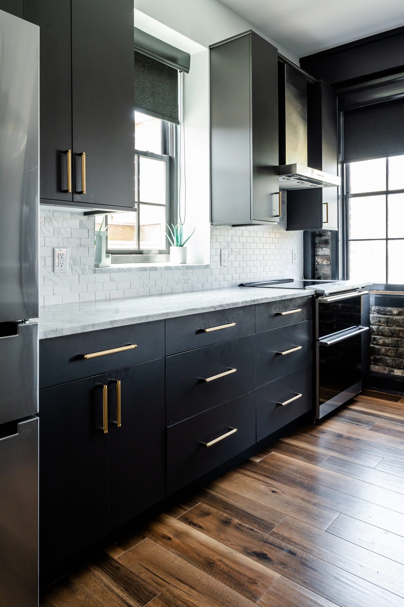 This modern kitchen concept began with sleek matte black cabinets accented by linear brass hardware pulls.