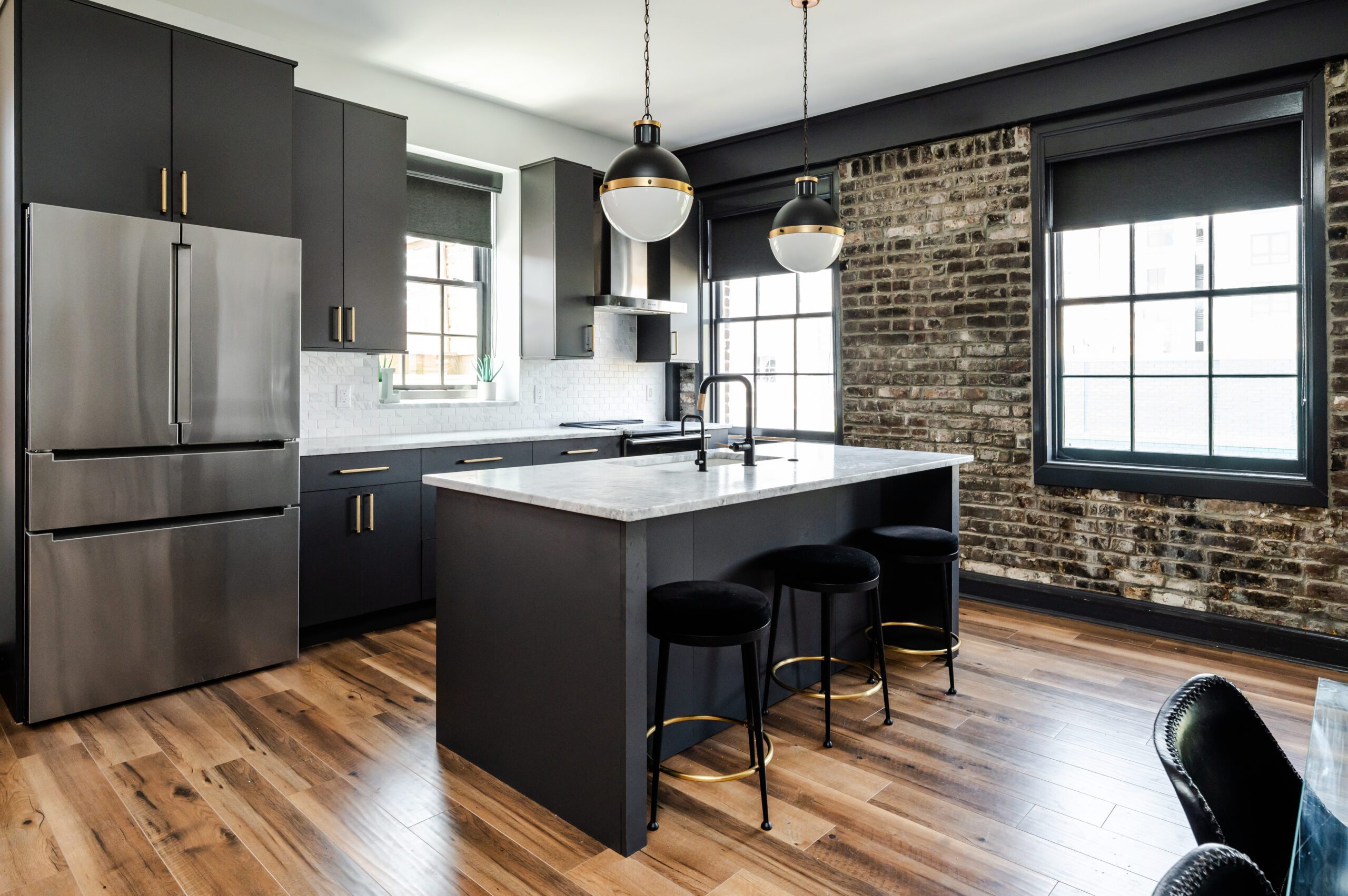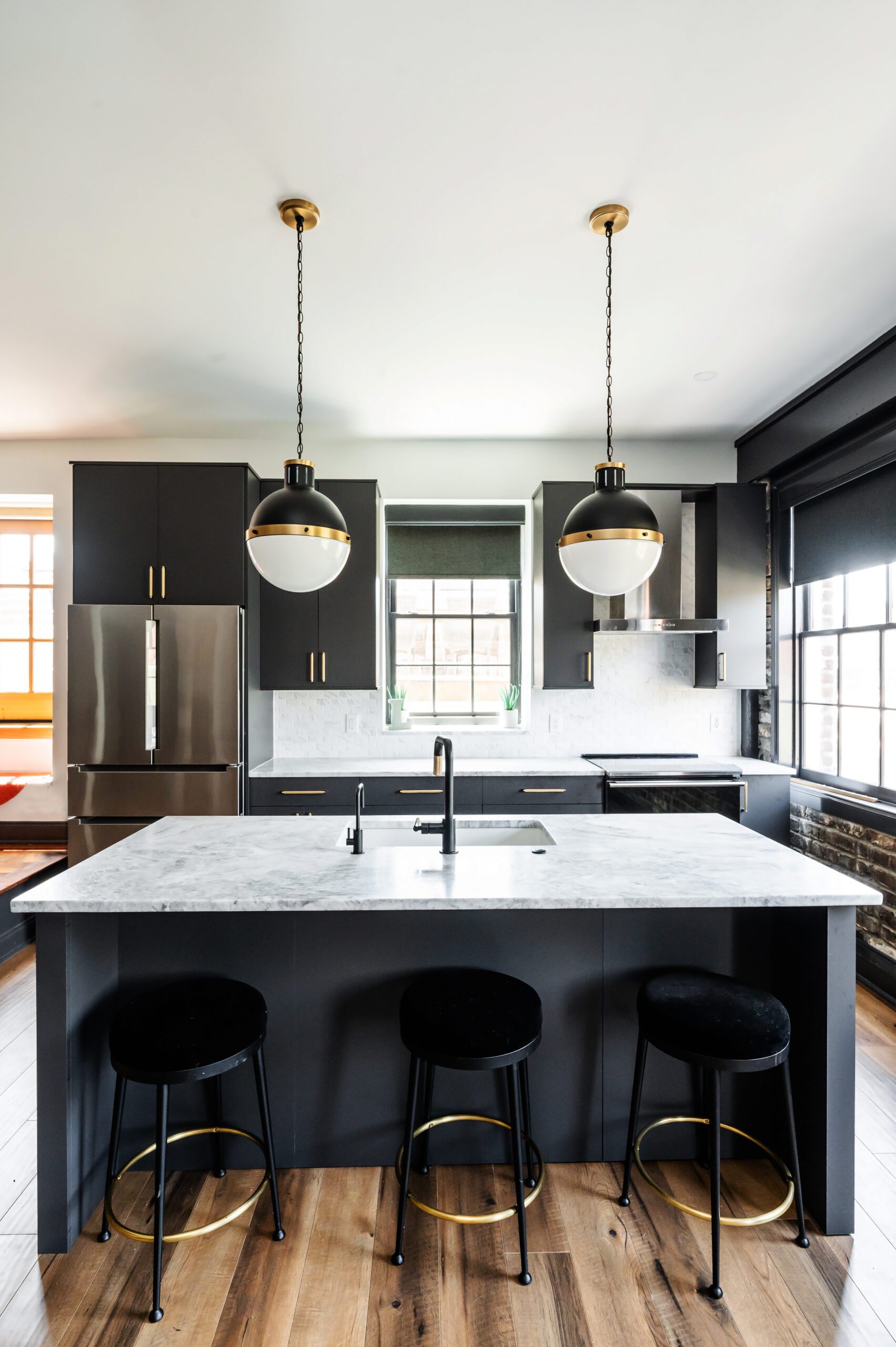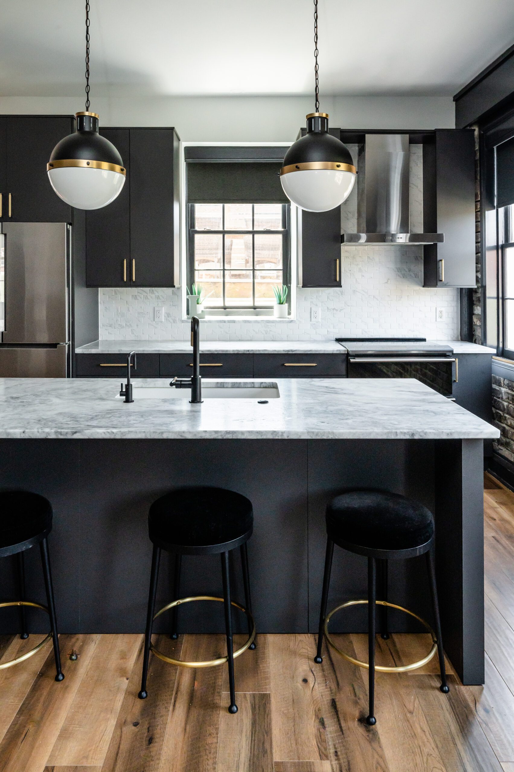 This modern kitchen concept began with sleek matte black cabinets accented by linear brass hardware pulls.