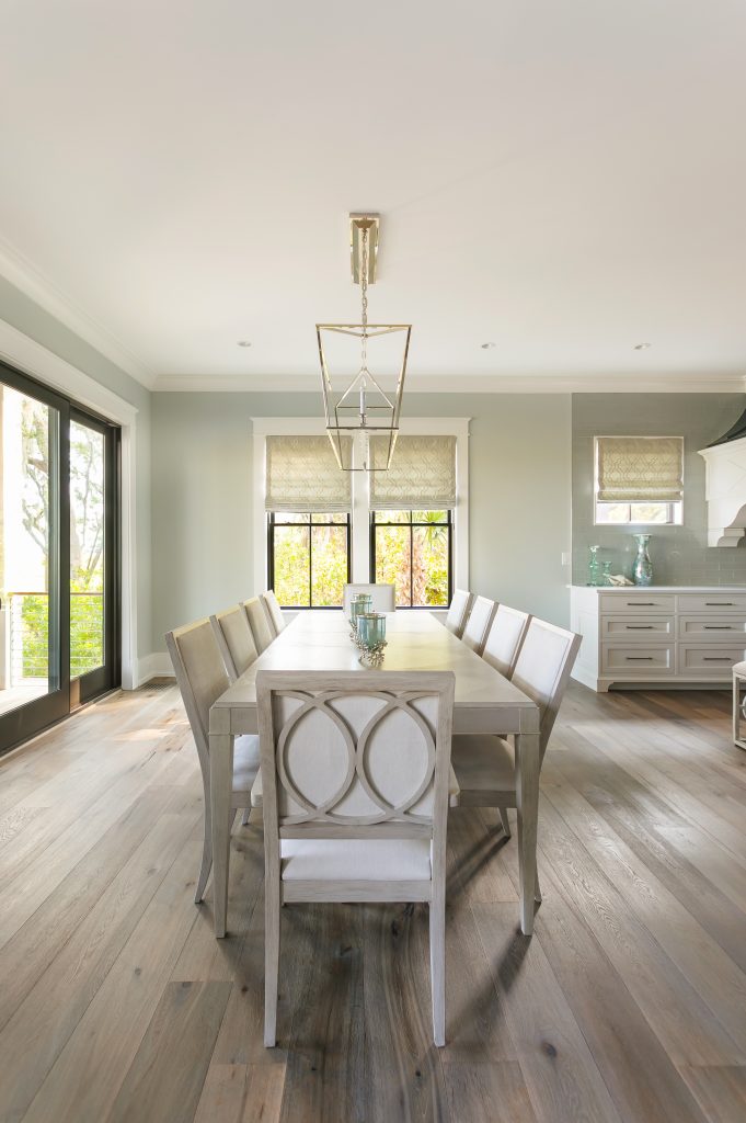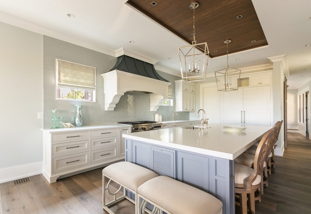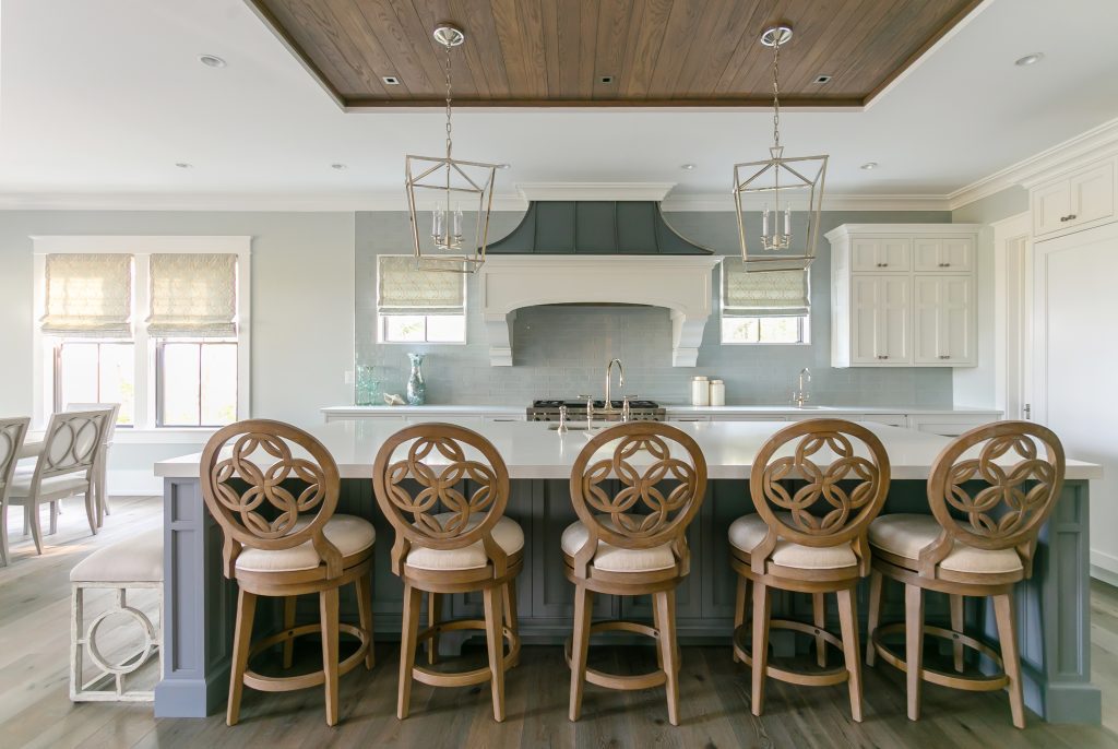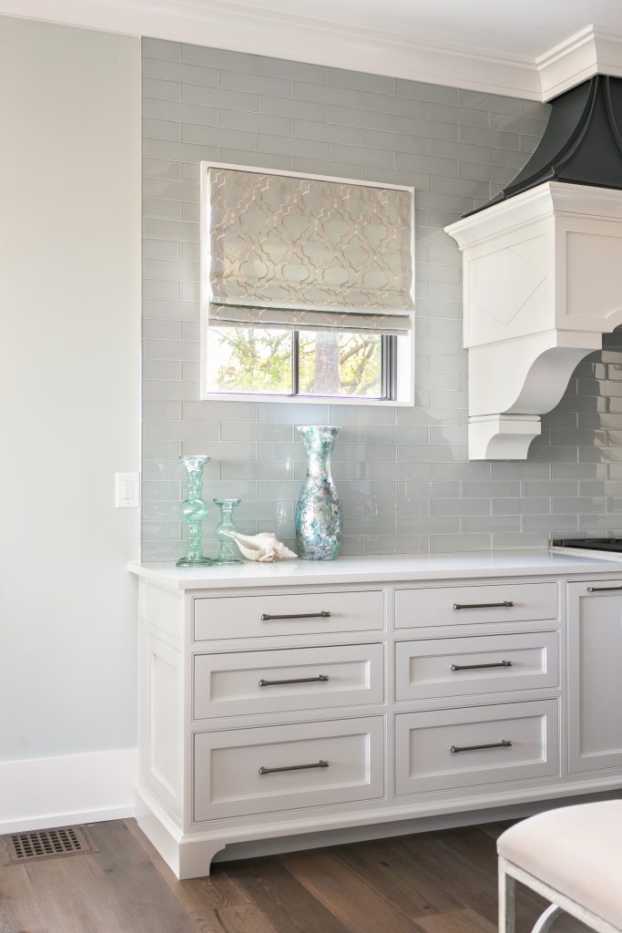 For this project, the homeowners selected custom motorized fabric roman shades in the kitchen to help manage the light that comes through the space. They wanted a cordless system for safety reasons; this way cords aren’t getting caught in things and dangling for kids or pets to mess with. The custom kitchen is finished in hues to blues, grays, browns, and greens to reflect the natural colors of the landscape that surrounds the home.