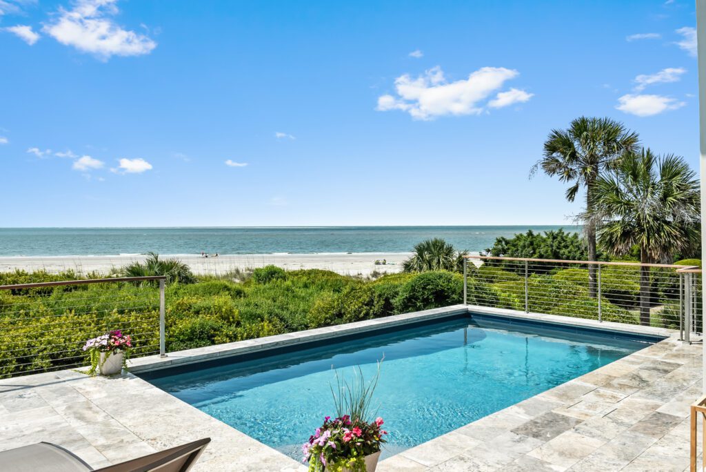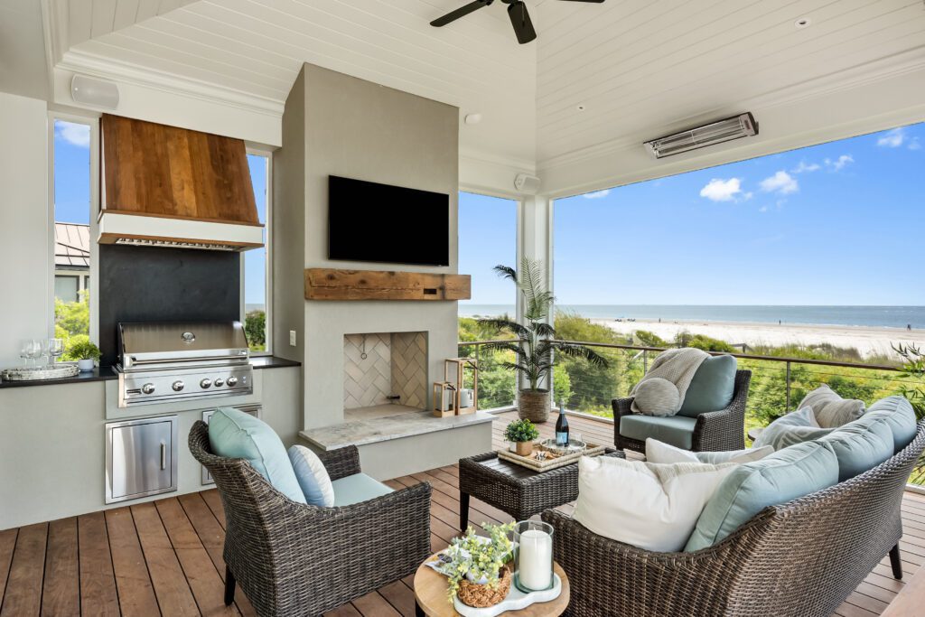 A specially designed screen porch includes a fireplace and a lowered roofline for unobstructed ocean views from the second floor, blending functionality with nature.