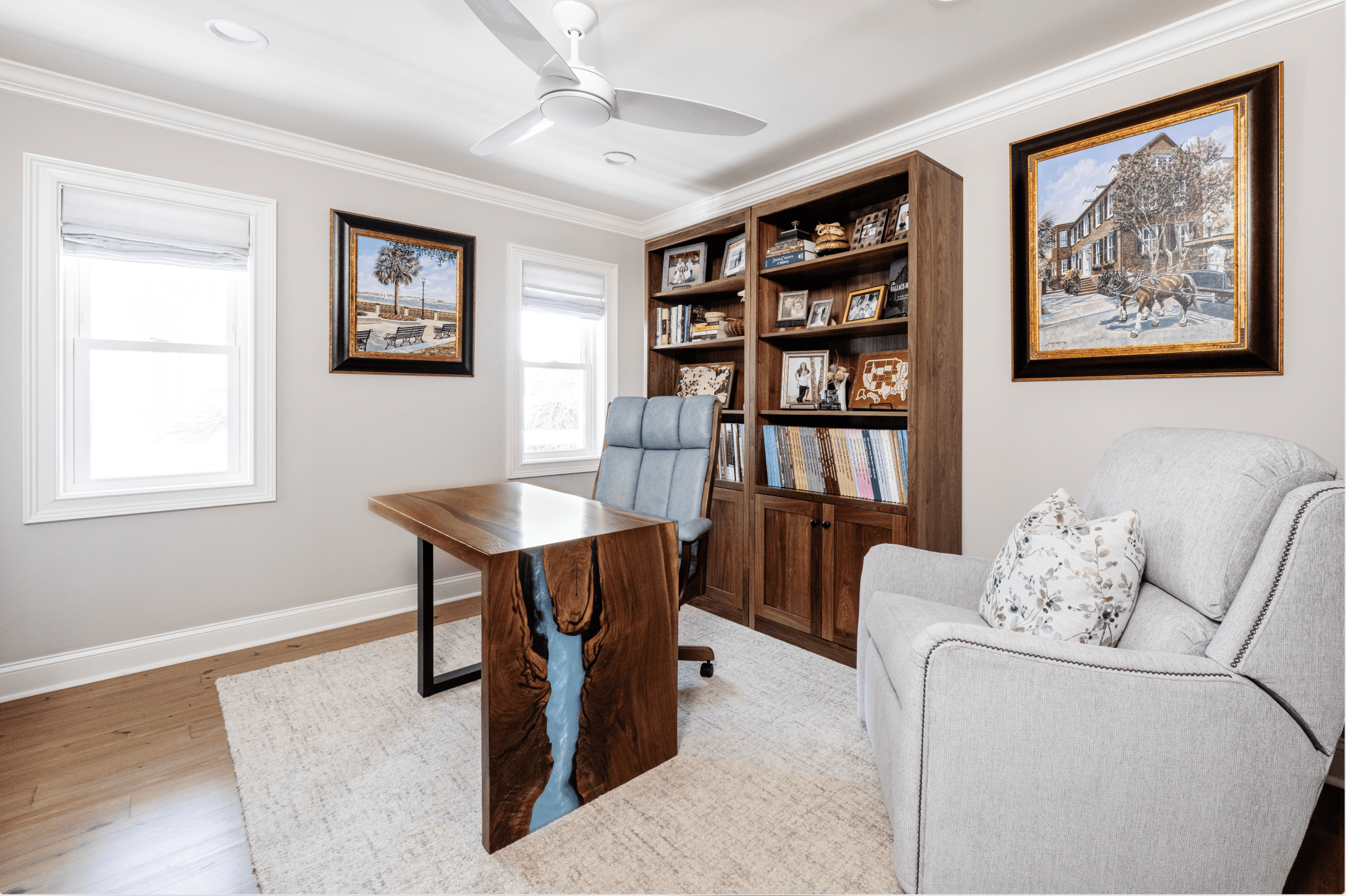 The living room sets the tone with plush seating that stays fresh despite daily use from the family dog. Jeff’s office features a standout walnut waterfall desk with aqua epoxy, glowing in the morning light. In the dining room, a counter-height Buxton table with a custom ambrosia maple top balances the soaring ceilings, paired with swivel dining chairs for easy, elegant living.