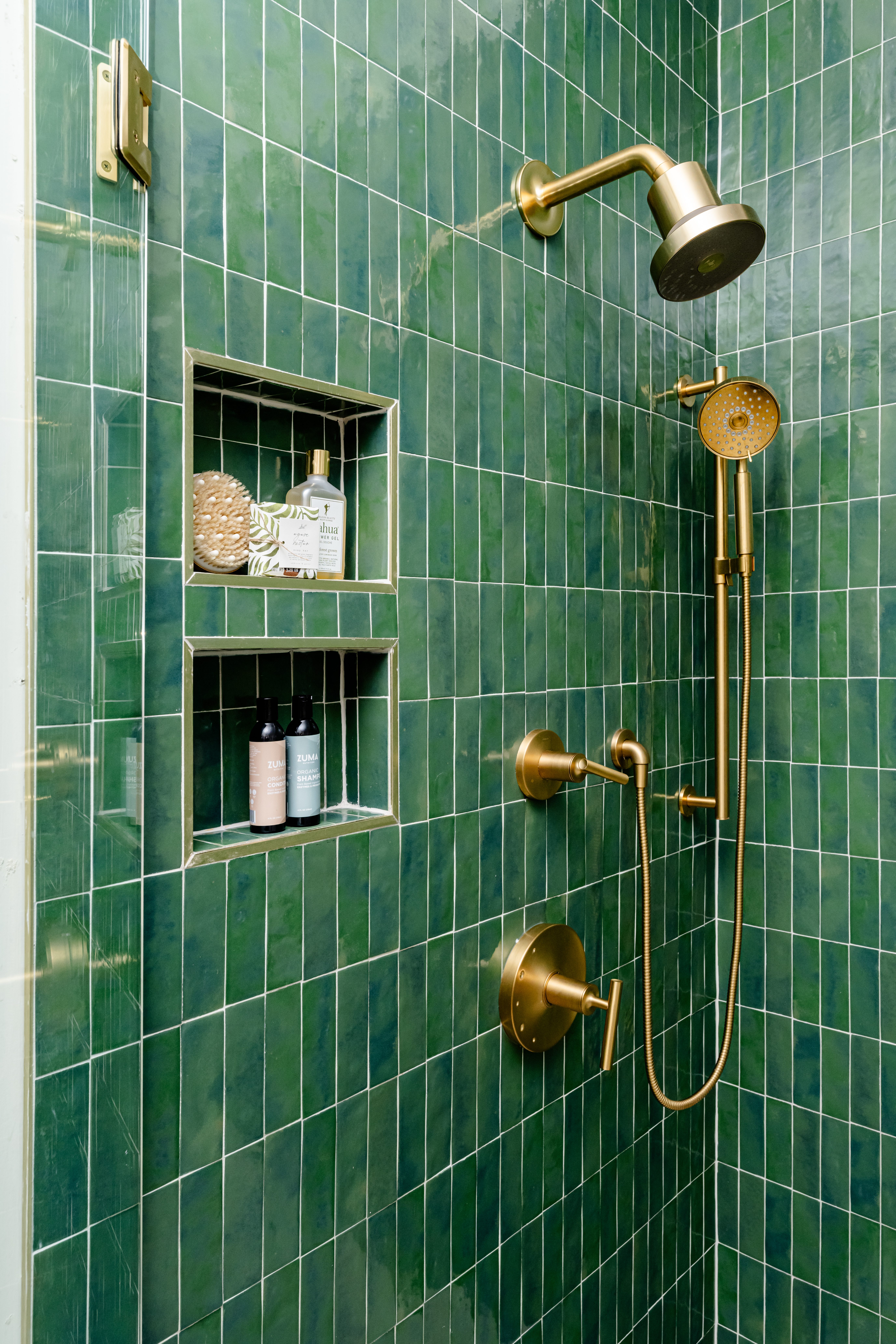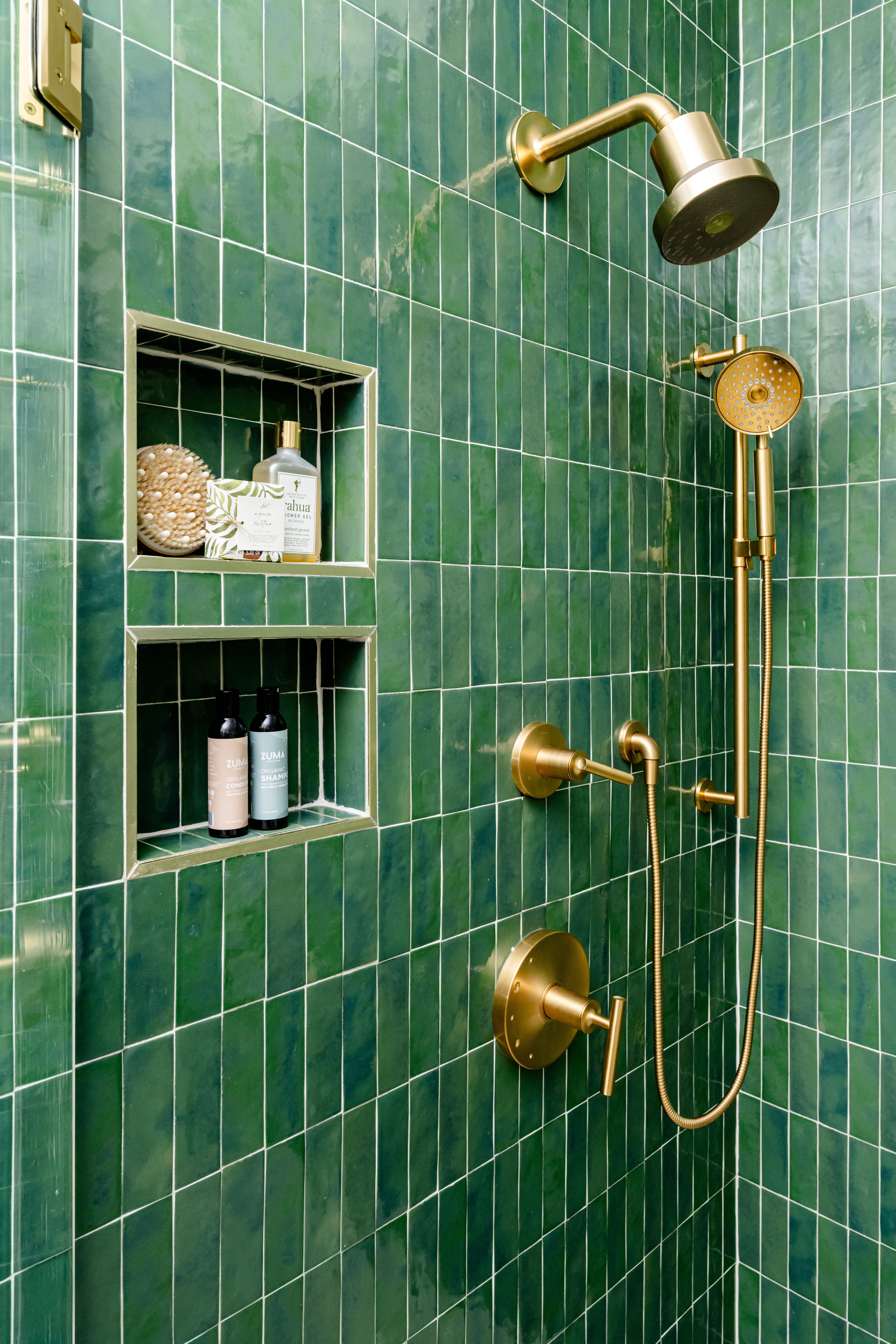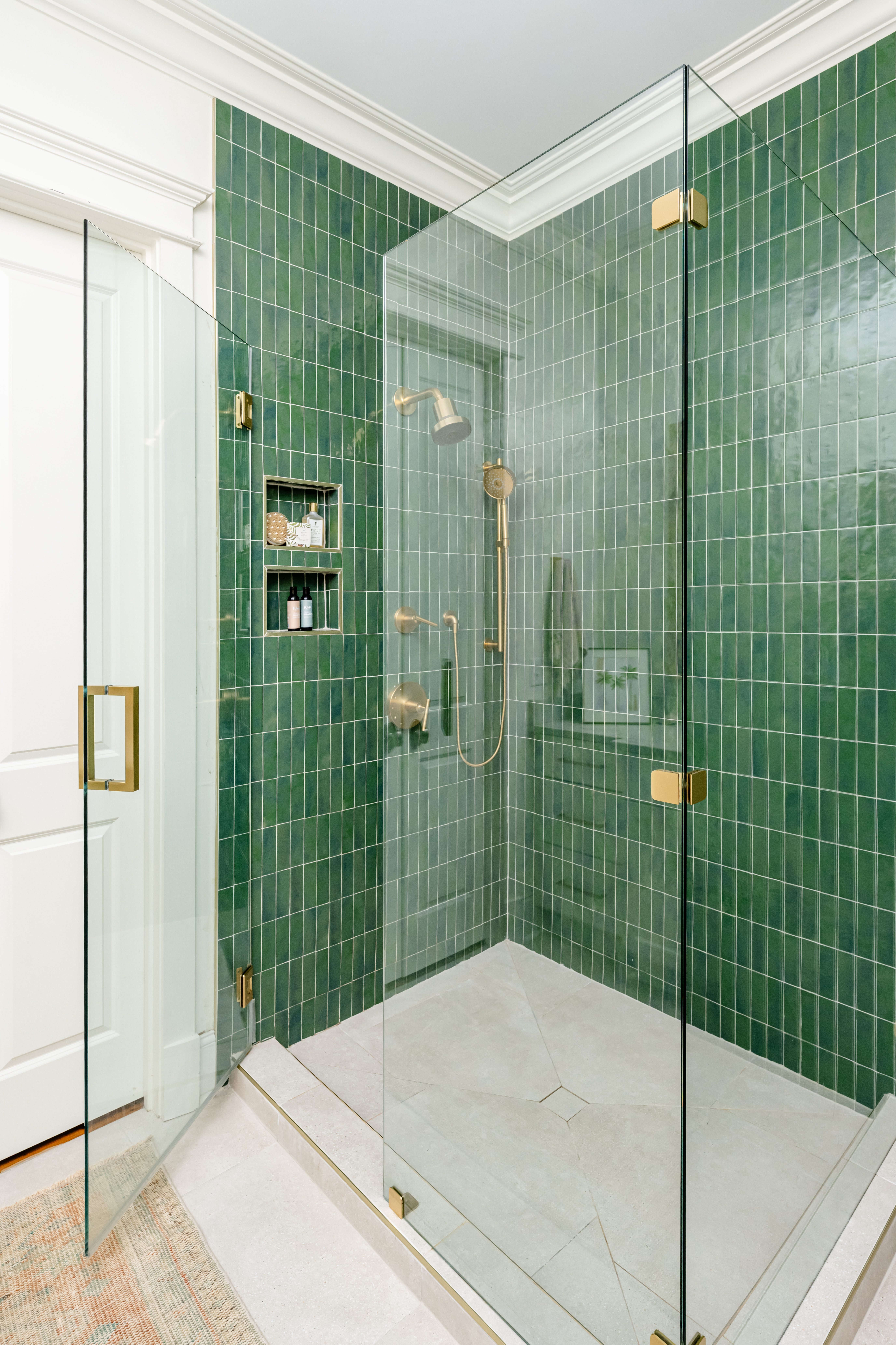 Concrete tile floors by Melcer Tile add a raw and refined element compared to the reflective emerald green wall tiles. Brass plumbing fixtures are perfect complements to these organic material selections.