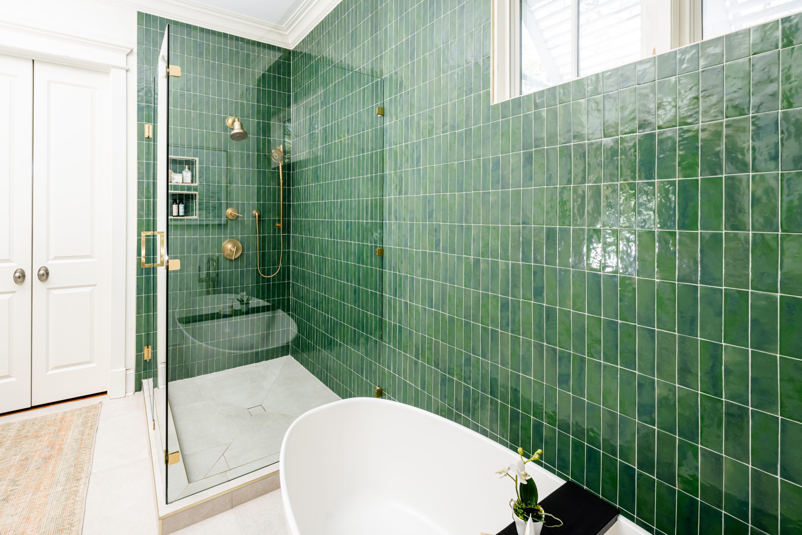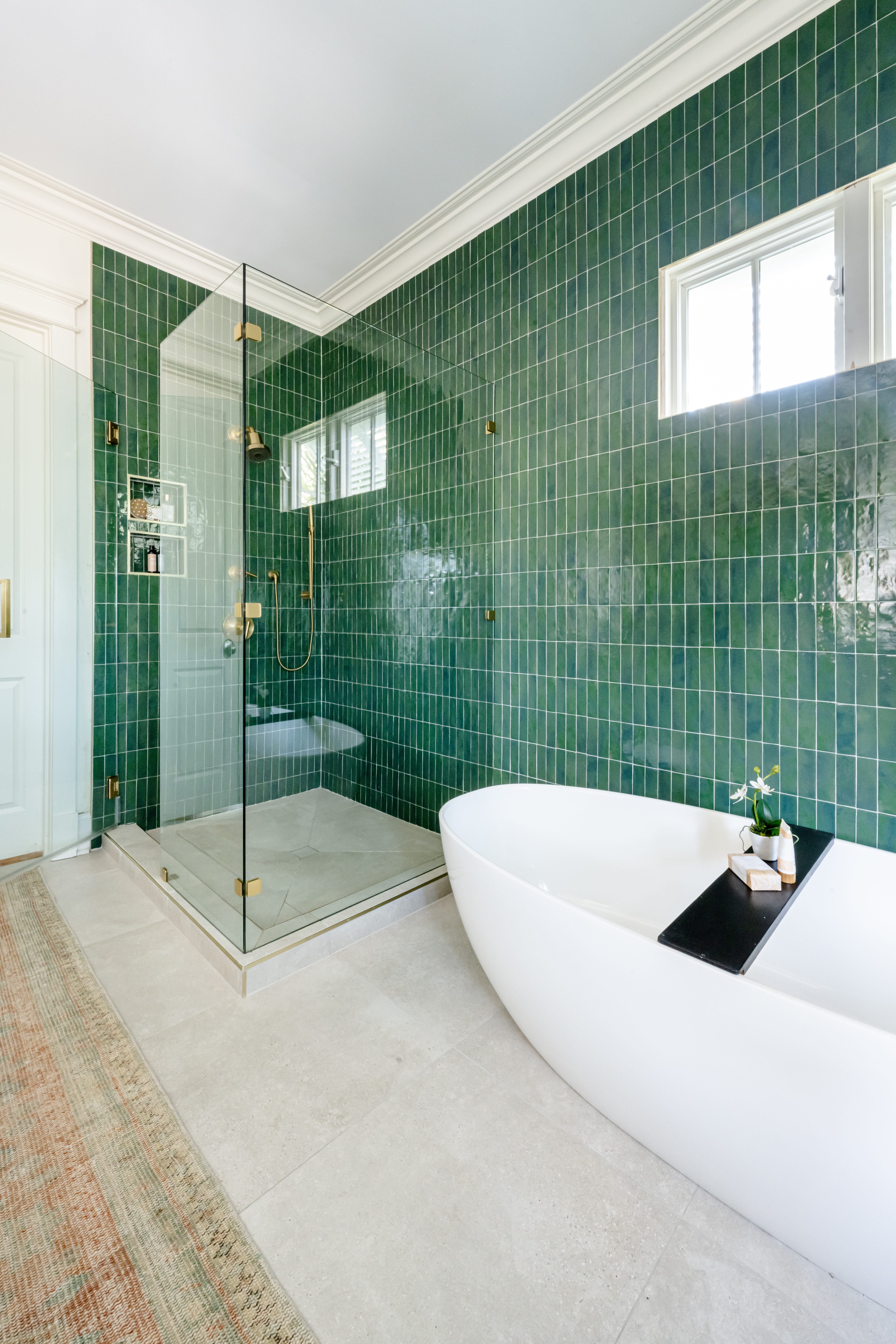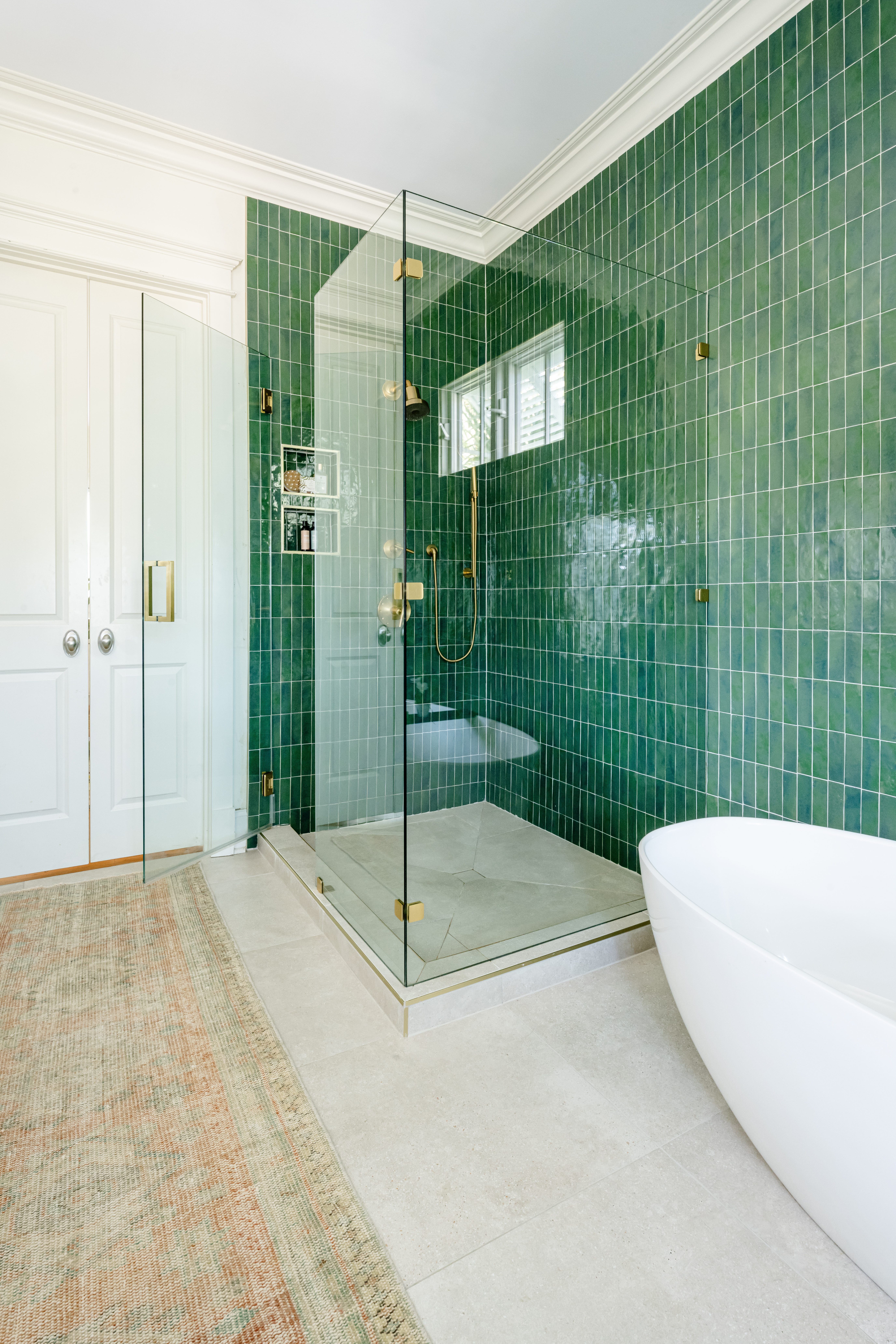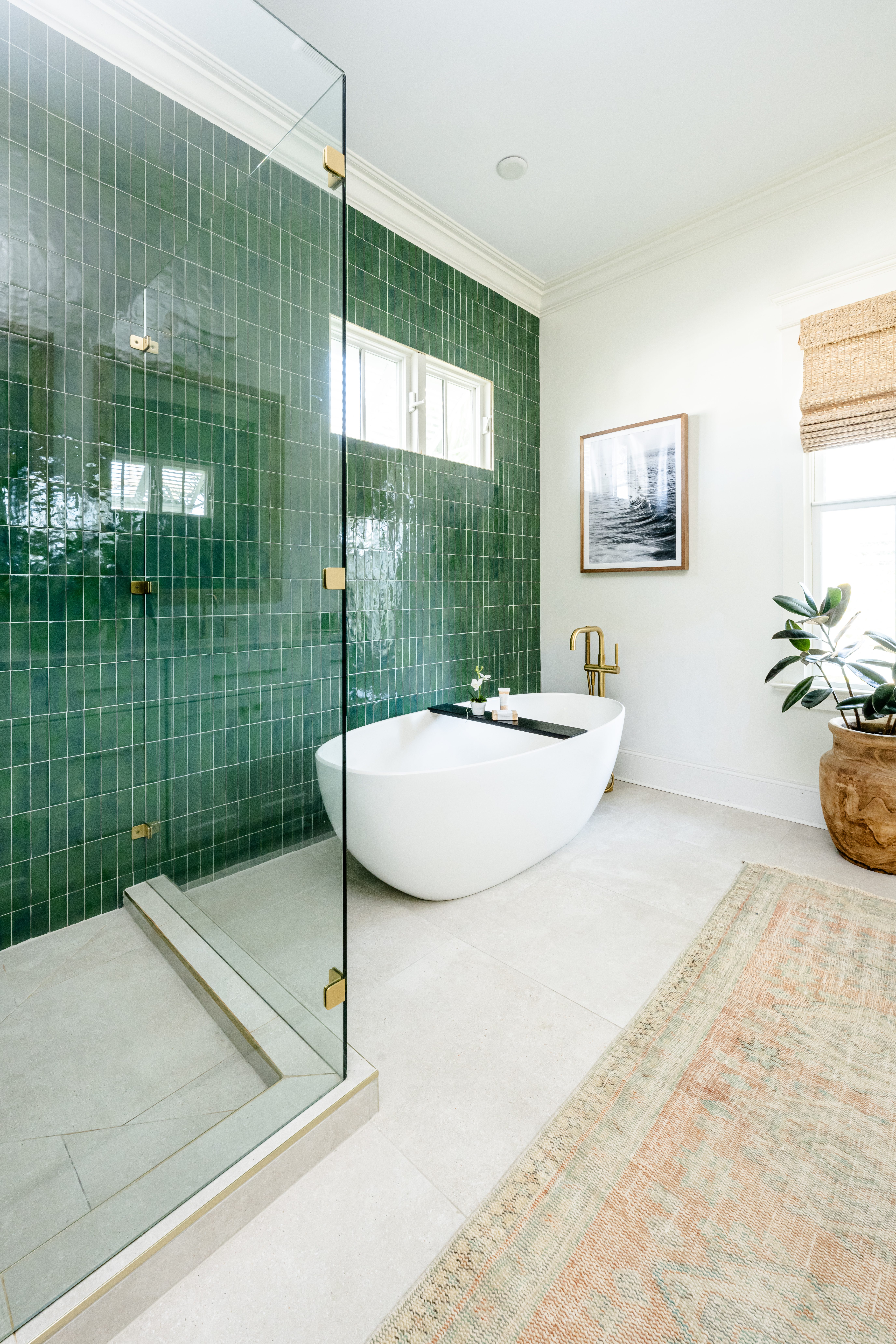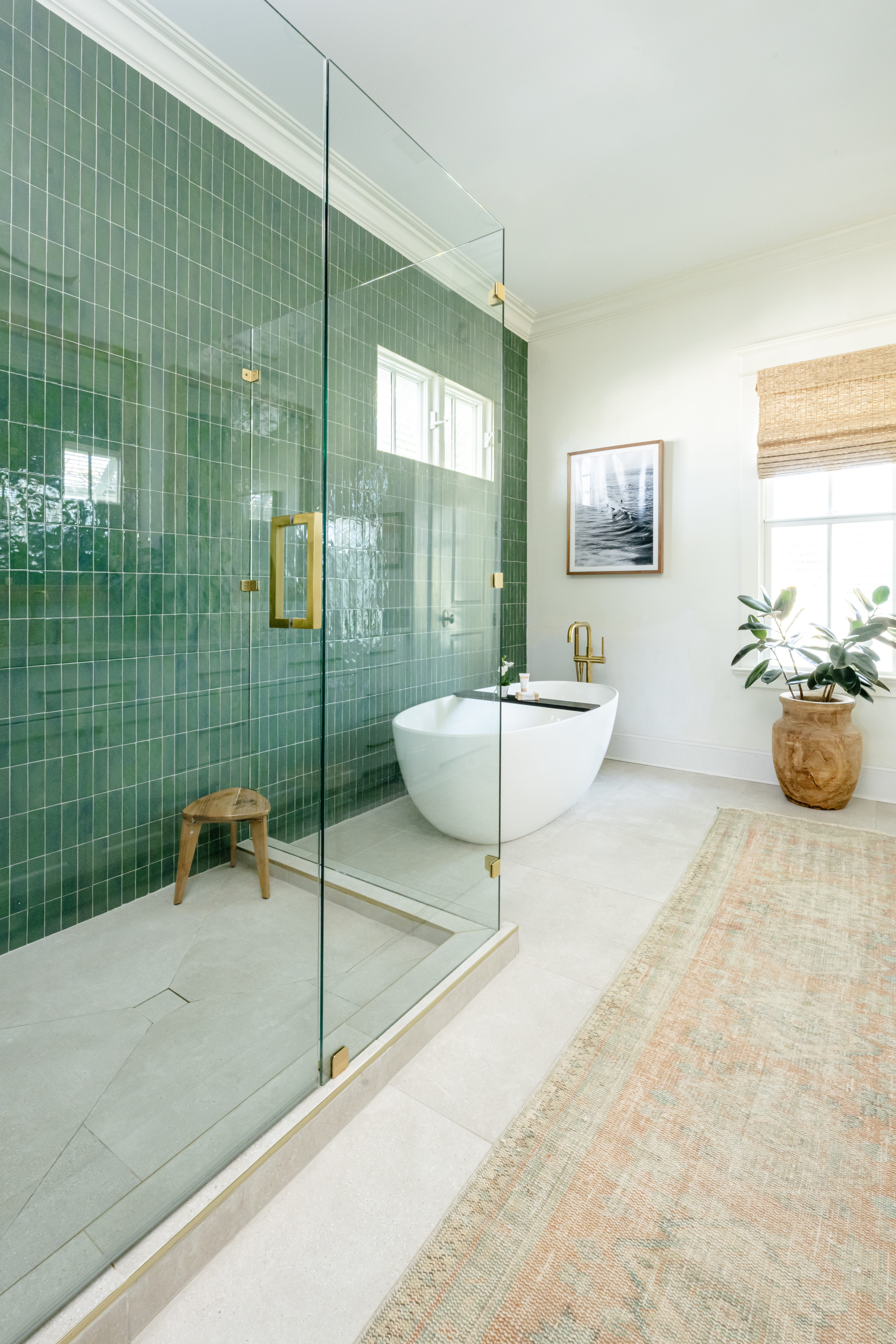 Ceramic zellige tile by Melcer Tile has a slightly imperfect, artisanal look. Taking the tile across the length of the shower wall makes this bathroom feel more expansive and details both the glass shower and soaking tub spaces.