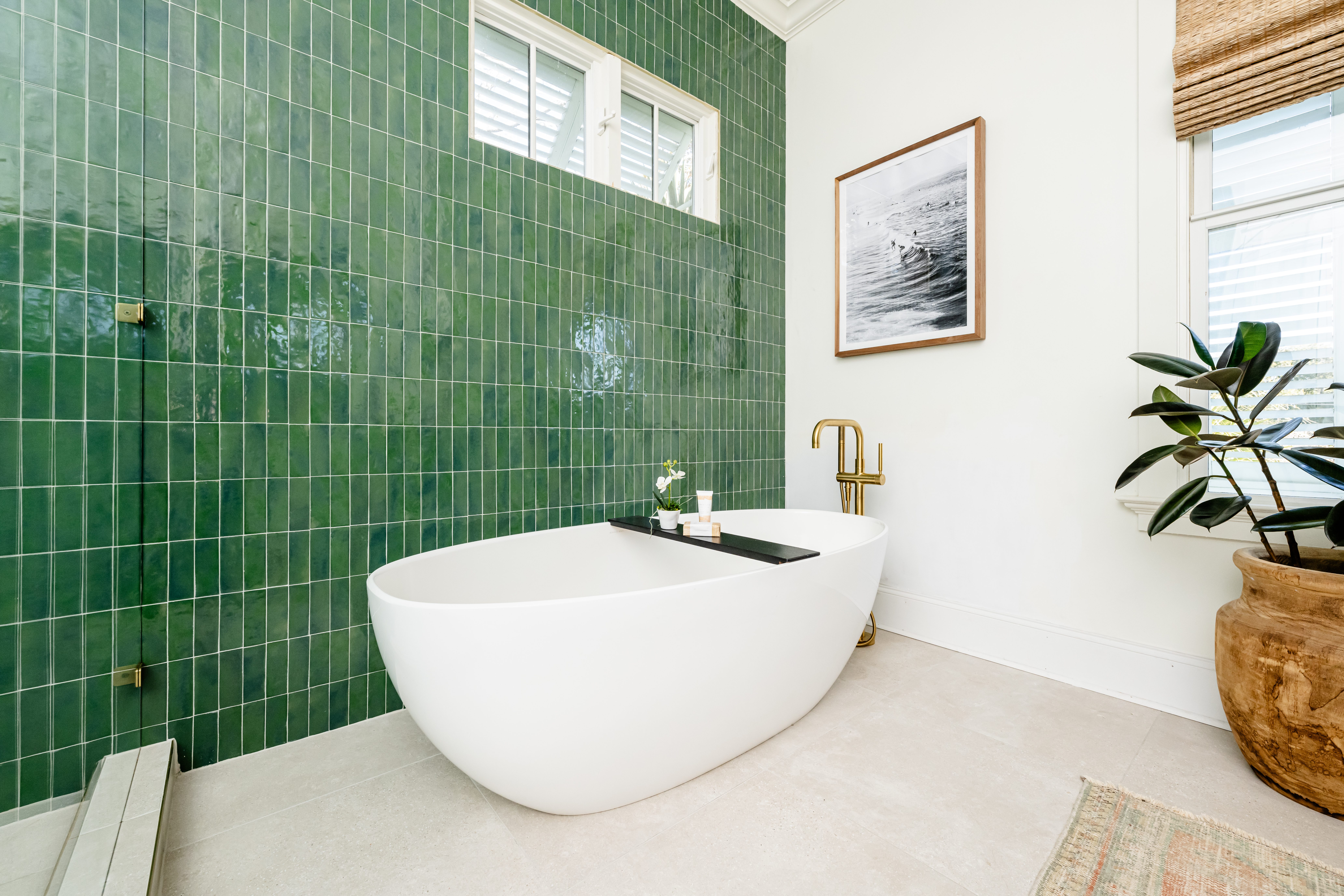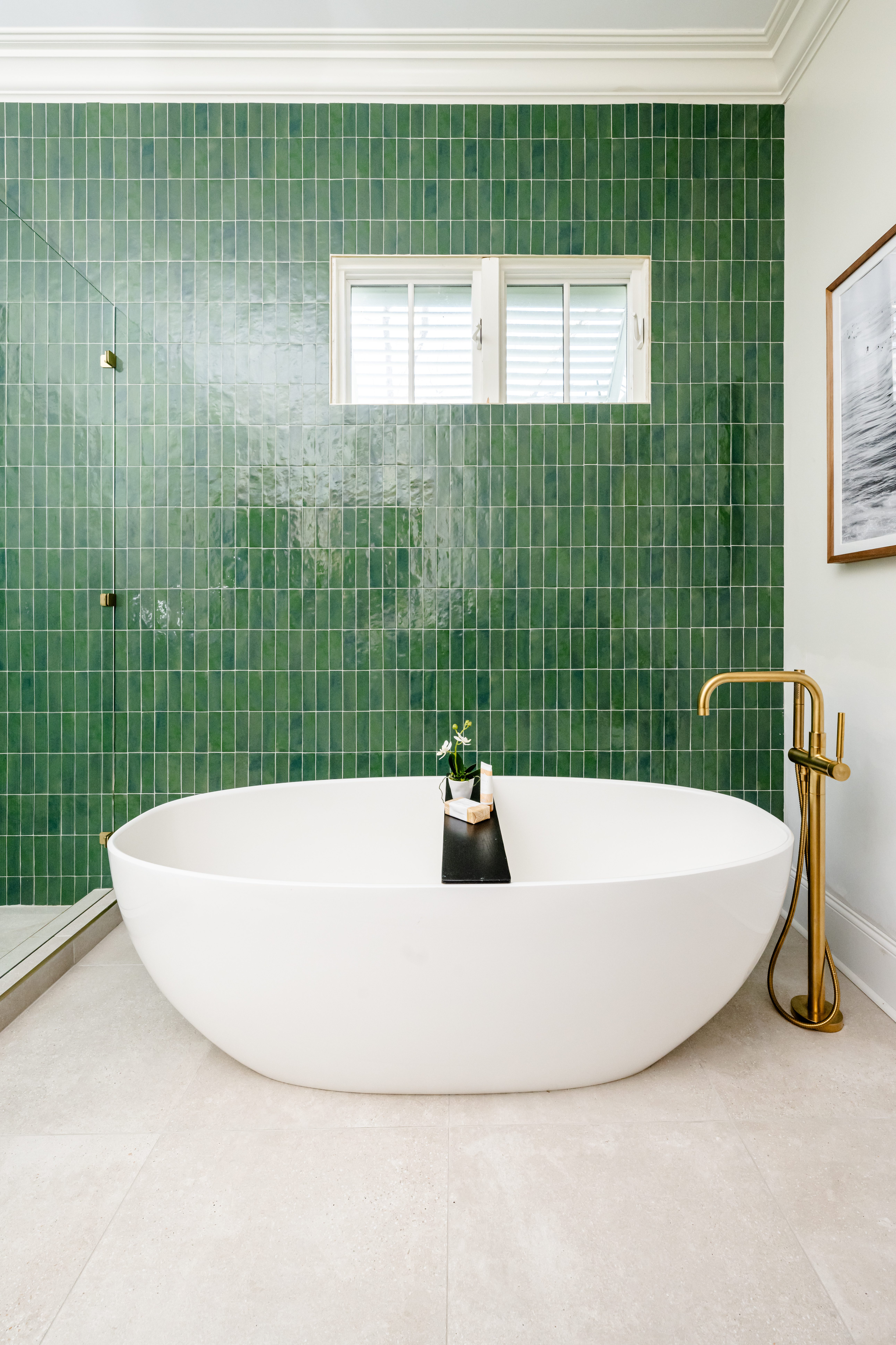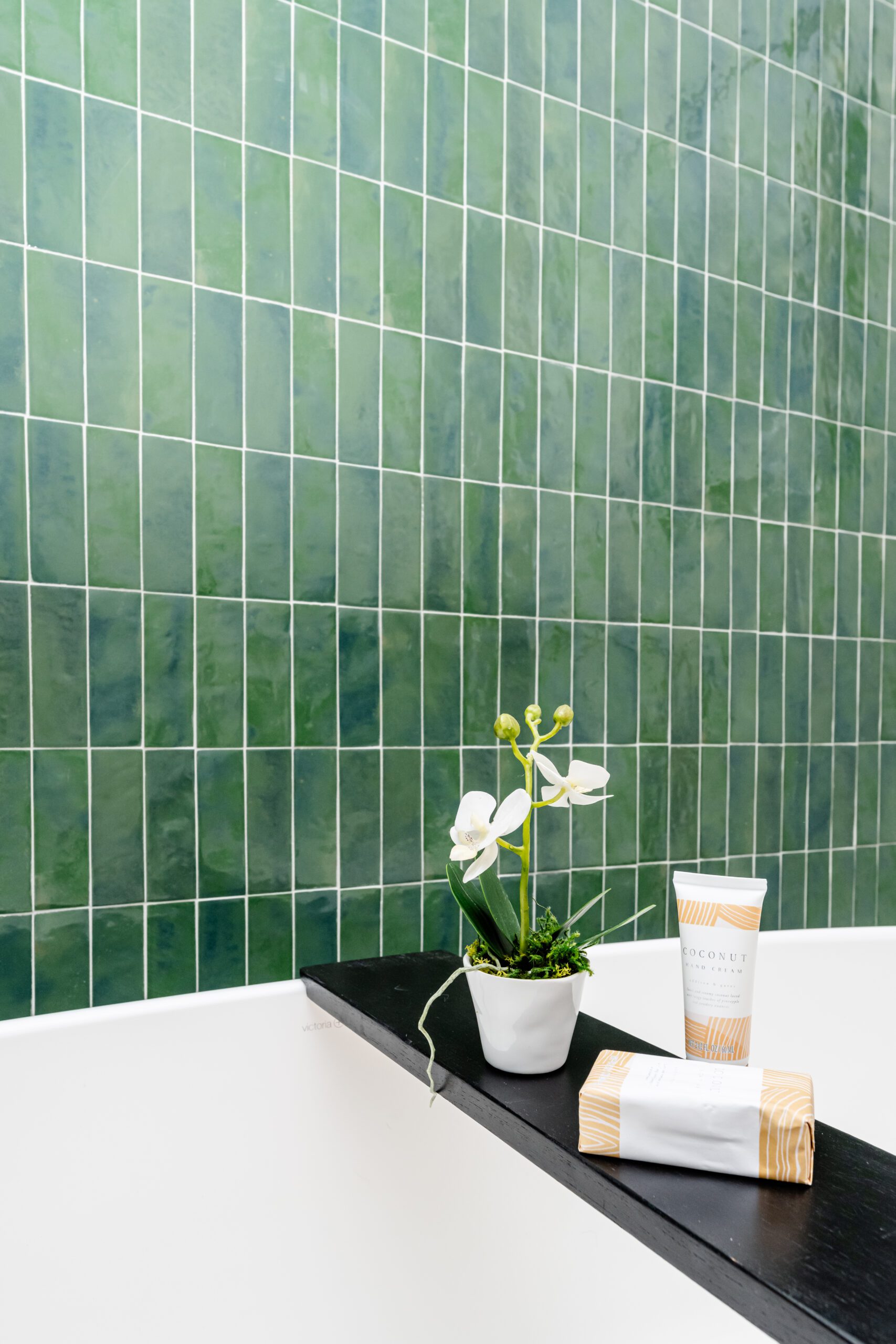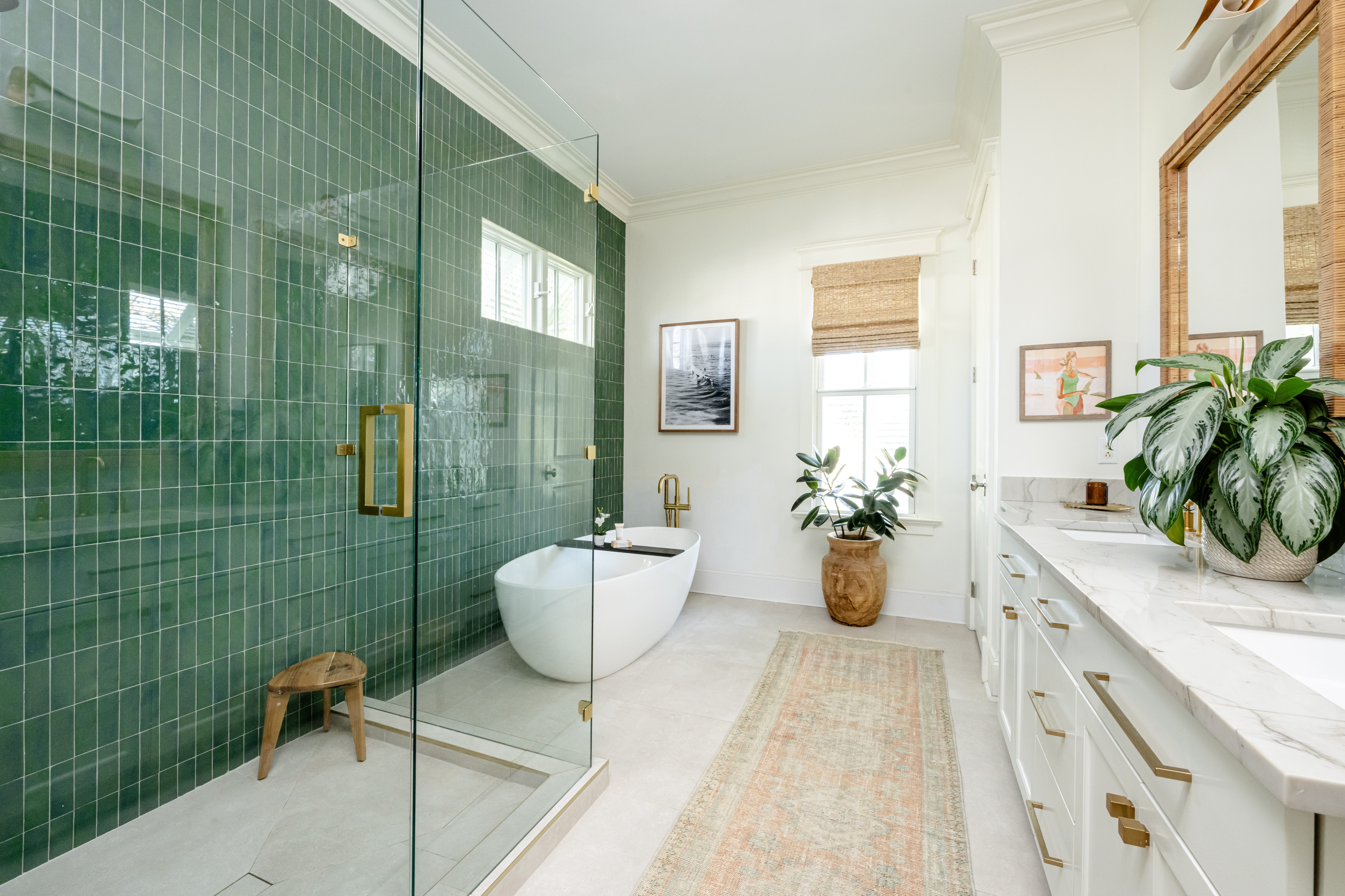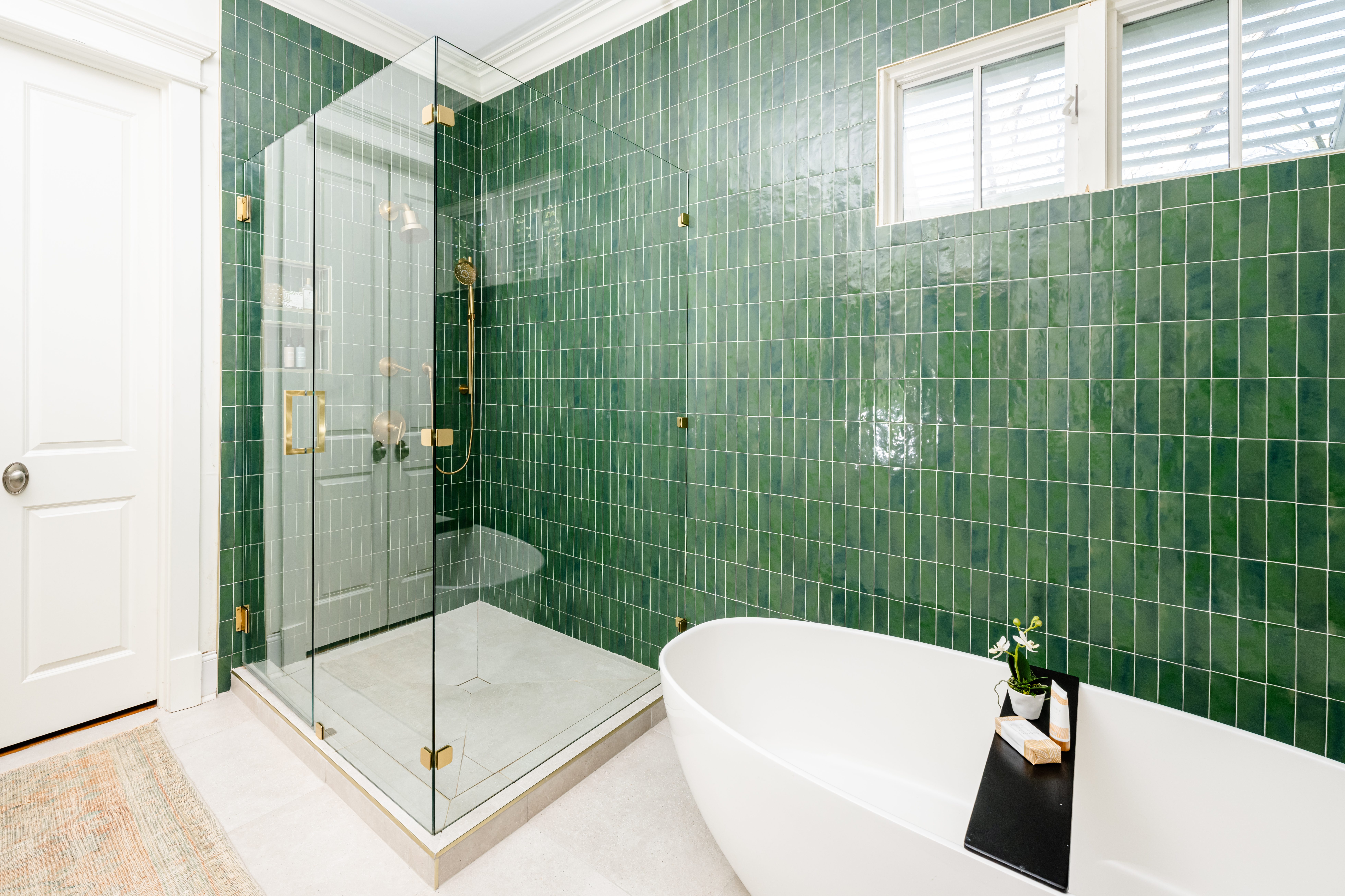 Ceramic zellige tile by Melcer Tile has a slightly imperfect, artisanal look. Taking the tile across the length of the shower wall makes this bathroom feel more expansive and details both the glass shower and soaking tub spaces.