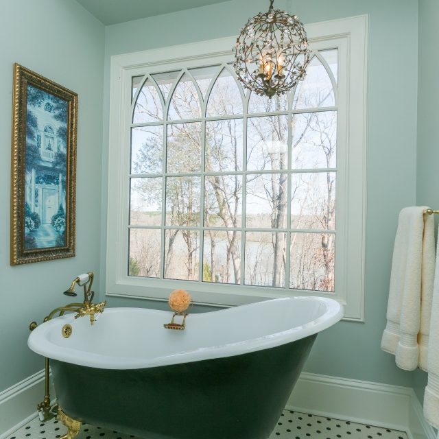 It was important for Dana to keep her classic claw-foot tub as part of the bathroom design, so the duo focused on updating the shower. She and Pam decided to remove the acrylic stall and replace it with custom tile featuring a smaller, iridescent accent for interest. To draw attention to the tub, they installed a crystal chandelier. After swapping the small beadboard on the walls for a wider option and adding a hint of color, the bathroom was nearly complete. There was just one thing missing. Pam and Dana, during their efforts to find all the necessary accents for the new master bath, discovered a beautiful rug. “Every room needs a splash of color,” proclaims Pam. “Rather than adding art to the wall, we added it to the floor.” The floral rug completes the circle of the room, so that attention is drawn from the shower to the tub and the chandelier, over to the cabinets and sinks, and then to the floor.