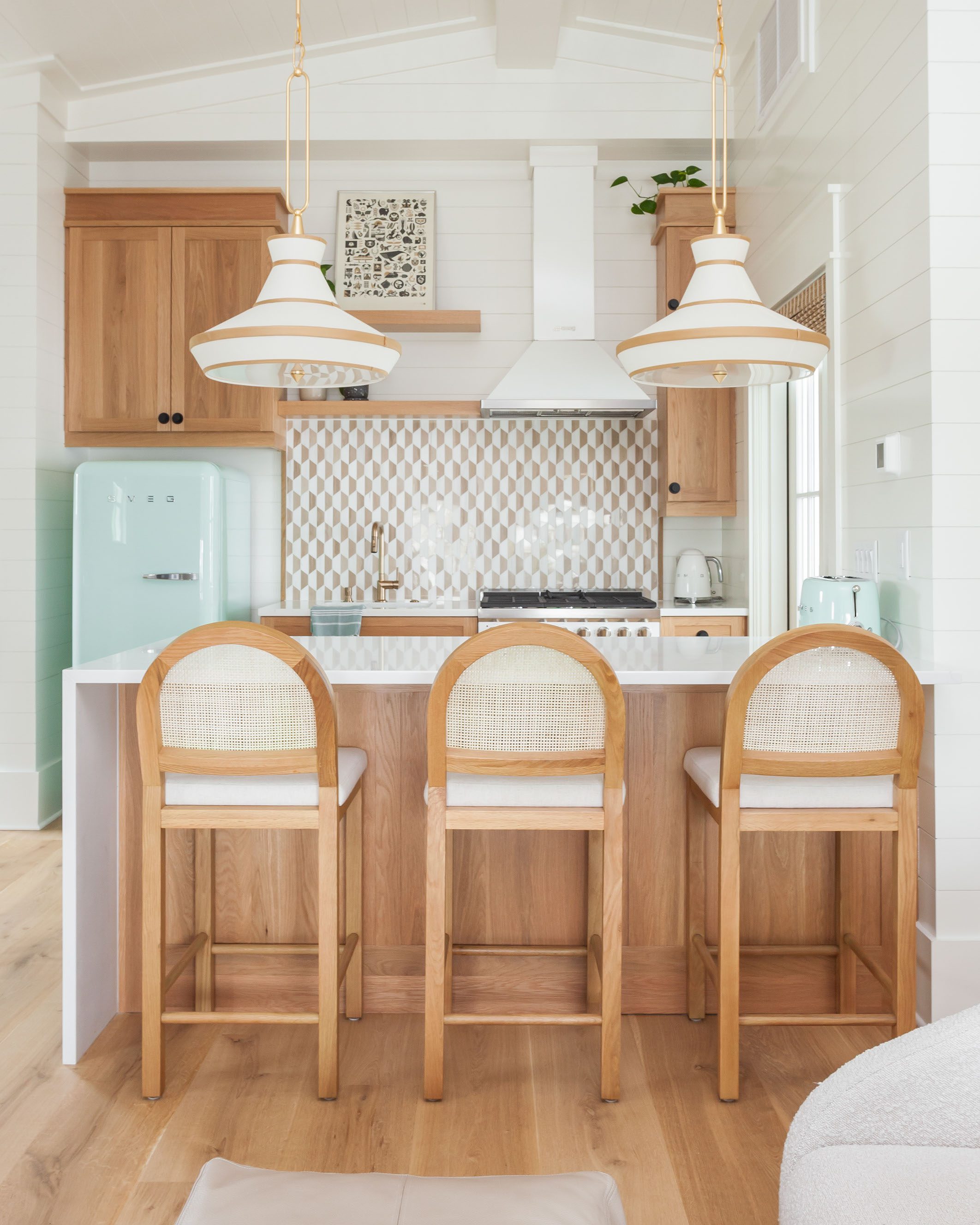 Shay describes the home’s design intention as layered and livable. Traditional bones anchor the house, while coastal notes, playful patterns, and a hint of retro keep the mood fresh and inviting. Color is purposeful rather than loud, surfacing in unexpected moments that tie spaces together without repeating them. Texture carries equal weight. Natural fibers, tailored upholstery, and tactile wallcoverings add depth and warmth.