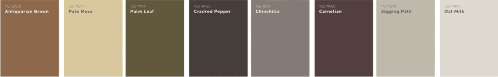 Balancing is key, no matter the look. The ‘70s Boho palette captures the nostalgic, cozy charm of the era, but it’s the careful mix of colors that keeps things harmonious. The rich tones of Palm Leaf and Antiquarian Brown (SW 0045) add a bold punch, while Jogging Path (SW 7638) as a backdrop ensures everything stays unified and balanced.