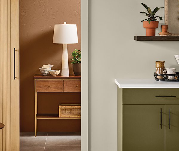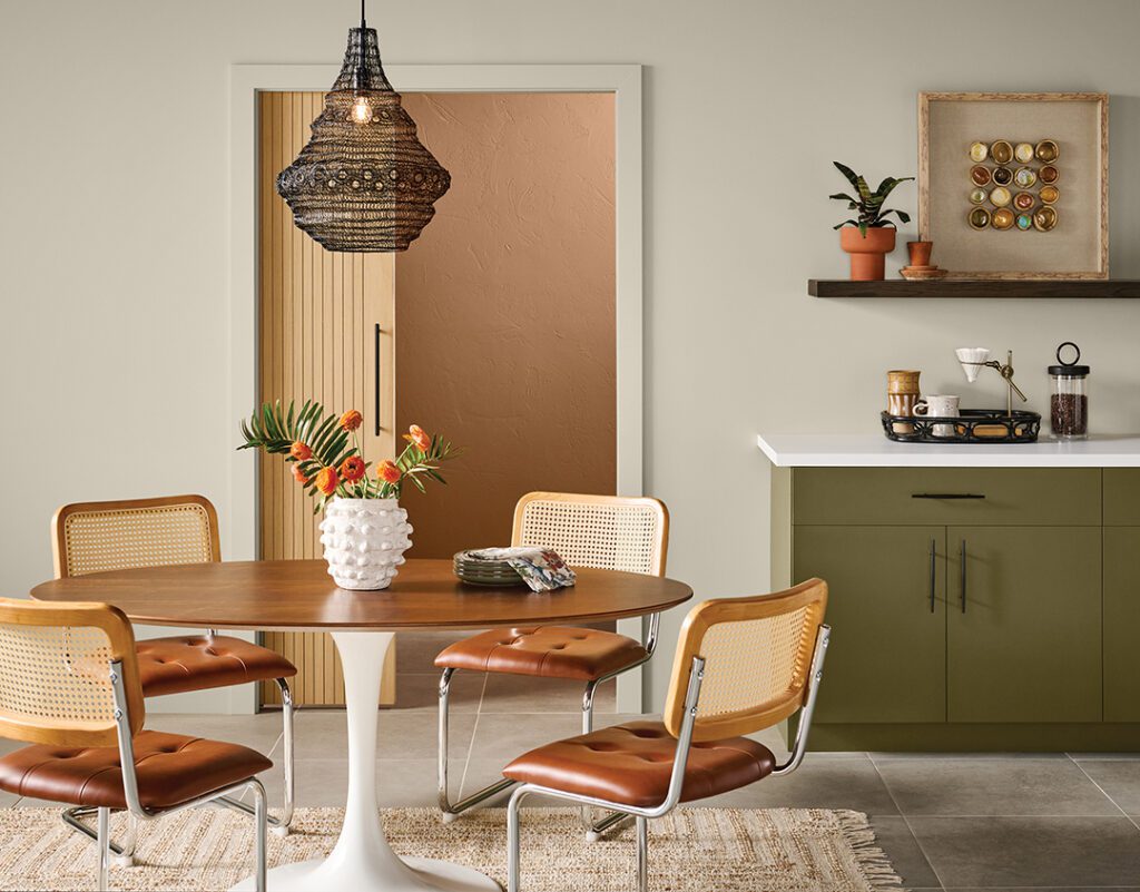 Palm Leaf seamlessly connects the past and present, bringing a contemporary touch to a classic look. Whether as the star of the show or a standout supporting player, it shines. Paired with Oat Milk’s (SW 9501) light, neutral tone, which sets a crisp stage for retro vibes, our Color of the Month adds depth, definition, and contrast.