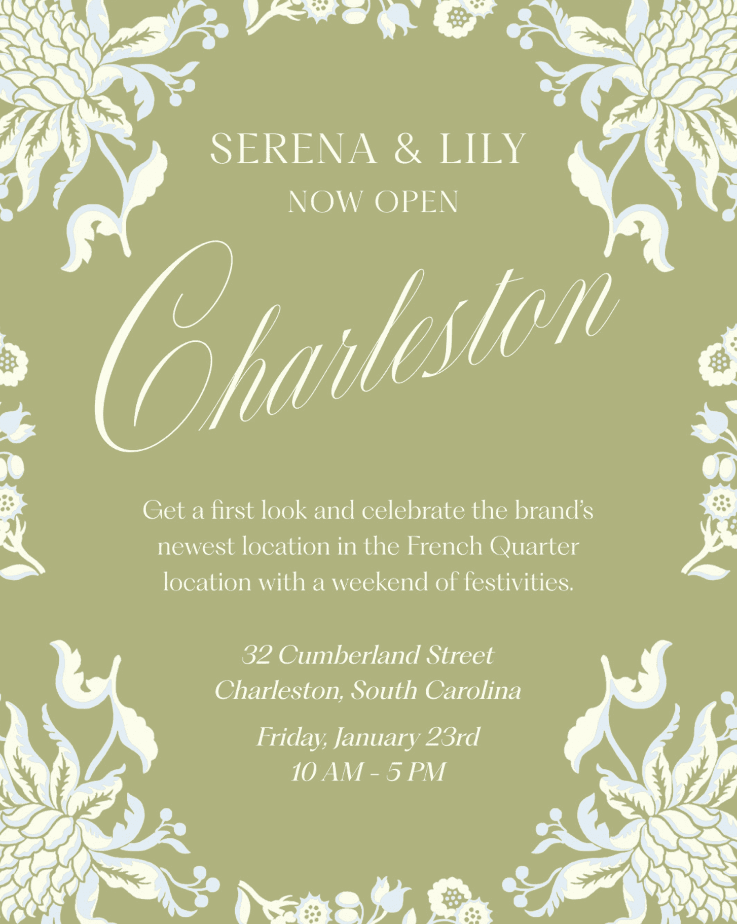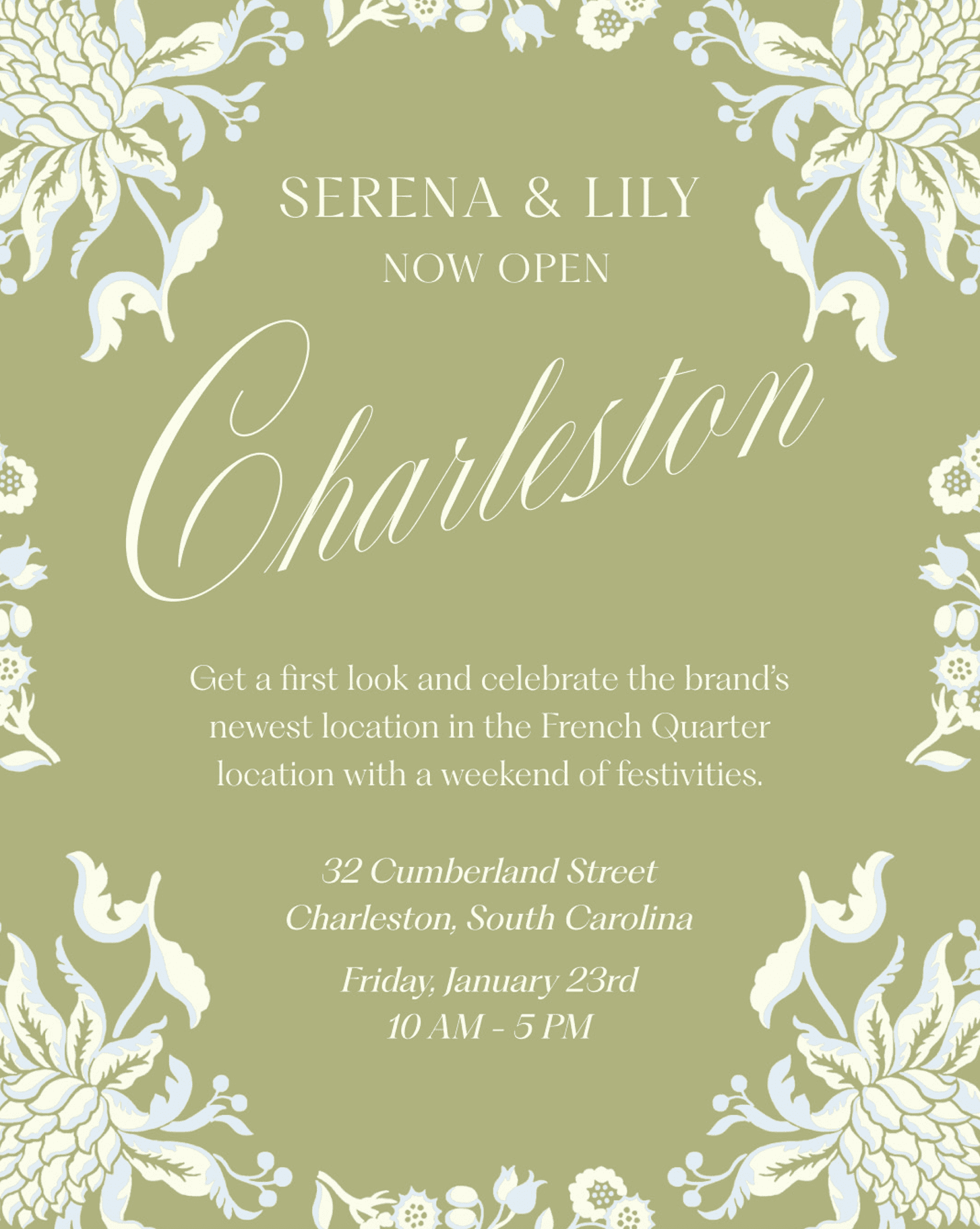 The official opening will kick off with a ribbon-cutting on 1/23 at 10 AM. Representatives from Serena & Lily will be in attendance, followed by a raw bar, live music, and light bites for all, plus Penelope Bourbon cocktails for adults. Readers of Charleston Home + Design are encouraged to attend!