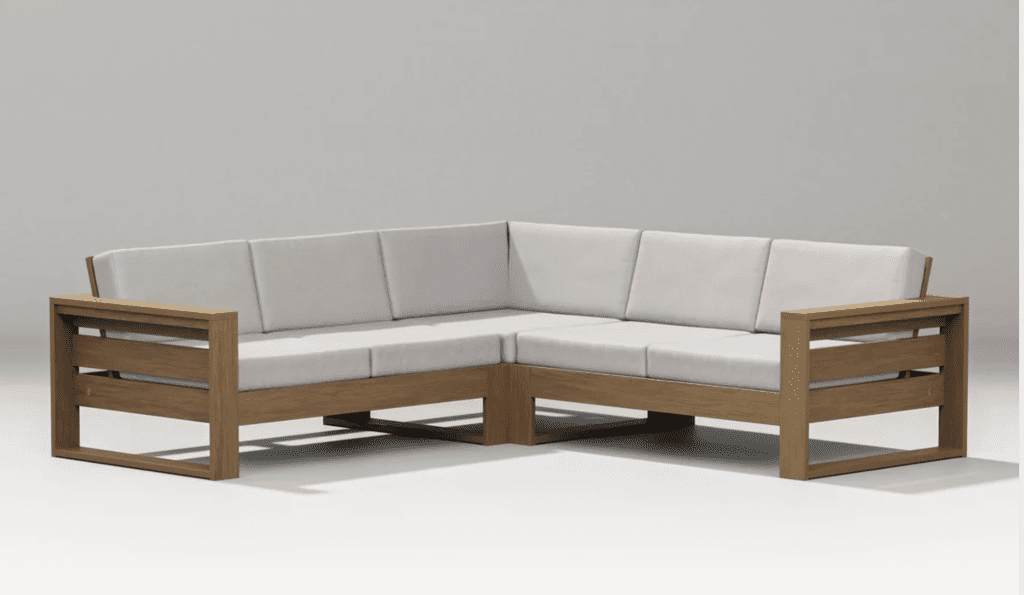 “Modern comfort meets eco-conscious design. This transitional-style sectional features deep seating cushions for ultimate lounging and is made from 100% recycled plastic — sustainable and stylish. Revolution® outdoor fabrics offer unmatched durability and easy cleaning, while a range of frame and fabric colors allows you to customize it to your style. Comfort. Durability. Design that feels good — in every way.”