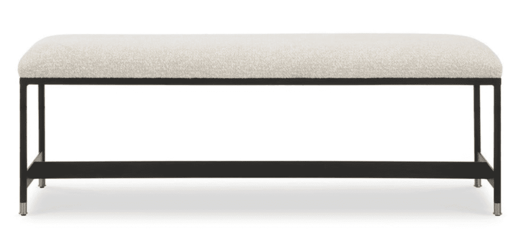 “I’m obsessed with this bench. The matte black frame keeps it sleek and minimal, while the off-white textured seat adds just the right amount of cozy. And those tiny brushed brass feet? Chef’s kiss. It’s the piece that works at the foot of your bed, in an entryway, or anywhere you want to add a little style without trying too hard.”