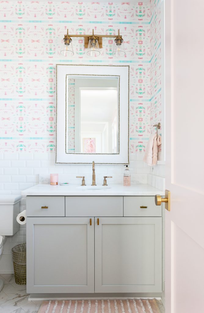 The pink is continued in the little girl’s bathroom; this time accented with gold fixtures and a beautiful wallpaper with turquoise. This bathroom will be stylish and functional as the little girl grows up.