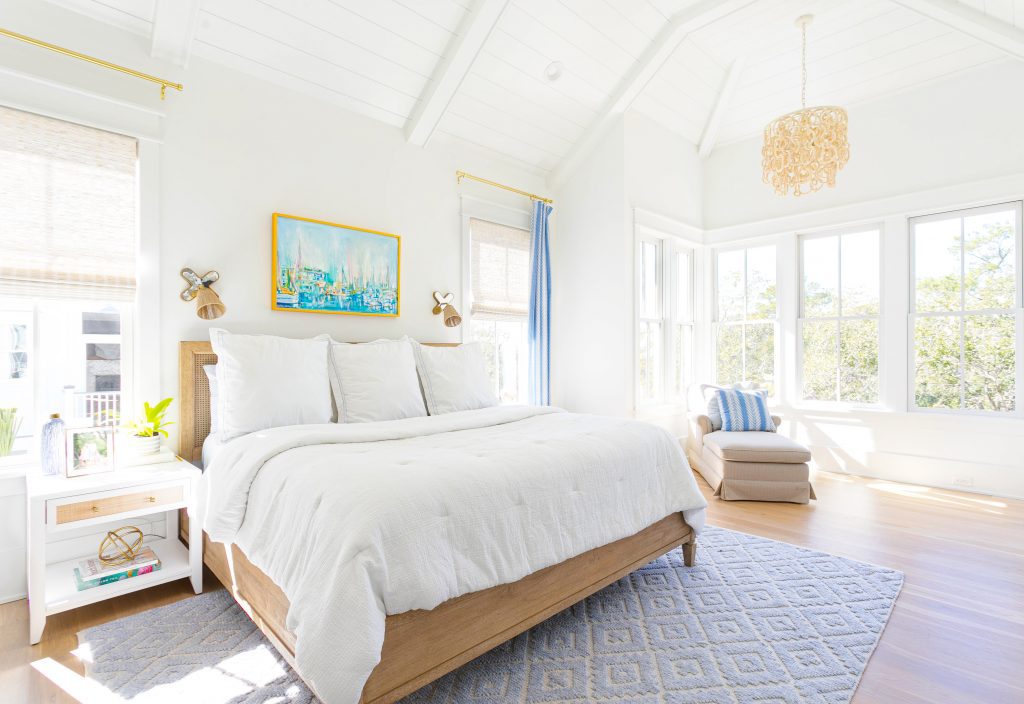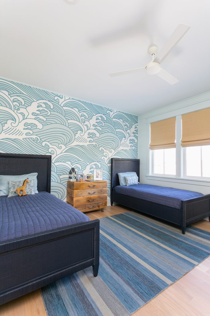 This boy’s bedroom is perfect for a Lowcountry home; paying homage to our beach town with woven shades, navy rattan beds, and wave wallpaper. As with the girl’s room, this is a space the boys’ can grow into. The design choices won’t be too childish as they get older.