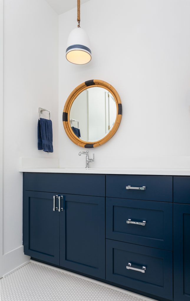 Again, playing off the beachy theme of the bedroom, the boy’s ensuite is finished in a navy hue and simple penny tile flooring. A rattan mirror and rope pendant give the space a nautical feel.