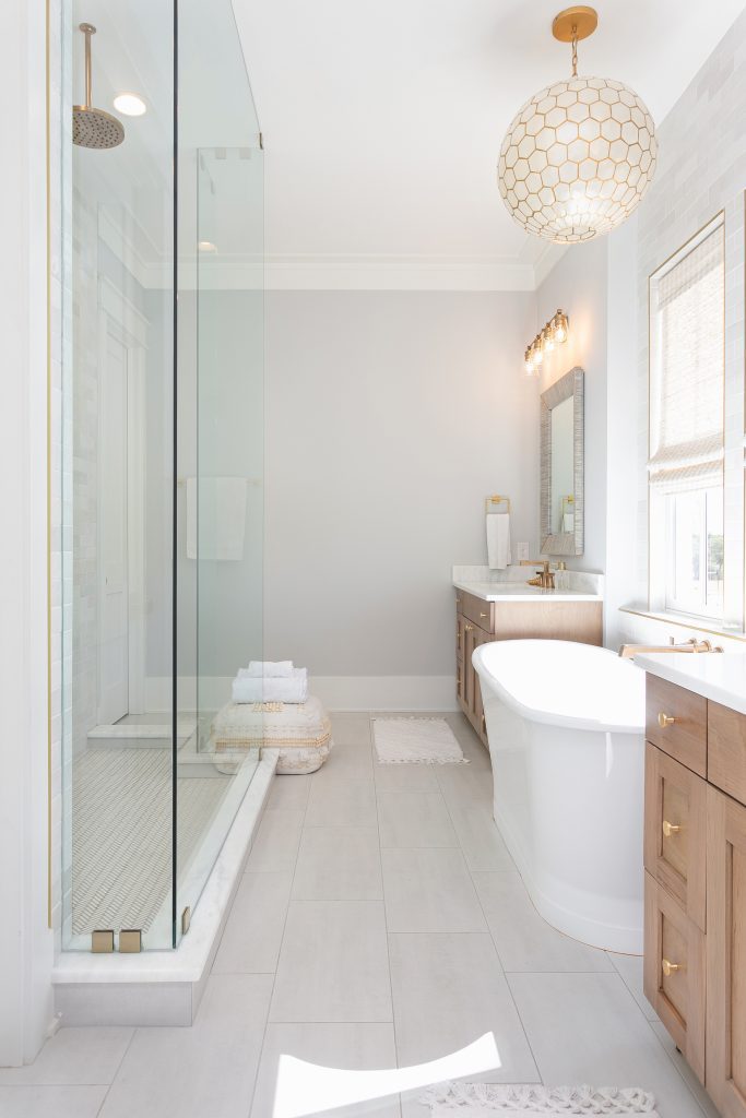 The master bathroom is another serene space outfitted with a soaking tub, walk-in shower, and double vanities so mom and dad each have their own spaces to get ready in the morning.