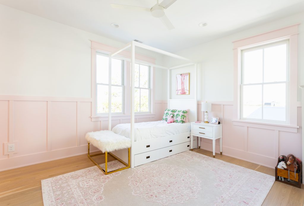 This pink-themed room is what little girls dream of. The wainscoting is painted in a pastel pink and the rug and artwork coordinate. A white faux fur bench and fun pink and green pillows on the bed add some texture.