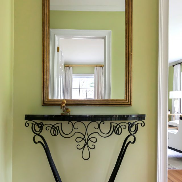 As guests enter Monica’s home, they are transported into an era of chic modernism filled with subtle, calming colors of light green, soft purple, white, and a splash of invigorating orange. “I adore Art Deco,” Monica proclaims. “It’s the best of everything—clean lines, modern furniture, beautiful colors, and a touch of minimalism.” Miriam Ricks, Monica’s interior designer and good friend, had a hand in everything from larger scale details like the fireplace surround to the smaller, yet impactful table in the entryway. “Because I love Art Deco so much, Miriam really came in handy,” she laughs. “We commissioned Mike Weeks, a local iron-and-metal craftsman, to replicate the entry table from a vintage French piece.” The chairs in the living room were also custom designed from a picture that Monica showed Miriam, who then had them fabricated to just the right size. According to Miriam’s expertise, successful interior design is more about proportions than anything else. So a vast mirror was placed over the hall table and slightly lower-back chairs adorn the living room and flank the modern couch.