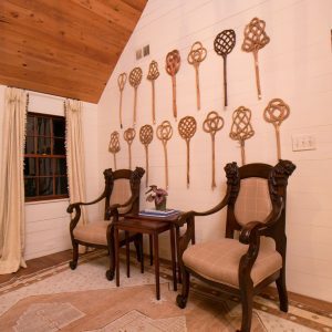 I have contemporary pieces like Douglass Balantine’s in the Music Room and the master bathroom, but I think the original Huttys and French artist, Alex Amyé are my favorites. They are so evocative of life and travel and adventure. Plus Alfred Hutty used to live right up Tradd Street. We have two Ridleys as well, which are hunting scenes, and I’m not huge into hunting art, but these paintings are special. The old colonial flag over the fireplace is perfect for the Cypress Room, too, because it harkens back to the time period when the house was new and its first inhabitants were living in pre-Revolutionary (and therefore) dangerous times. That kind of history fascinates me—it’s so remarkable to discover who the people were and how they lived in this very place where we’re sitting.