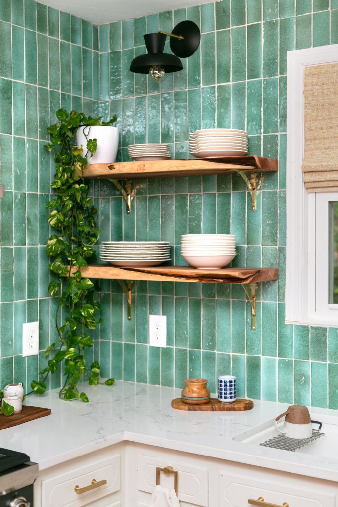 Don’t be afraid to make a statement in your kitchen. Our winter 2019 cover Chelsea Meissner went bold and beautiful for her surfer chic home with an aqua subway tile and exposed shelving.
