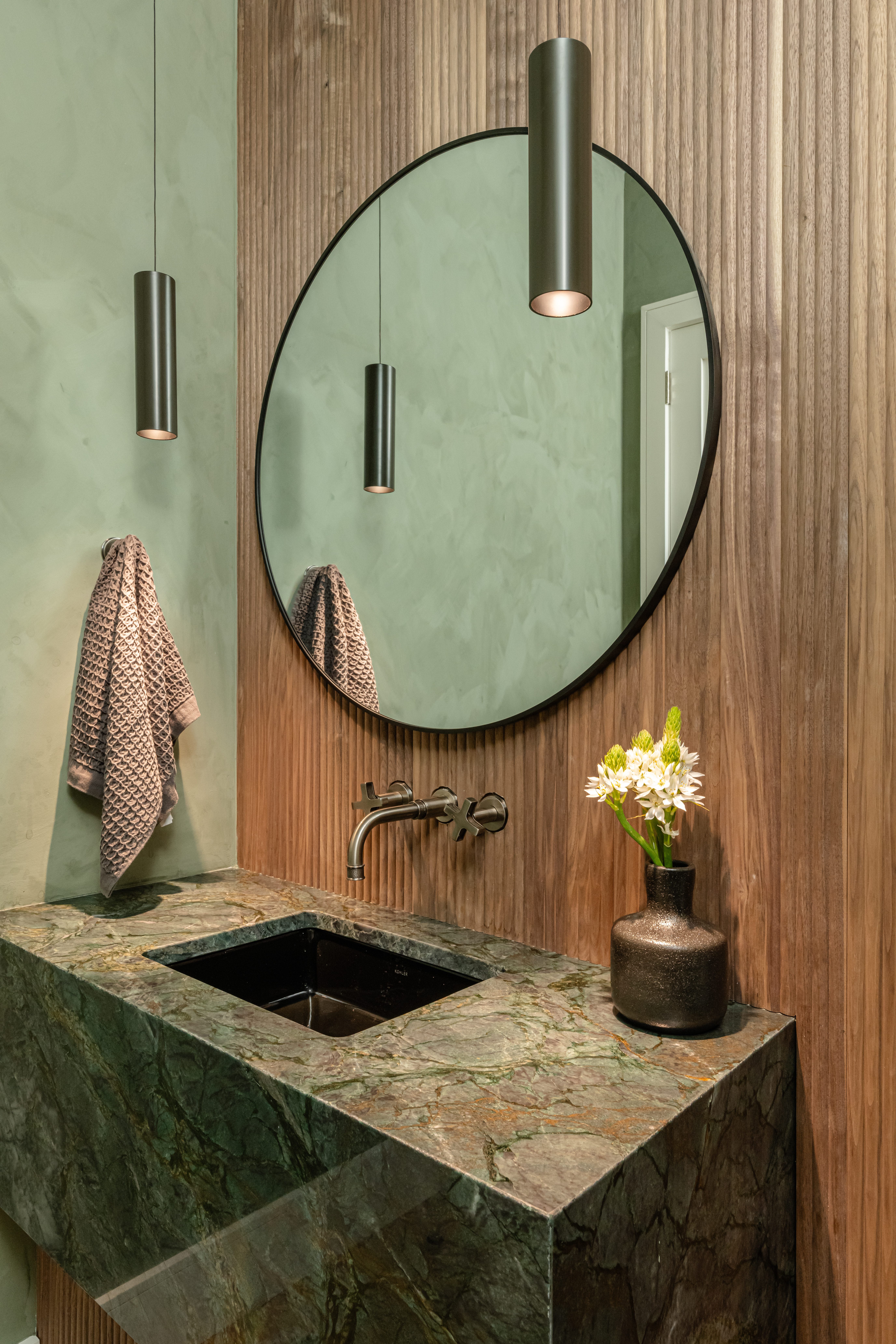 In the powder room, a floating vanity illusion is achieved with 3cm Sambori Polished Quartzite, fabricated to appear as a monolithic block. The fireplace surround features 12mm Navona LappatoPorcelain, a lightweight, heat-resistant surface selected for its travertine-like movement and ability to create a refined, low-profile installation.