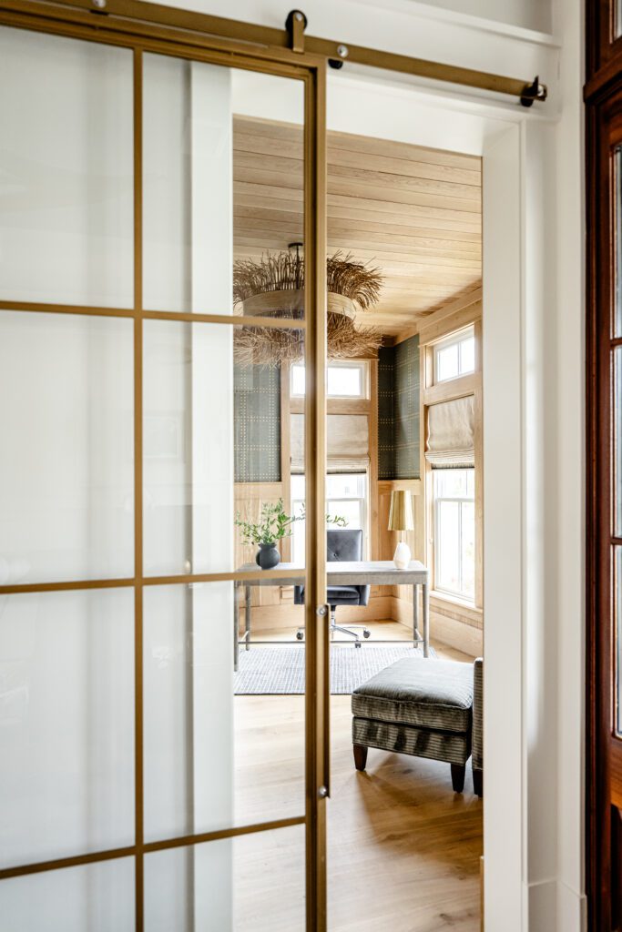 A stunning sliding glass door marks the entrance to this cozy home office in style.