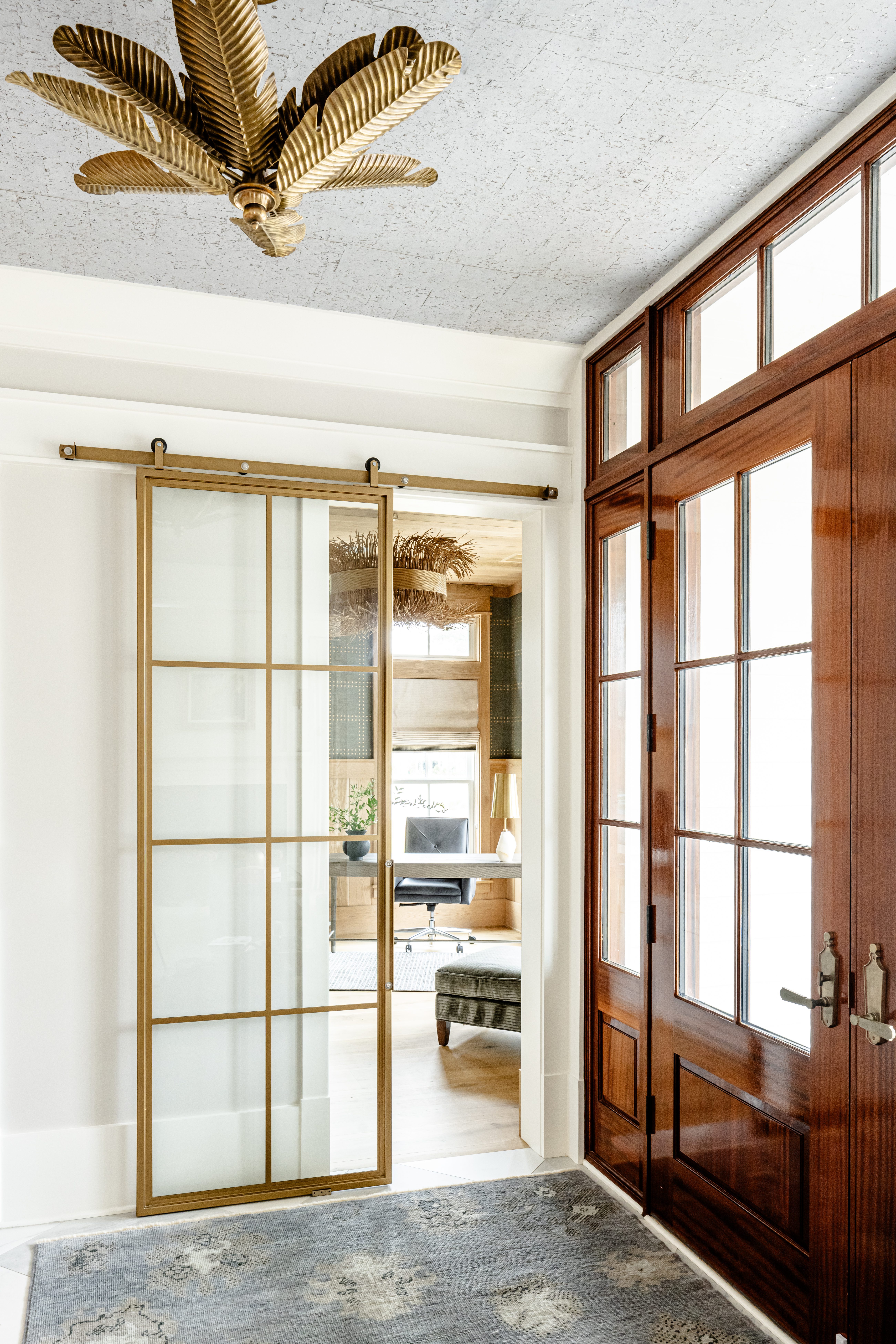 A stunning sliding glass door marks the entrance to this cozy home office in style.